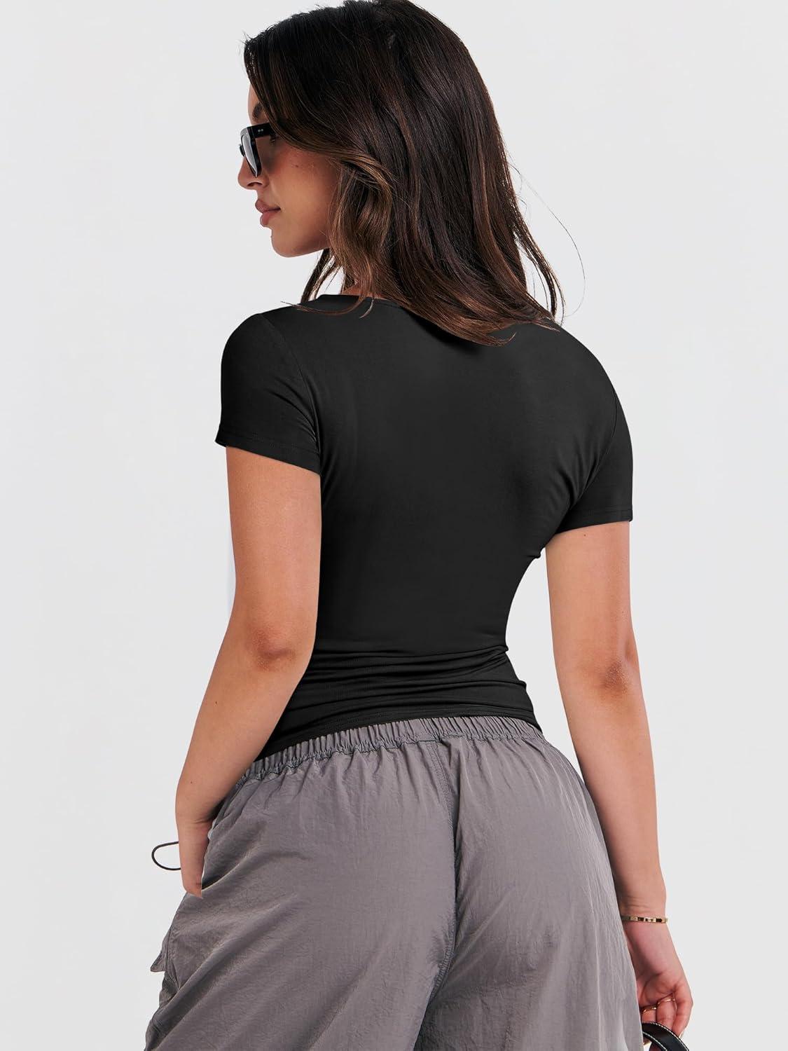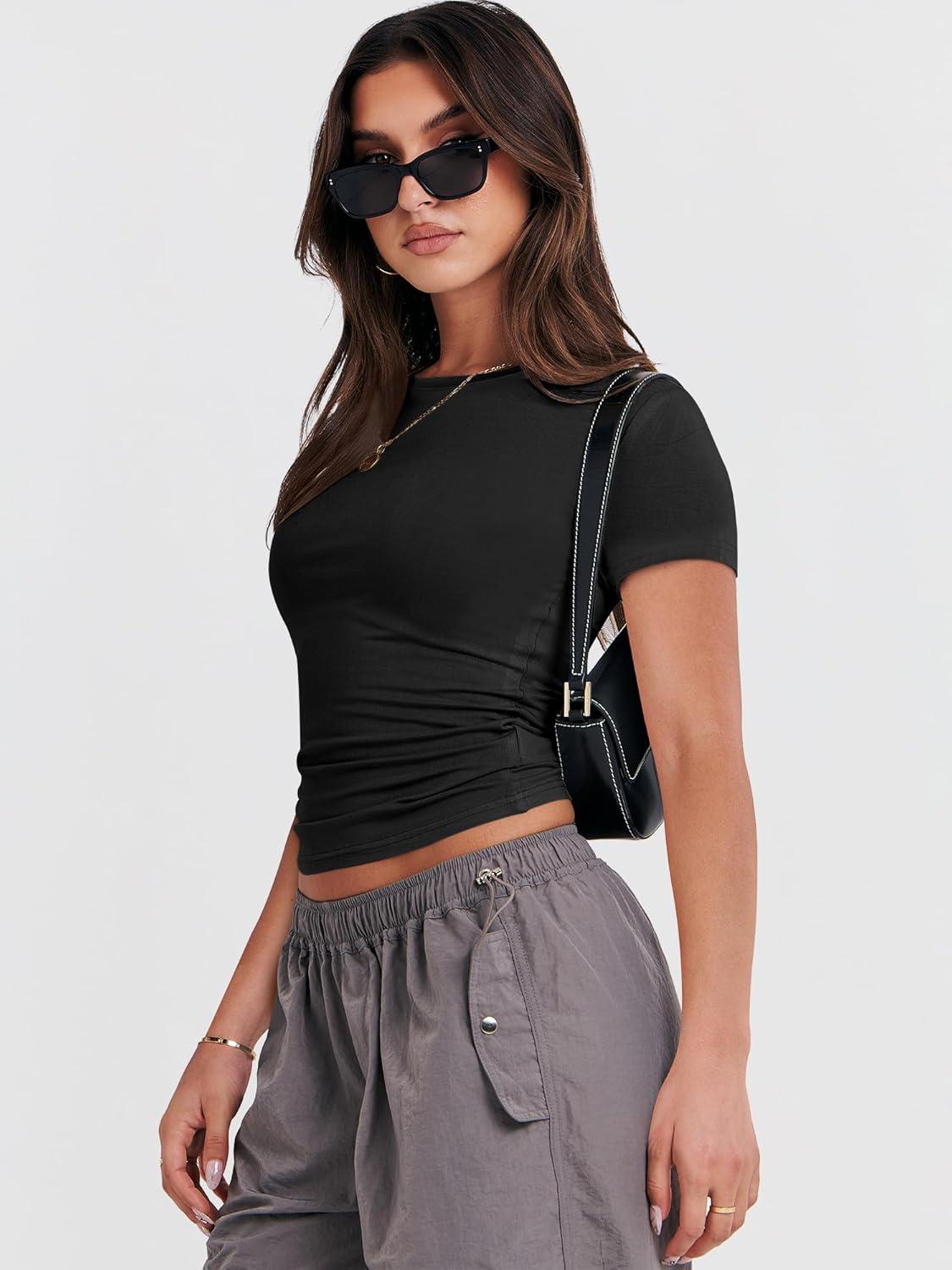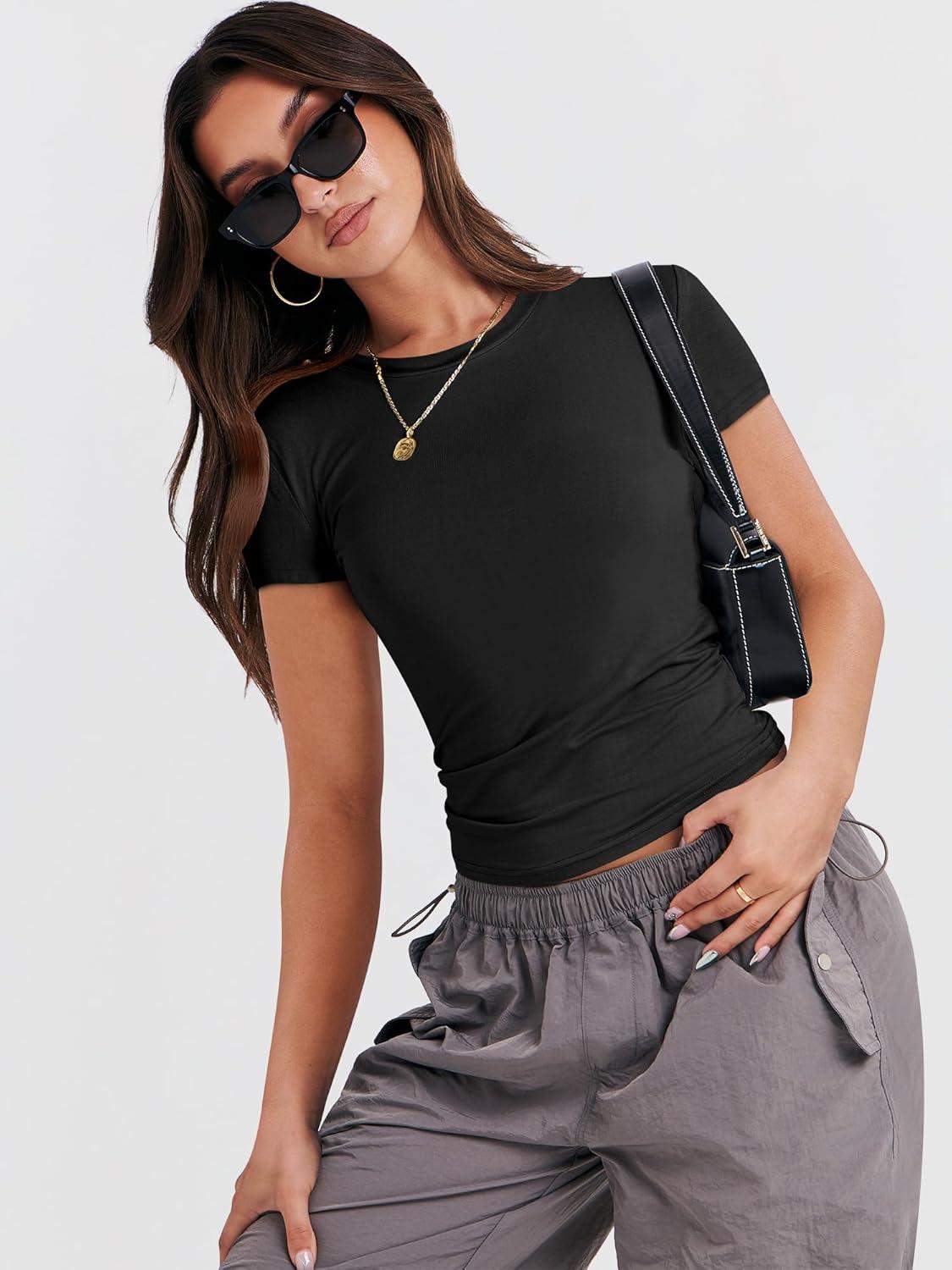 ANRABESS Women’s Short Sleeve Summer T Shirts Crew Neck Slim Fit Basic Tees 2026 Crop Tops Y2k Clothes Outfits(Black)