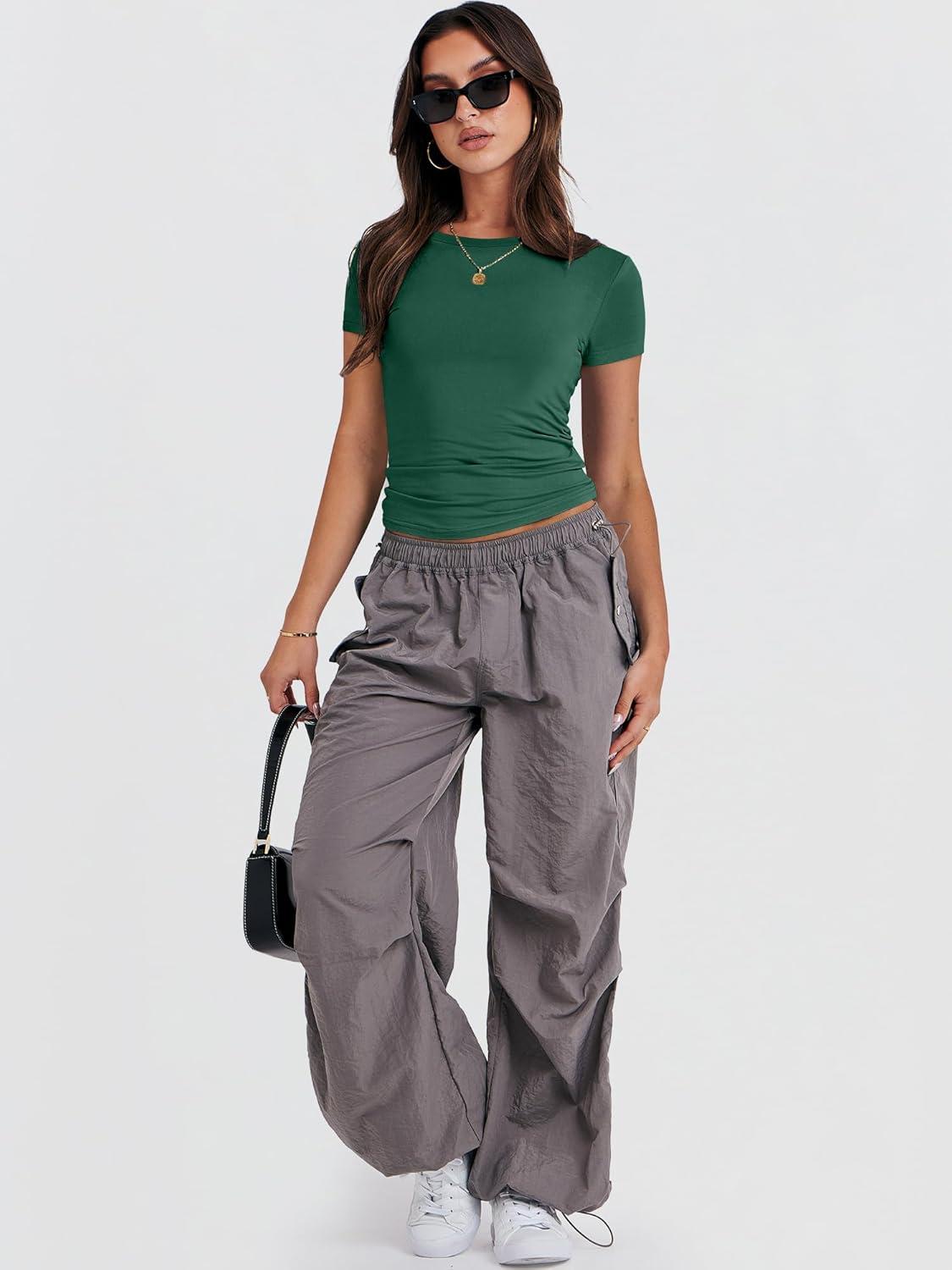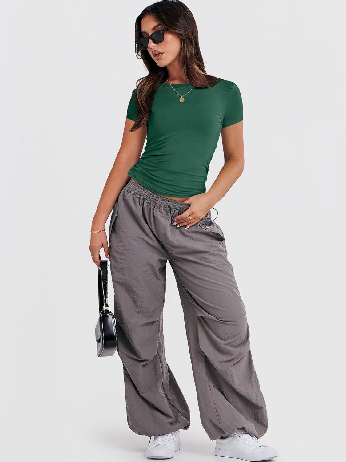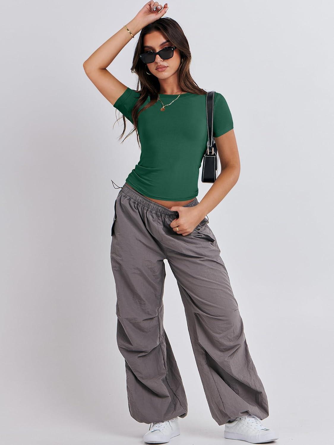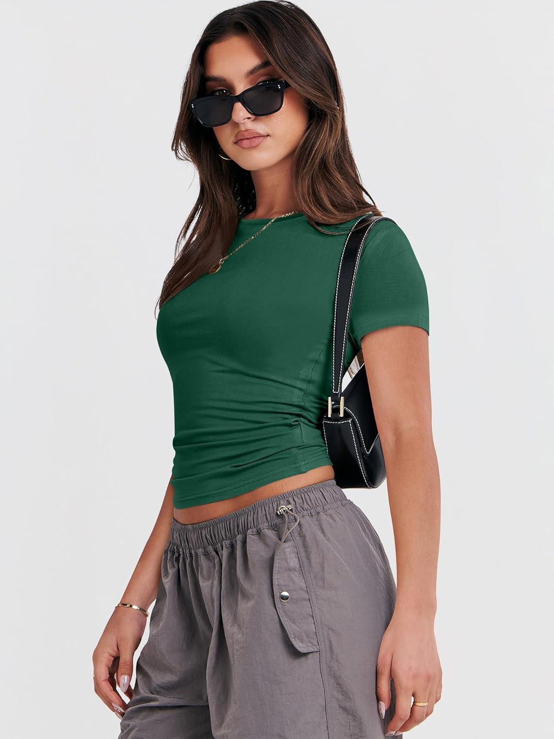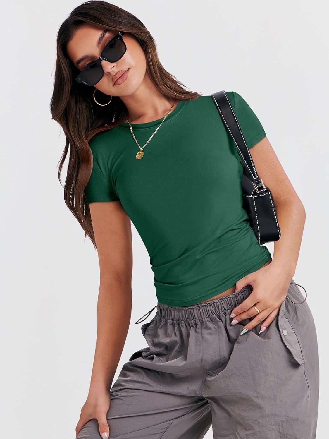 ANRABESS Women’s Short Sleeve Summer T Shirts Crew Neck Slim Fit Basic Tees 2026 Crop Tops Y2k Clothes Outfits(Forest)