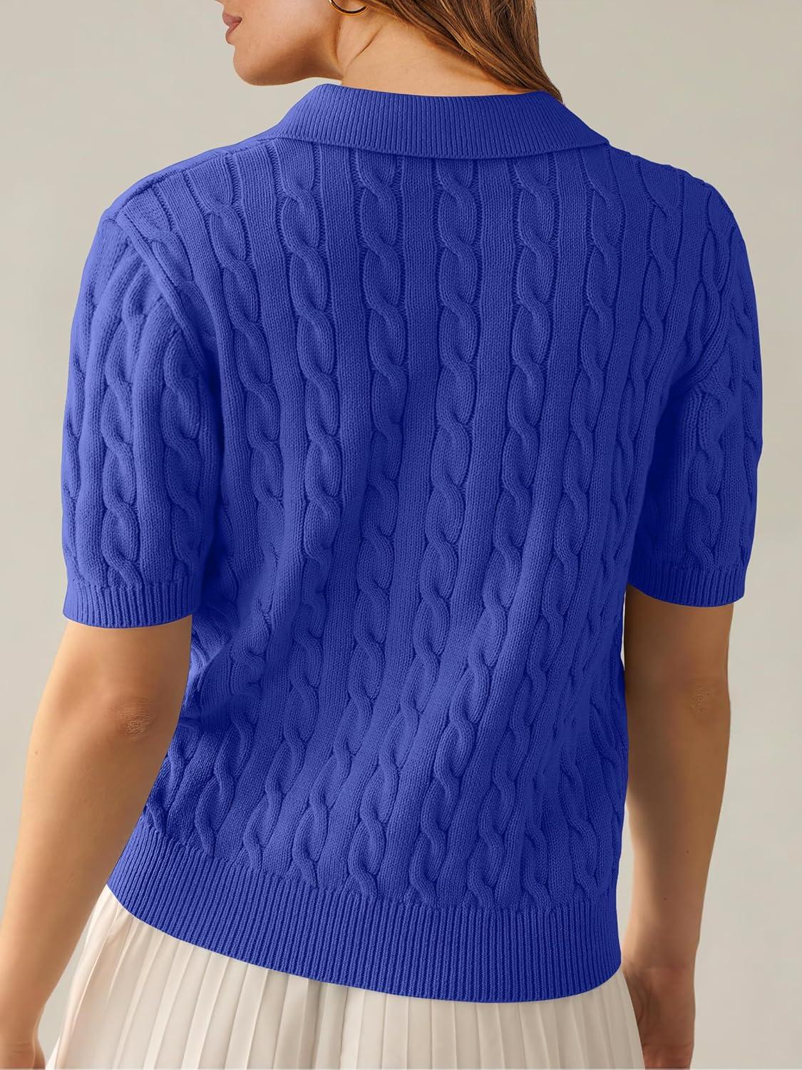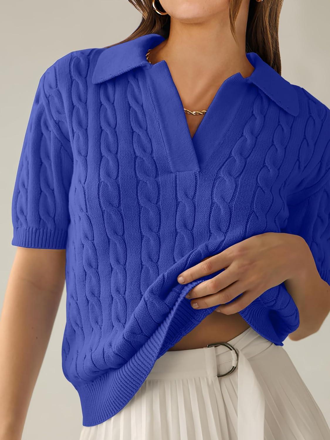 ANRABESS Women’s Short Sleeve Sweaters Tops Polo V Neck Cable Knit Casual Soft Pullover Shirts 2025 Summer Outfits(Sapphire Blue)