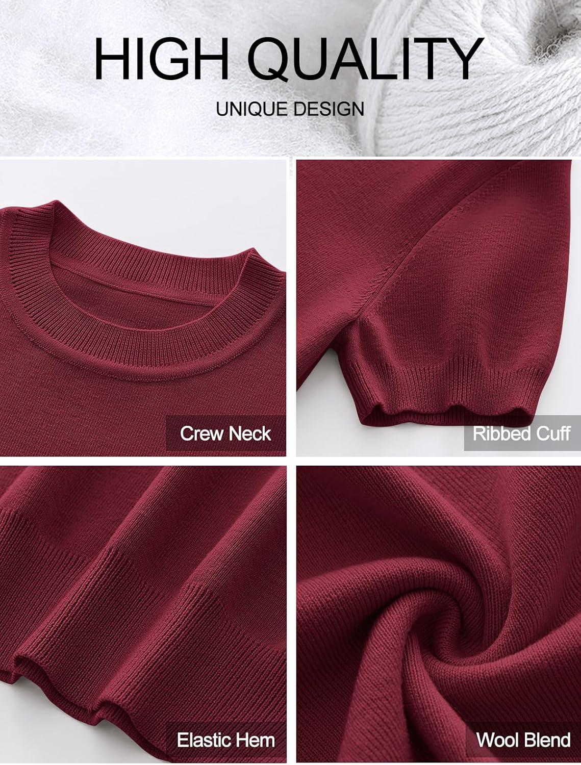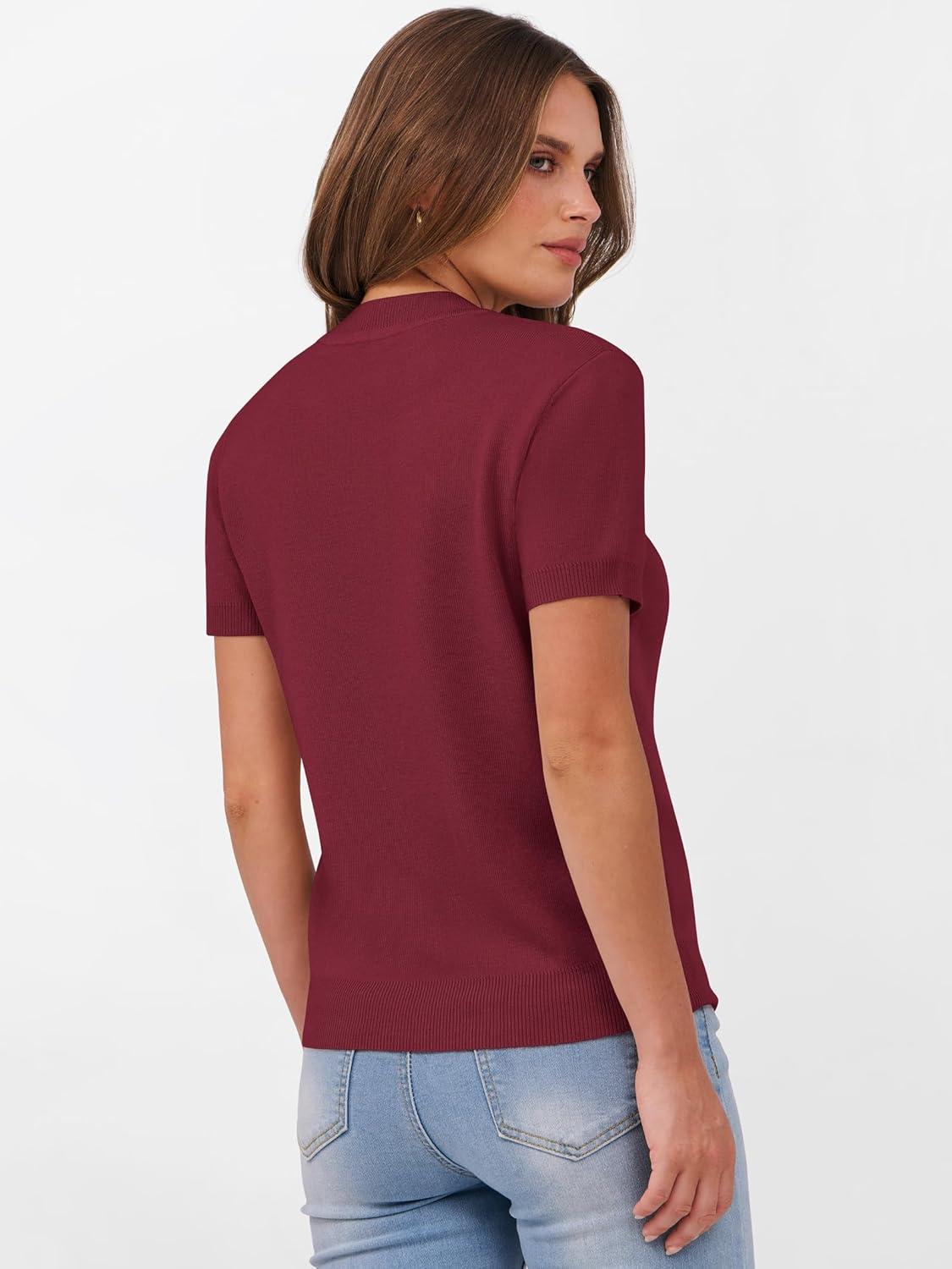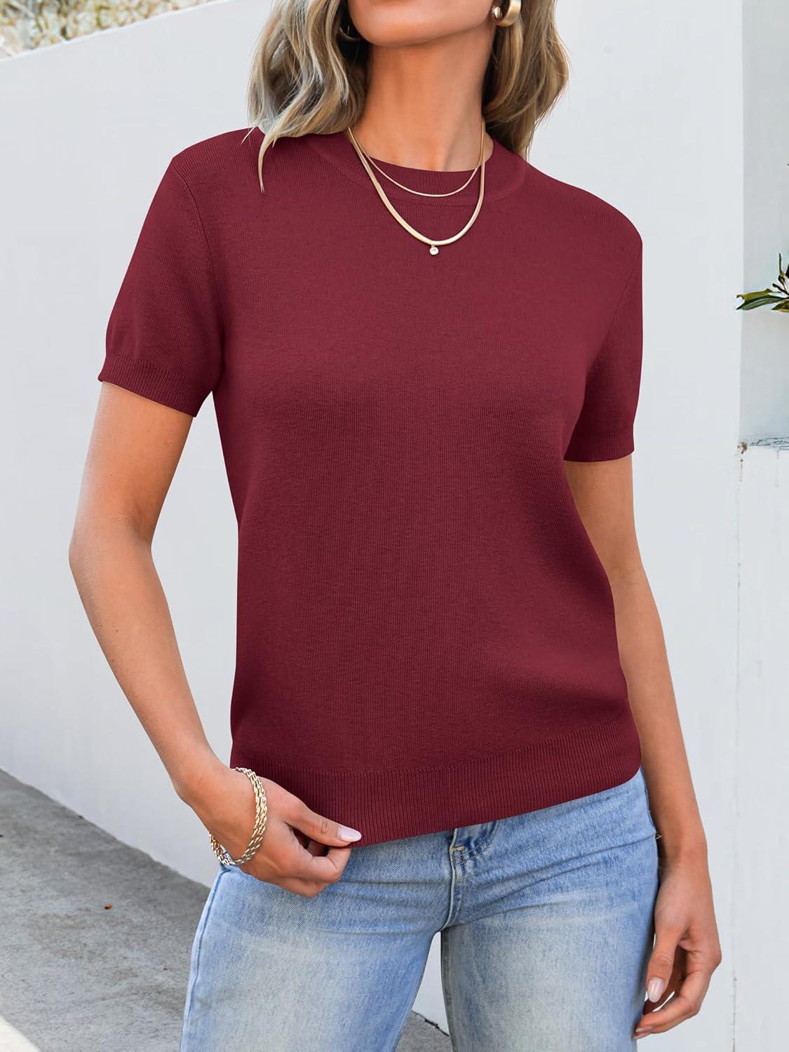 ANRABESS Womens Short Sleeve Sweaters Wool Blend Crew Neck Sweater Shirts Business Casual Work Tops 2025 Summer Outfits(Wine Red)