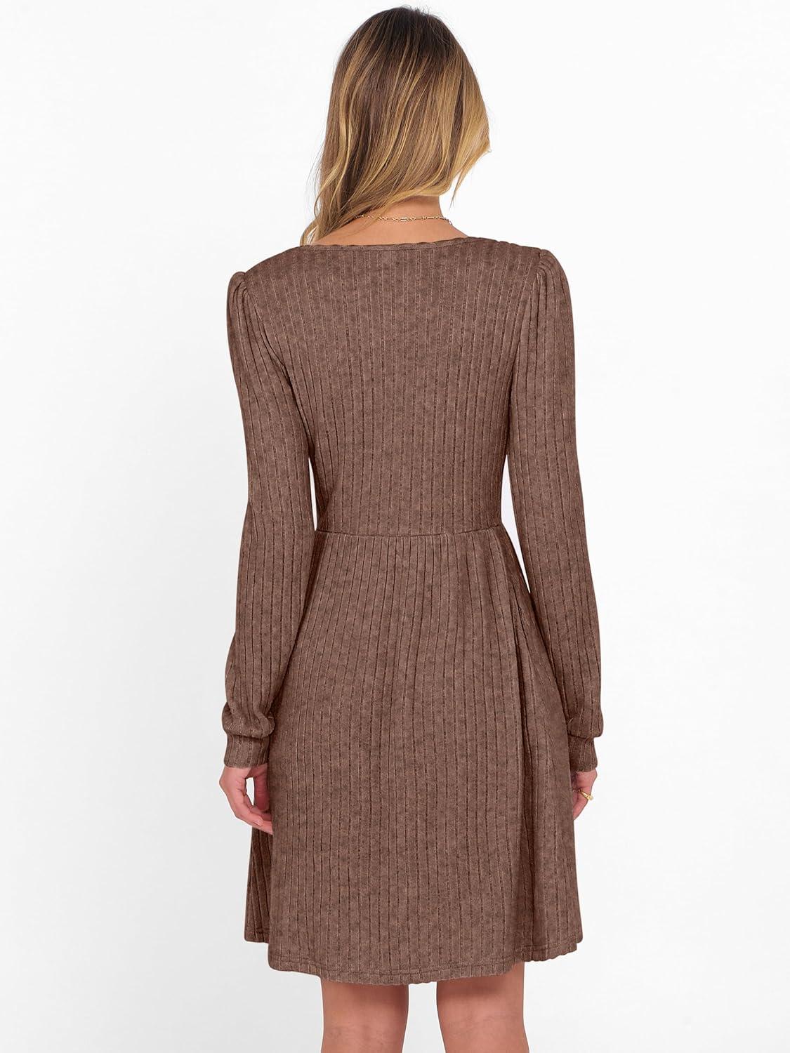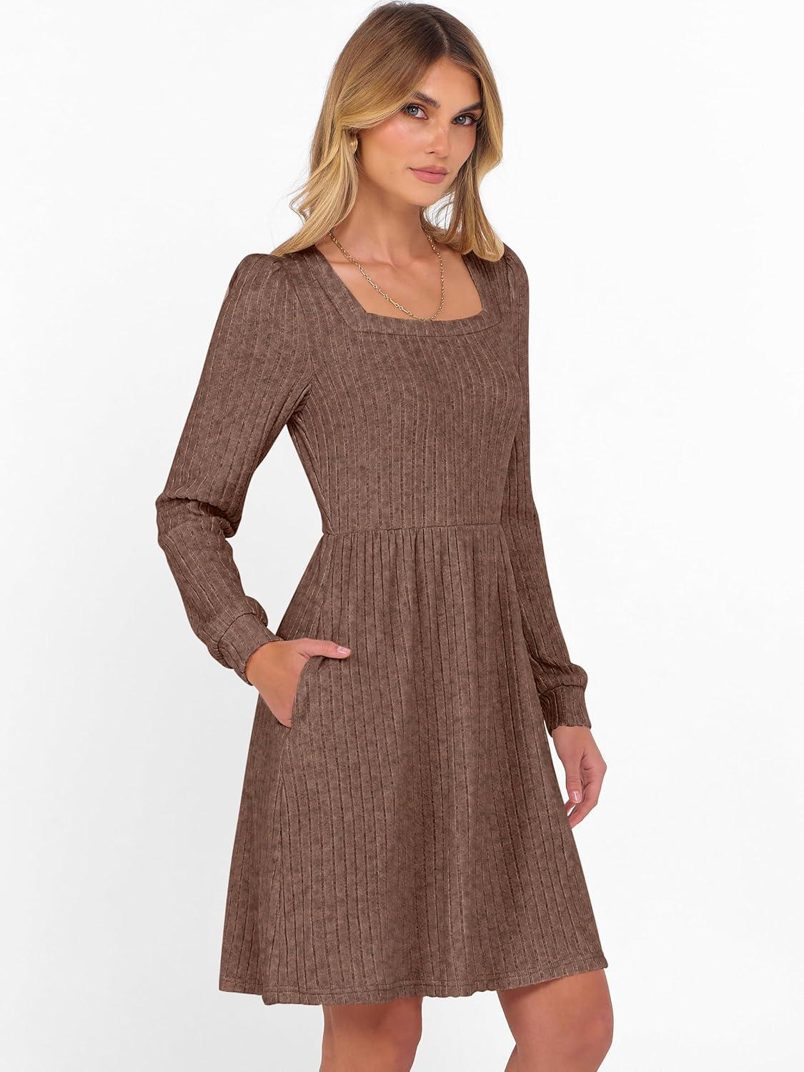 ANRABESS Women’s Square Neck Long Sleeve Fall Dress Casual Ribbed Knit Soft 2025 Trendy Short Sweater Dresses with Pockets(Brown)