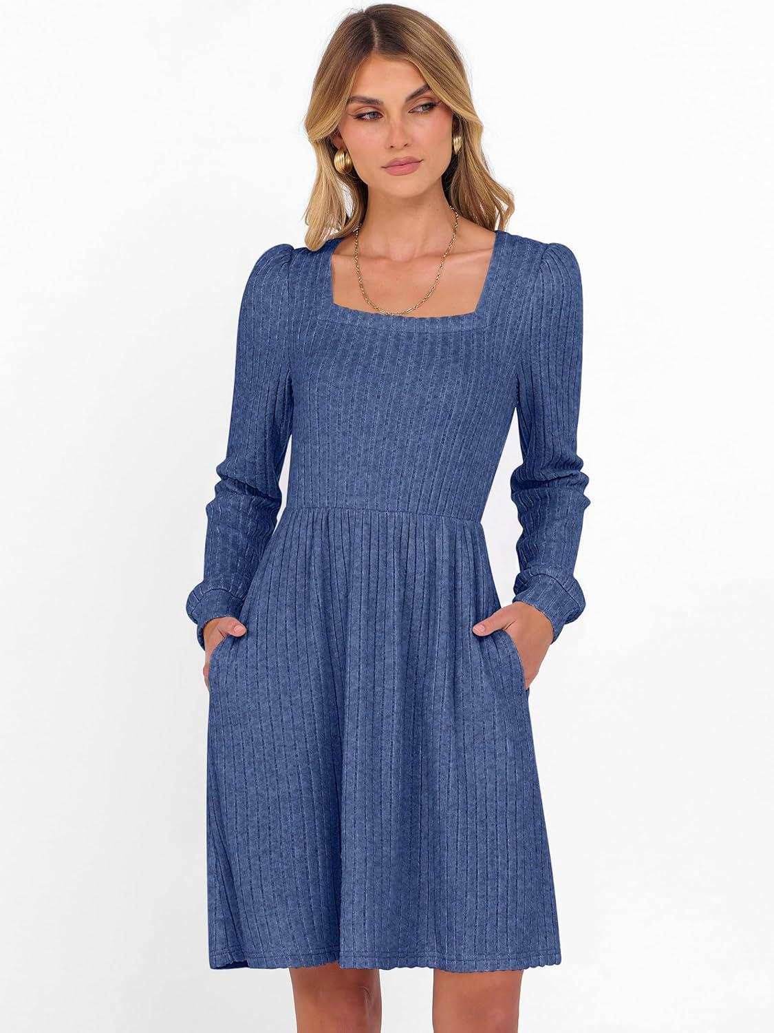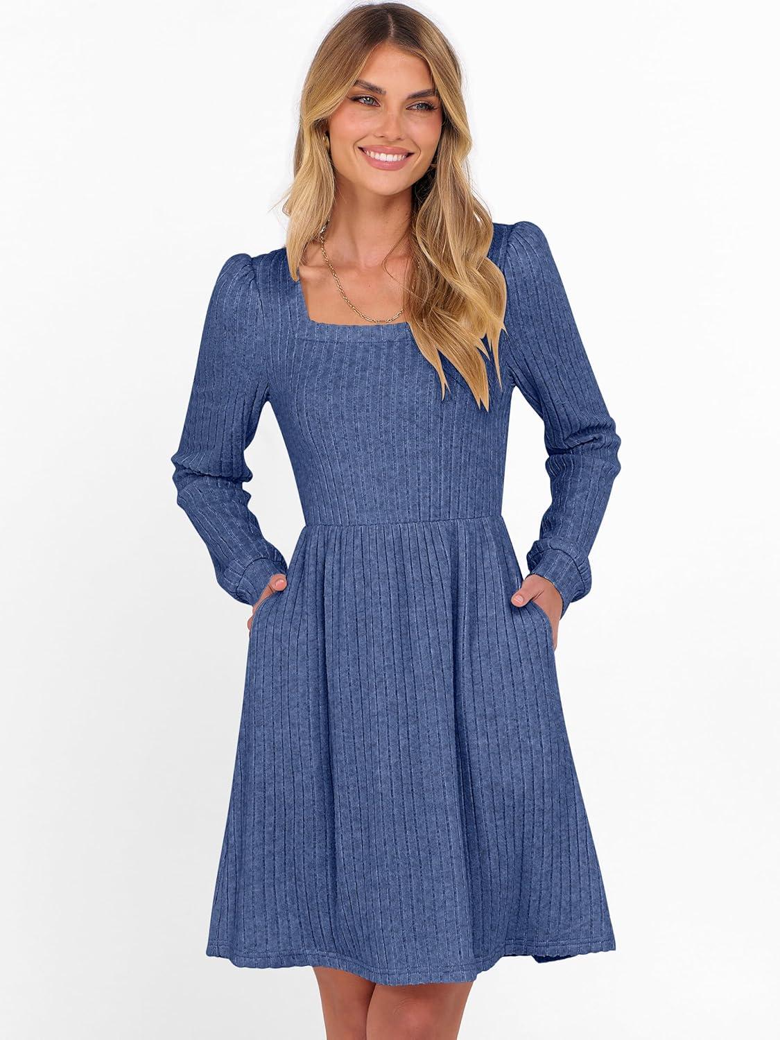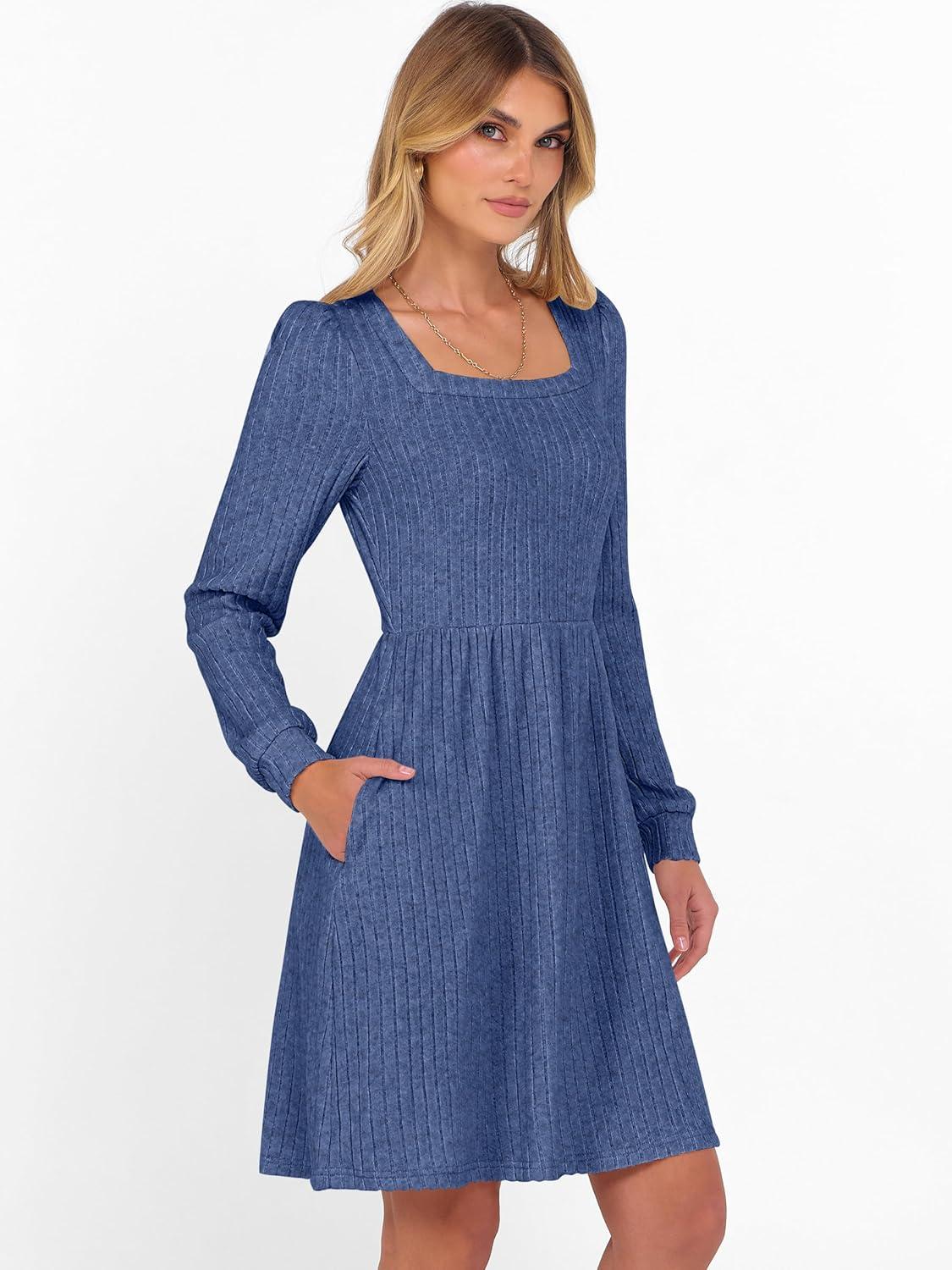 ANRABESS Women’s Square Neck Long Sleeve Fall Dress Casual Ribbed Knit Soft 2025 Trendy Short Sweater Dresses with Pockets(Dark Blue)
