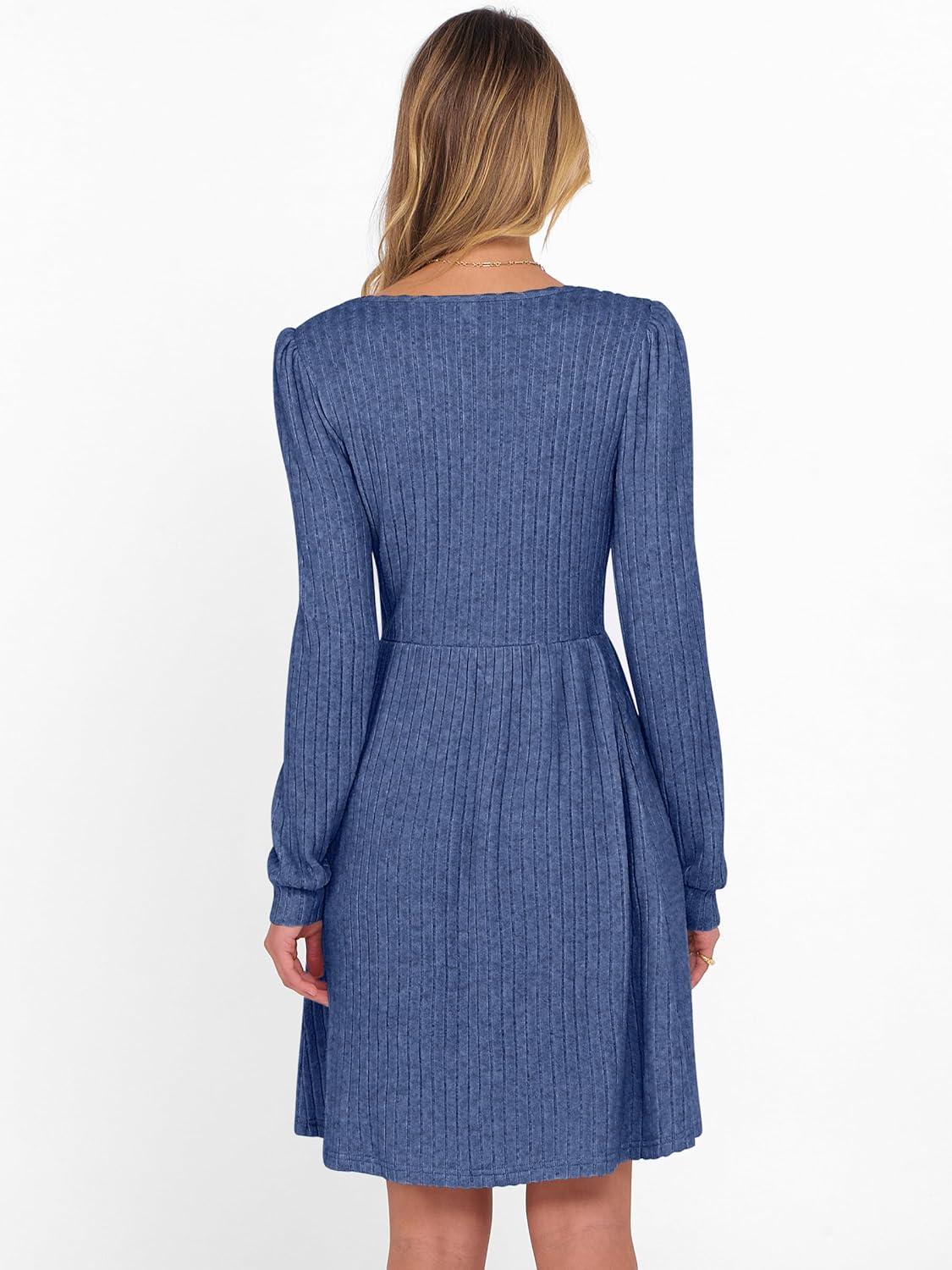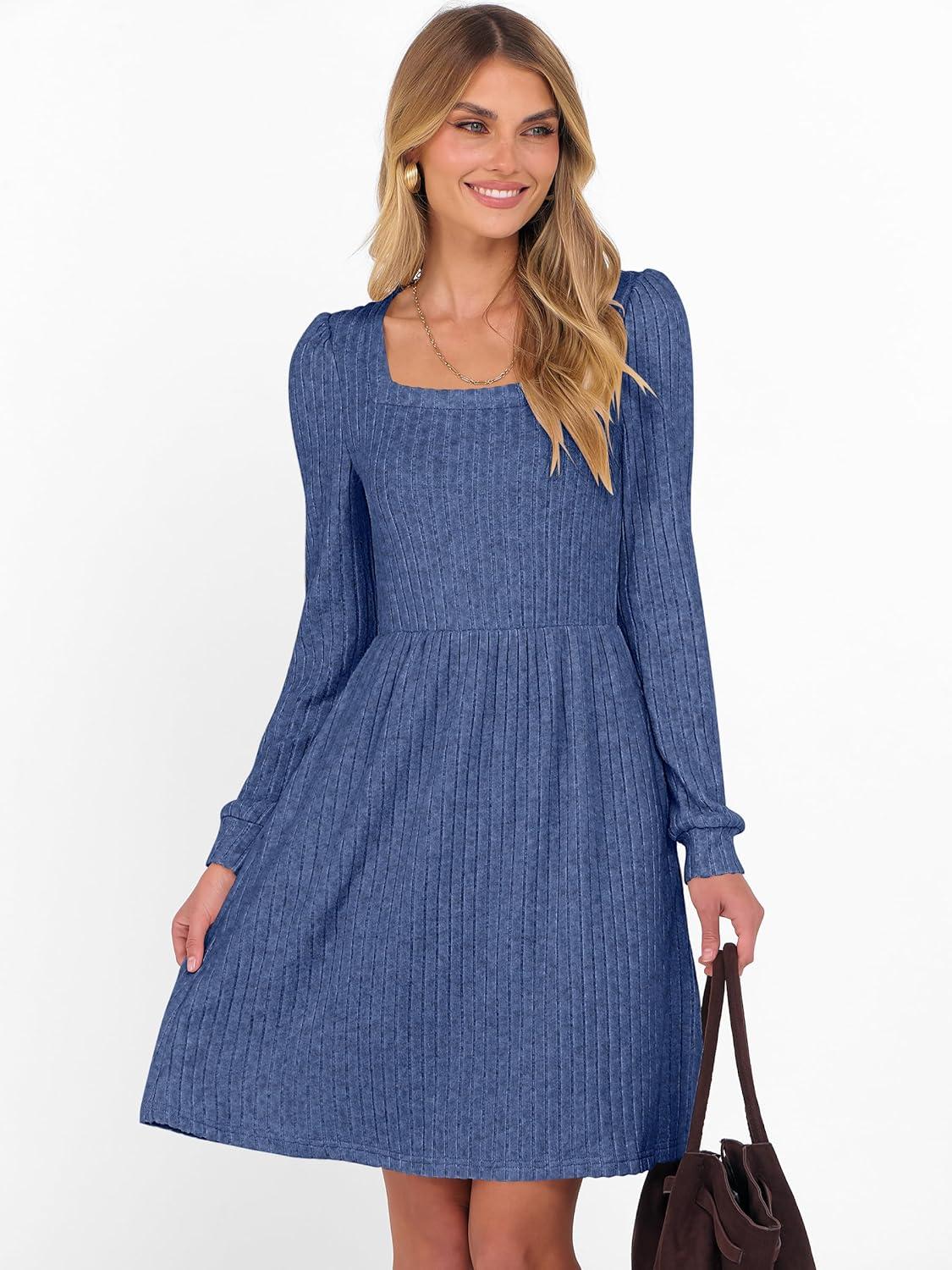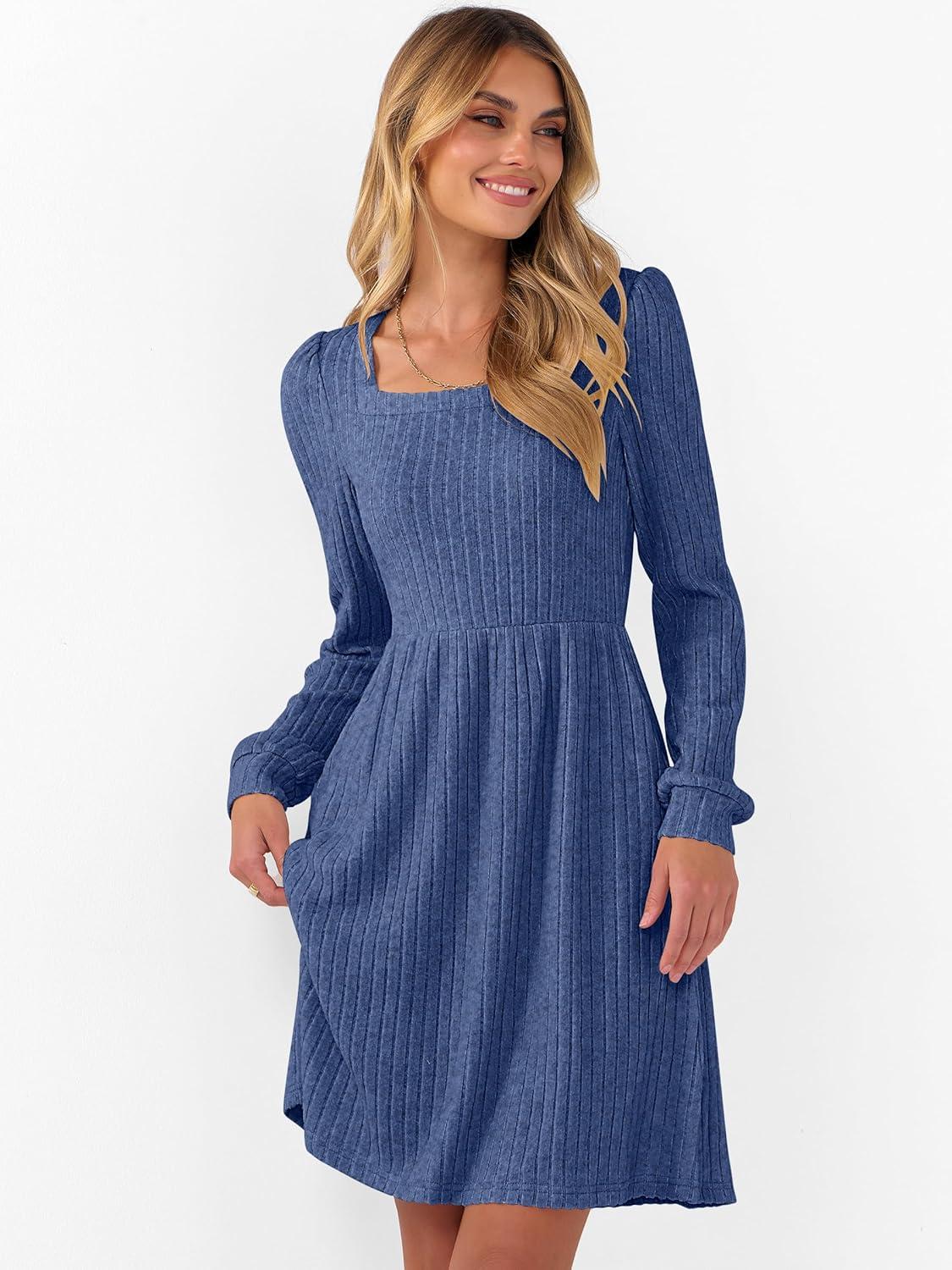 ANRABESS Women’s Square Neck Long Sleeve Fall Dress Casual Ribbed Knit Soft 2025 Trendy Short Sweater Dresses with Pockets(Dark Blue)