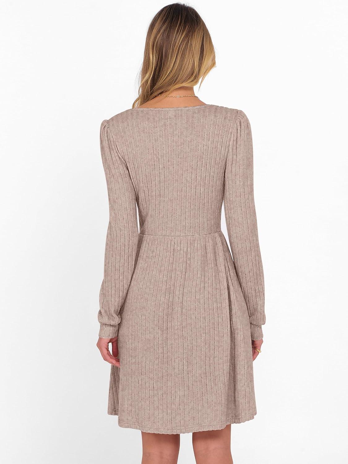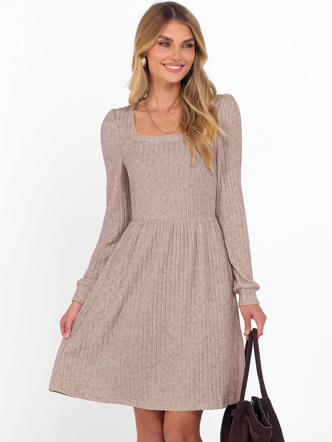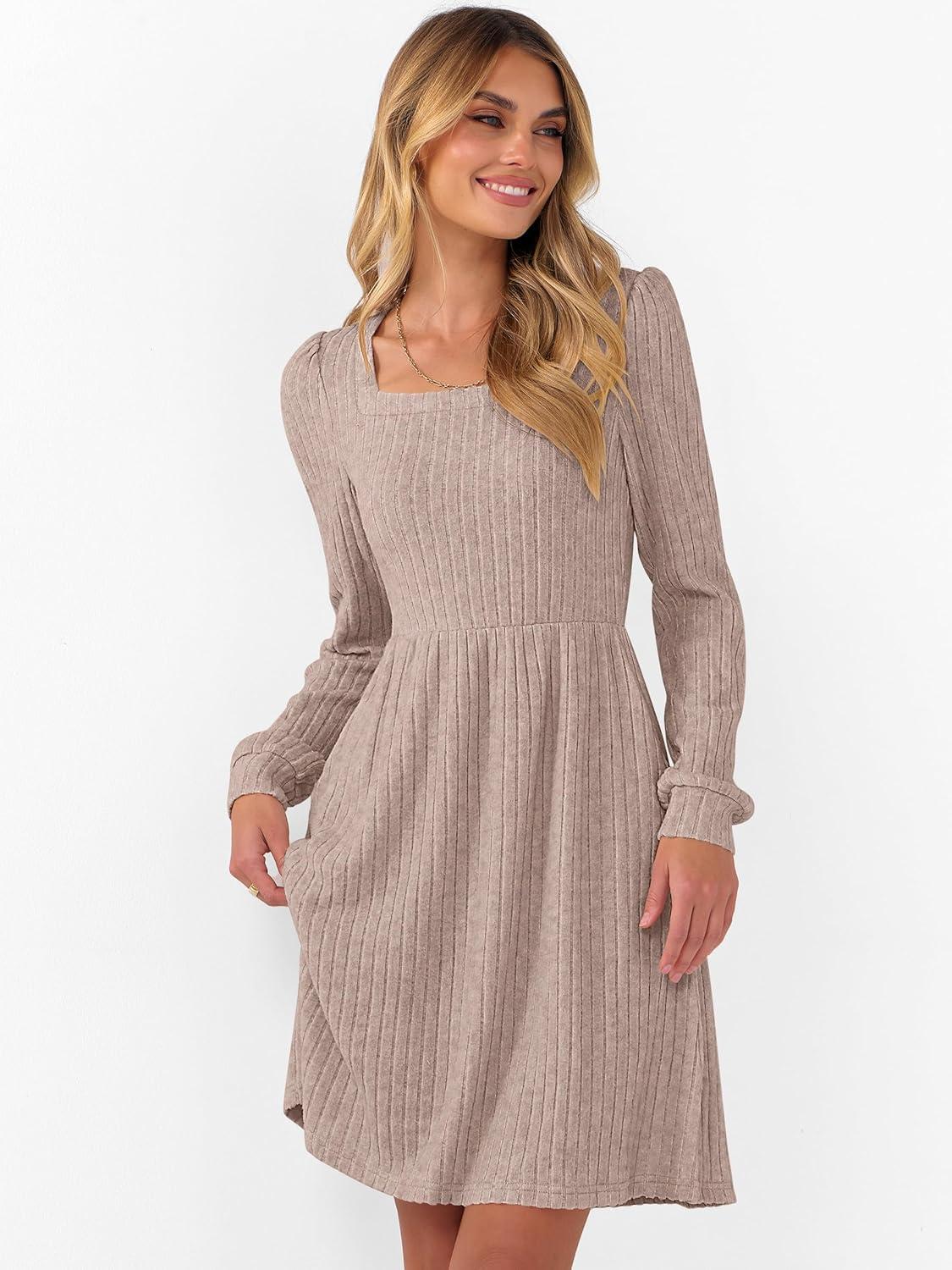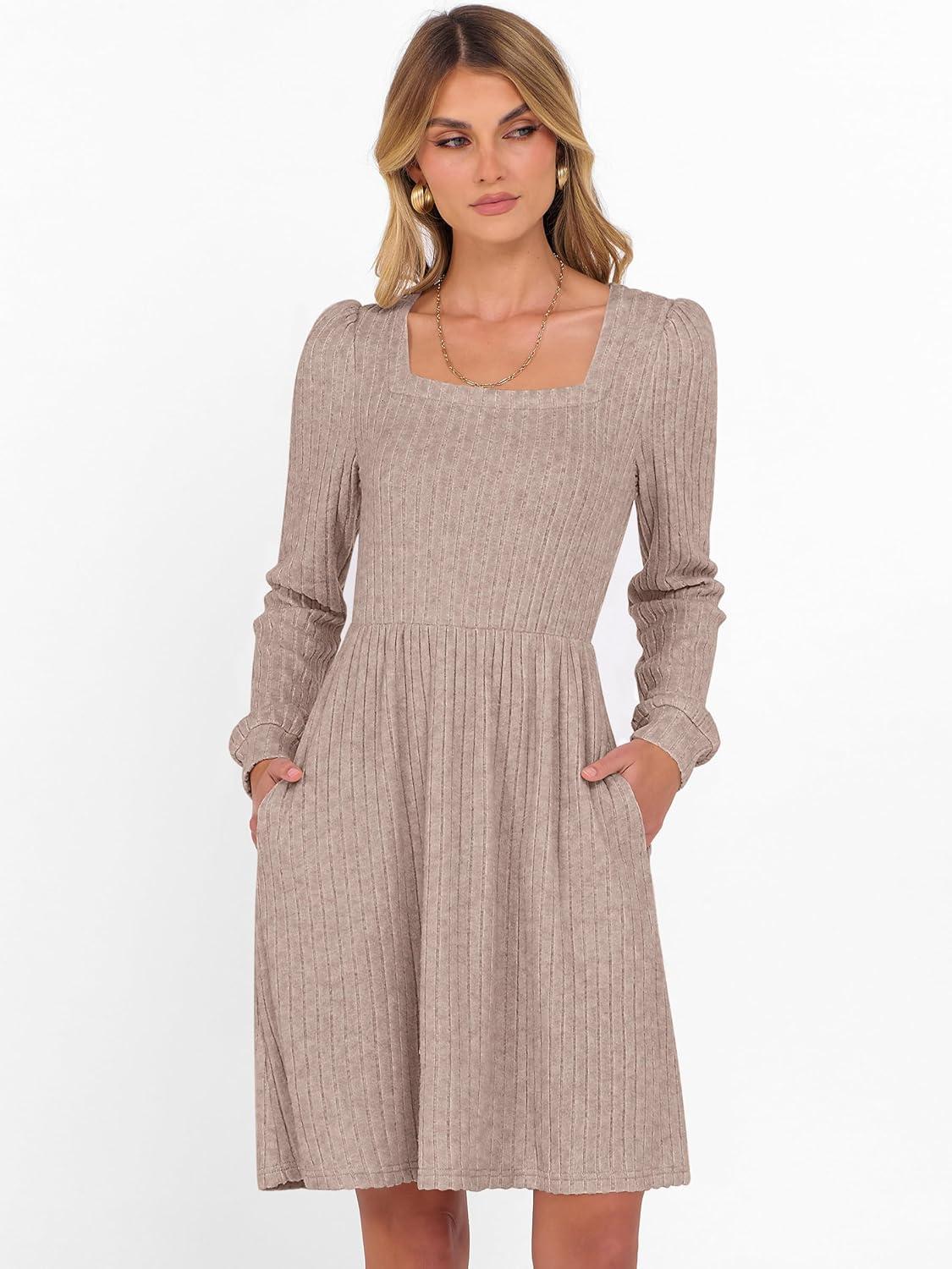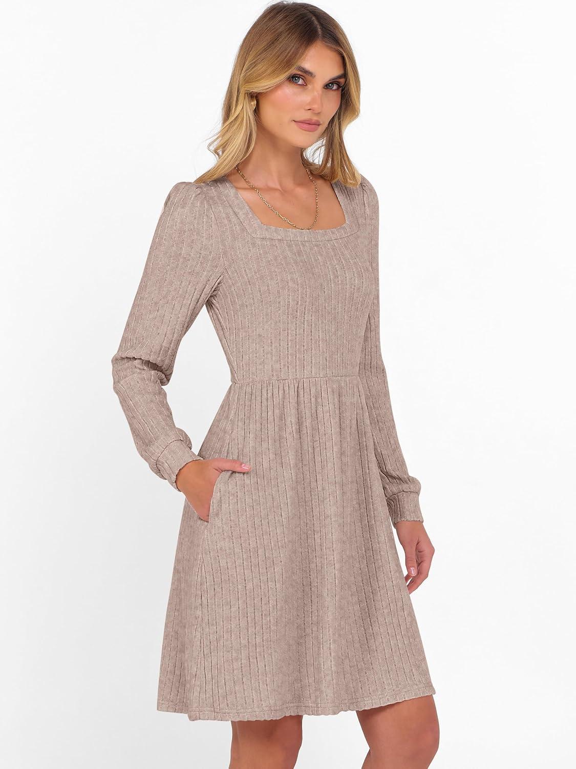 ANRABESS Women’s Square Neck Long Sleeve Fall Dress Casual Ribbed Knit Soft 2025 Trendy Short Sweater Dresses with Pockets(Tan)