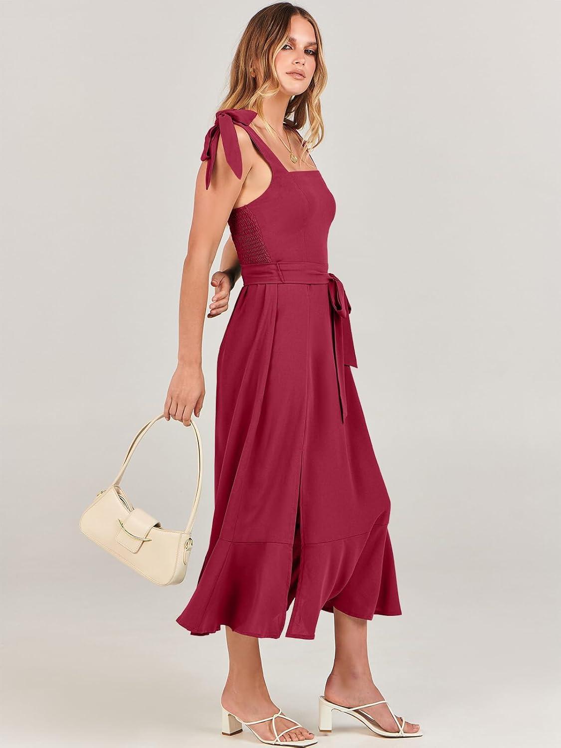 ANRABESS Women’s Square Neck Ruffle Split Midi Elegant Formal Wedding Guest Cocktail Bridesmaid Graduation Party Dresses(Dark Red)