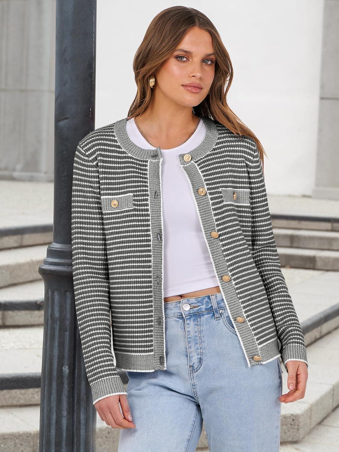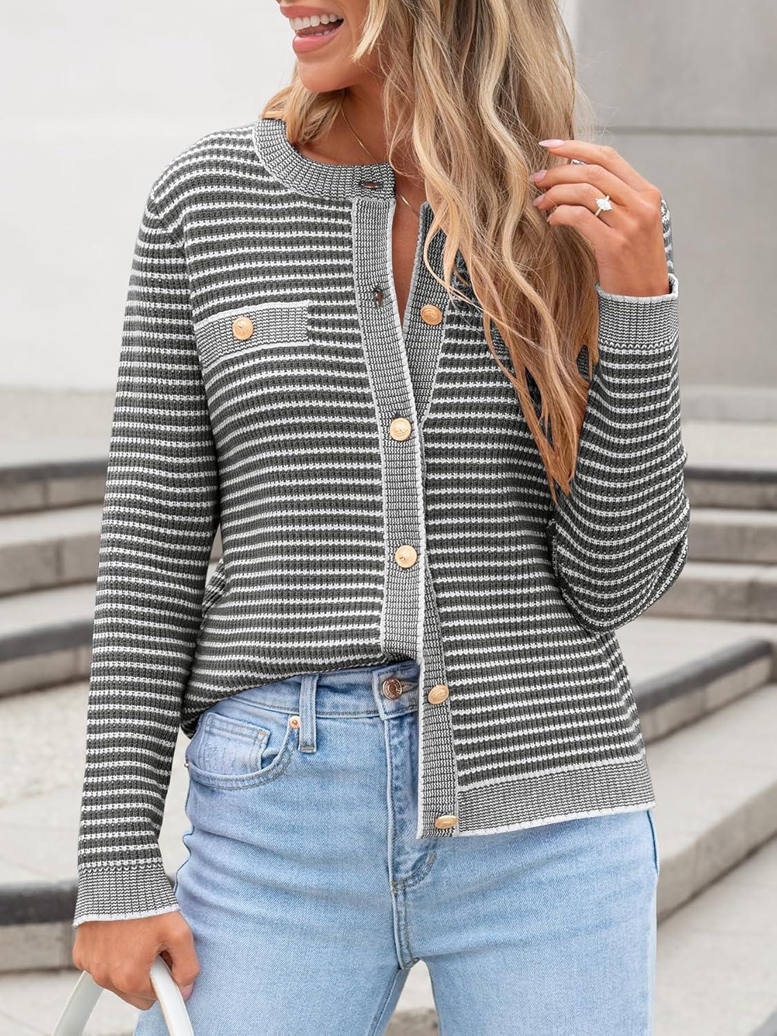 ANRABESS Women’s Striped Cardigan Sweaters Casual Long Sleeve Open Front Button Down Knit Cropped Jackets Fall Coat Outerwear(Stripe Grey)