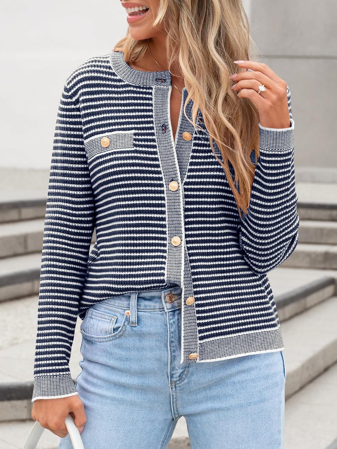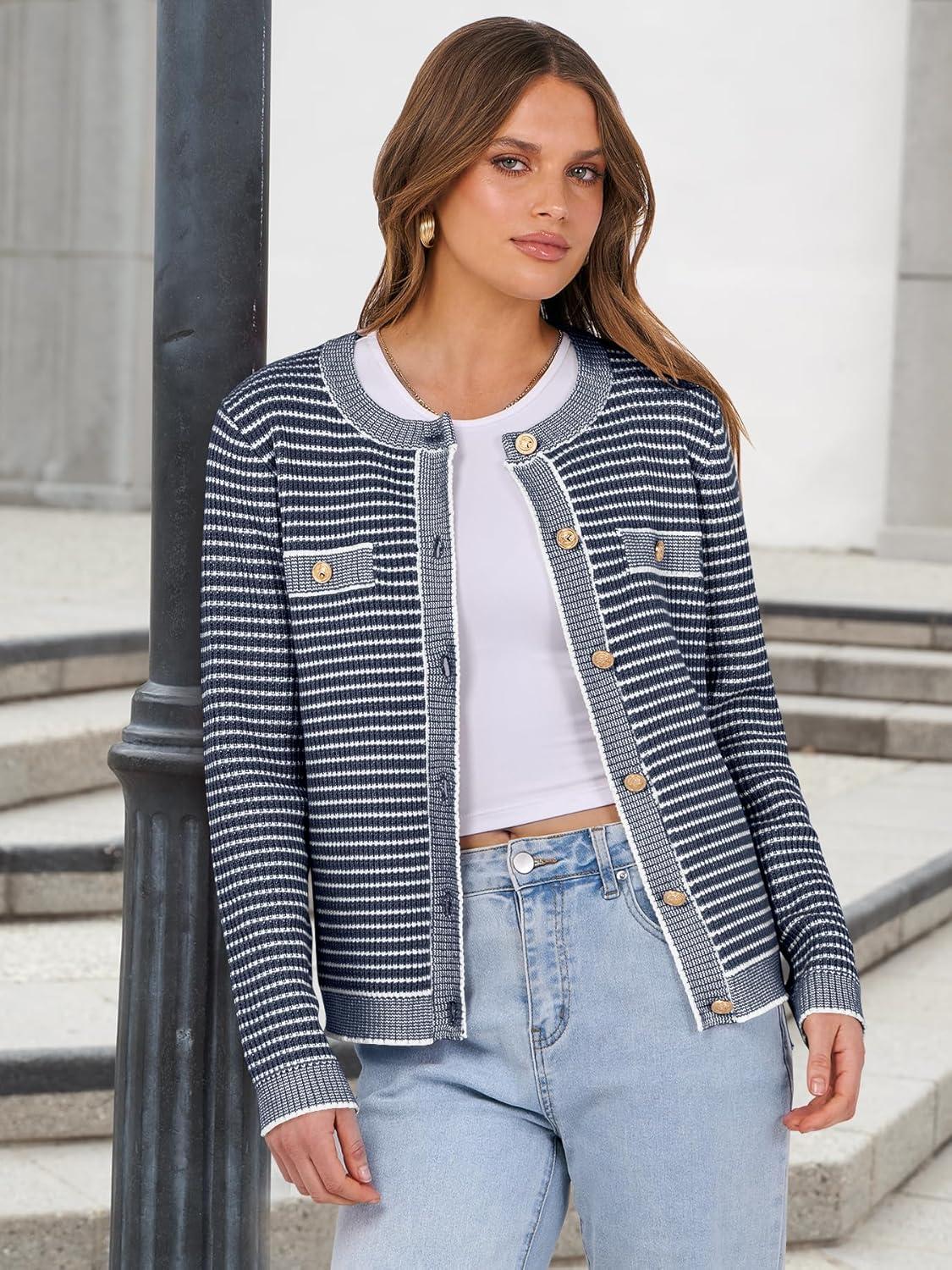 ANRABESS Women’s Striped Cardigan Sweaters Casual Long Sleeve Open Front Button Down Knit Cropped Jackets Fall Coat Outerwear(Stripe Navy Blue)