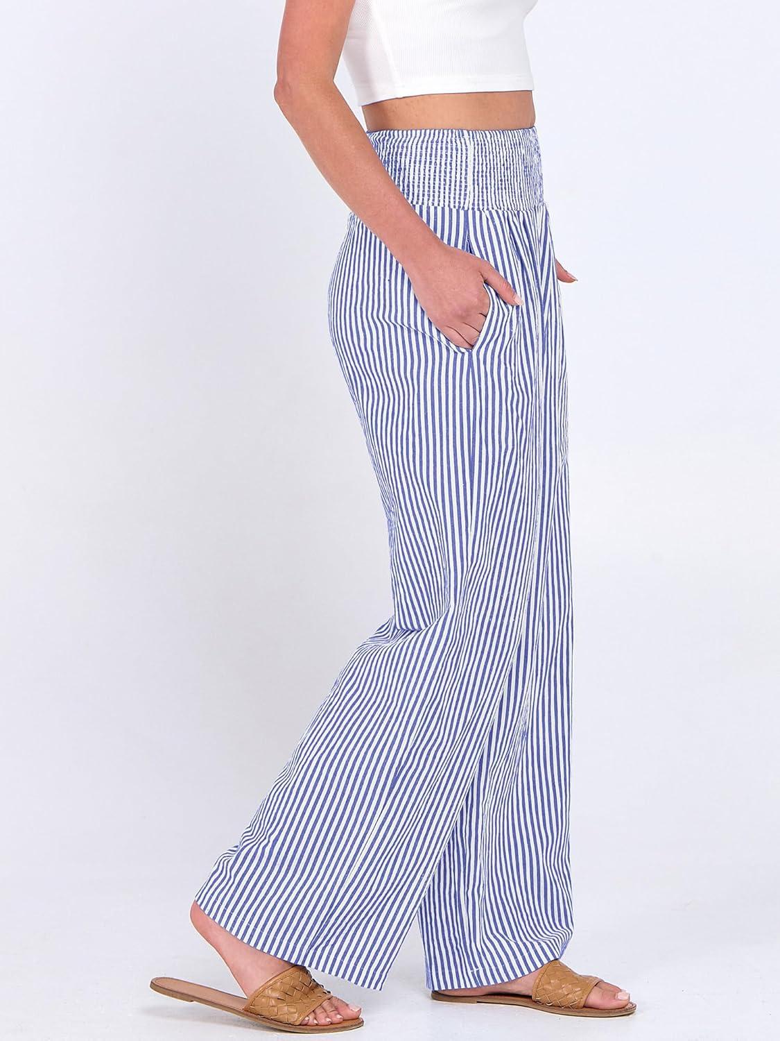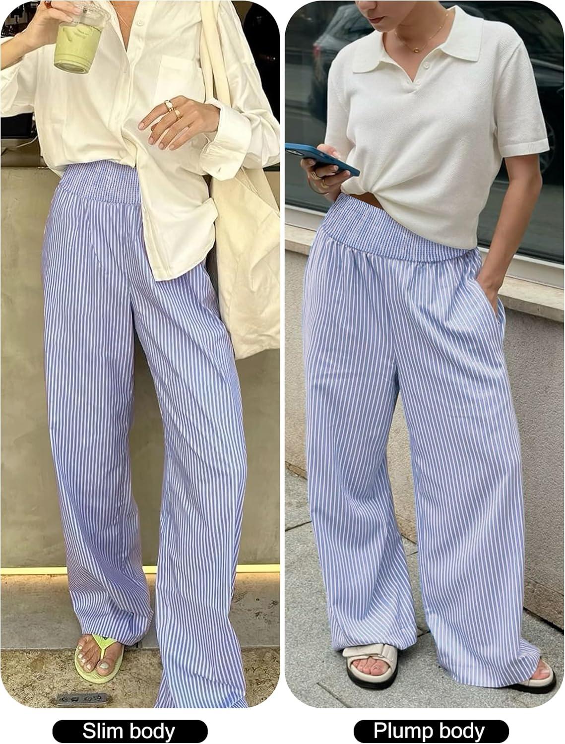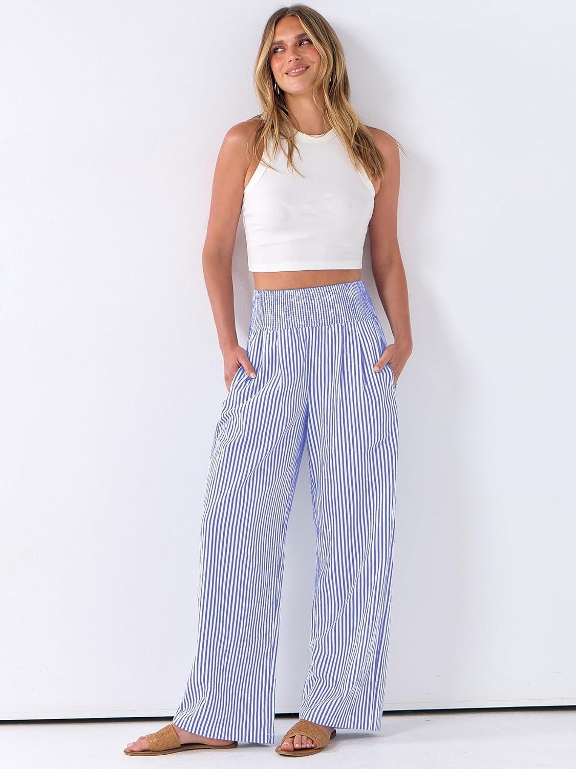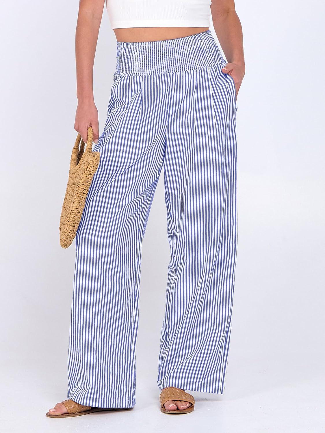 ANRABESS Womens Striped Gingham Palazzo Pants Wide Leg High Waisted Lounge Pajama Pants Cute Casual Trousers with Pockets(Blue White Stripe)