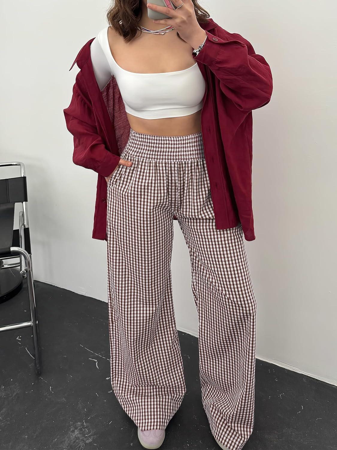ANRABESS Womens Striped Gingham Palazzo Pants Wide Leg High Waisted Lounge Pajama Pants Cute Casual Trousers with Pockets(Brown White Plaid)