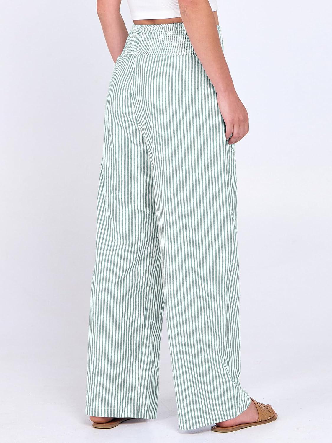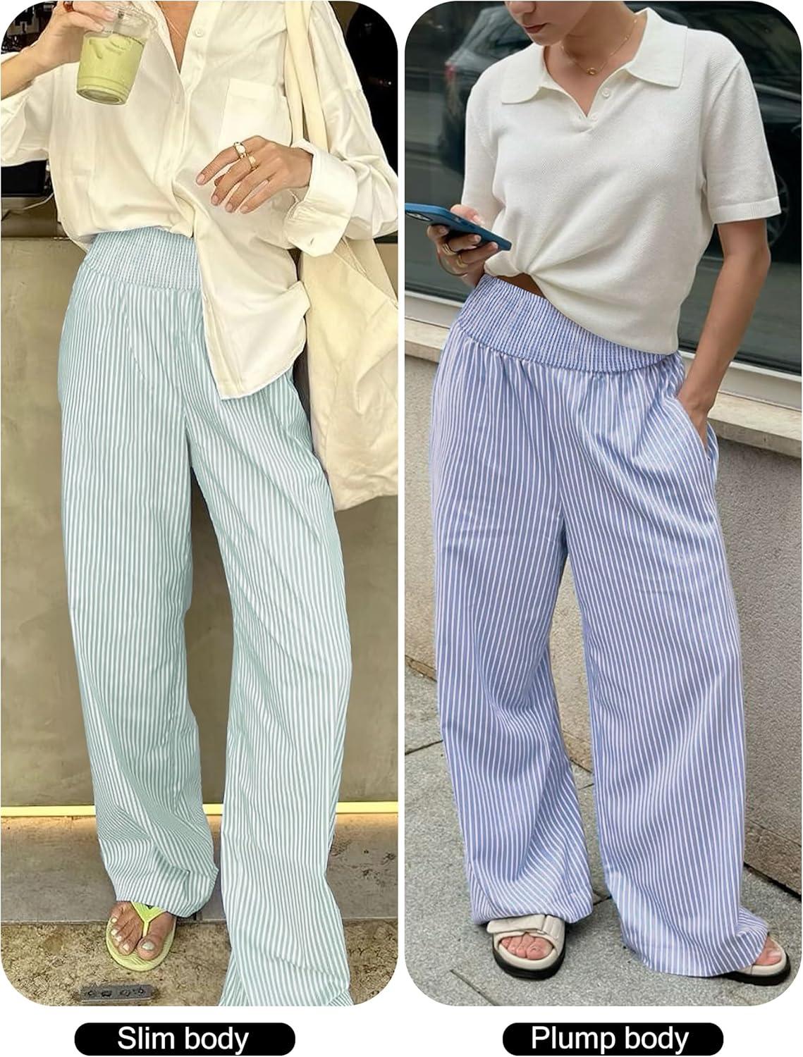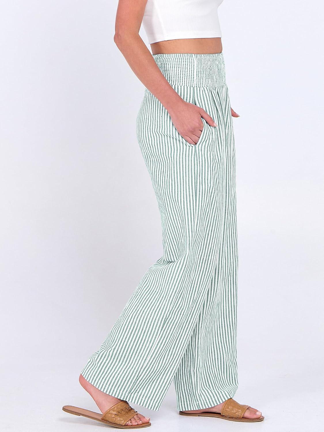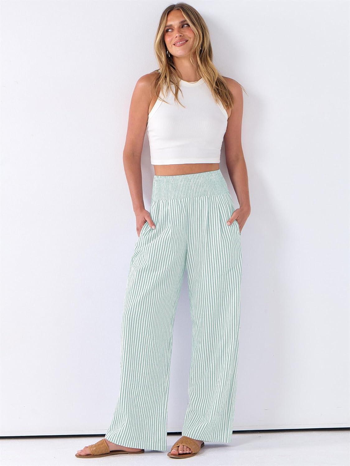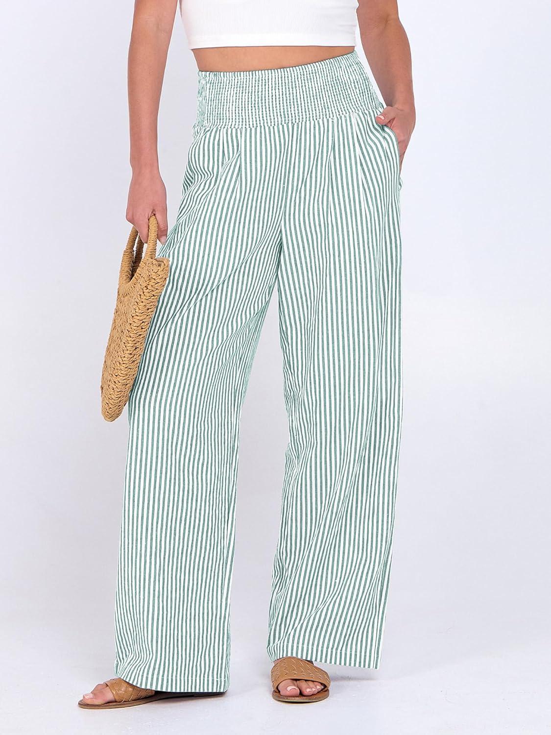 ANRABESS Womens Striped Gingham Palazzo Pants Wide Leg High Waisted Lounge Pajama Pants Cute Casual Trousers with Pockets(Green White Stripe)