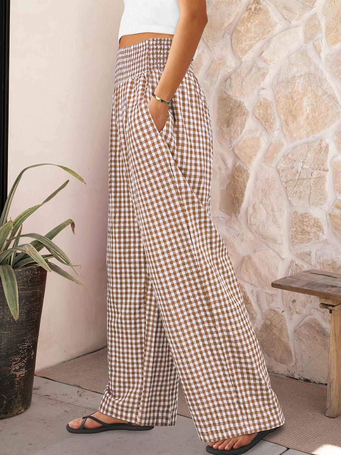 ANRABESS Womens Striped Gingham Palazzo Pants Wide Leg High Waisted Lounge Pajama Pants Cute Casual Trousers with Pockets(Light Brown White Plaid)