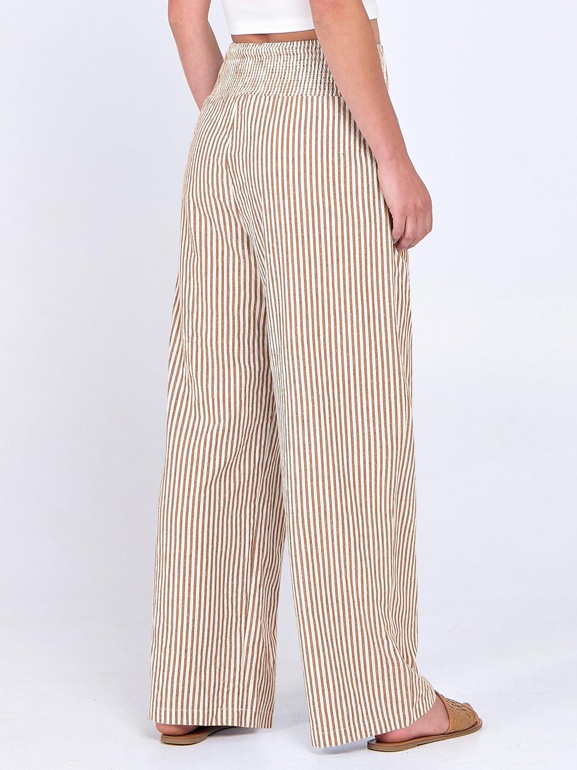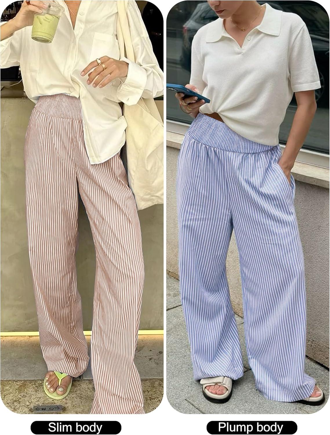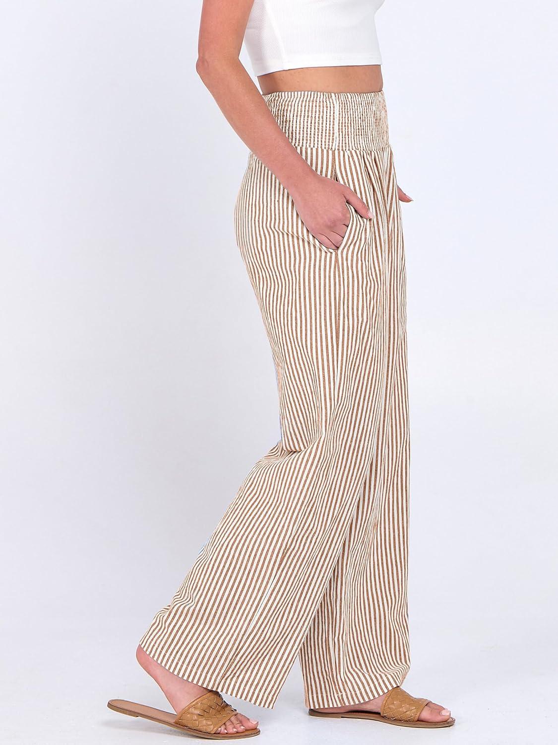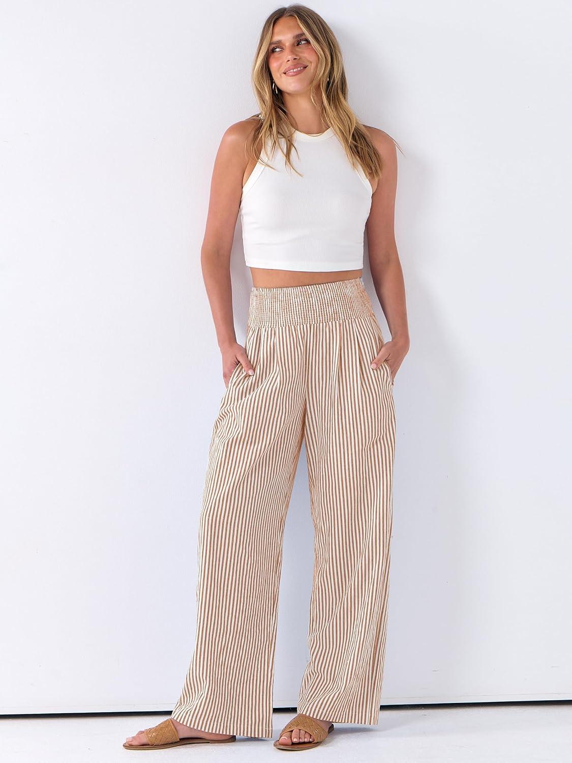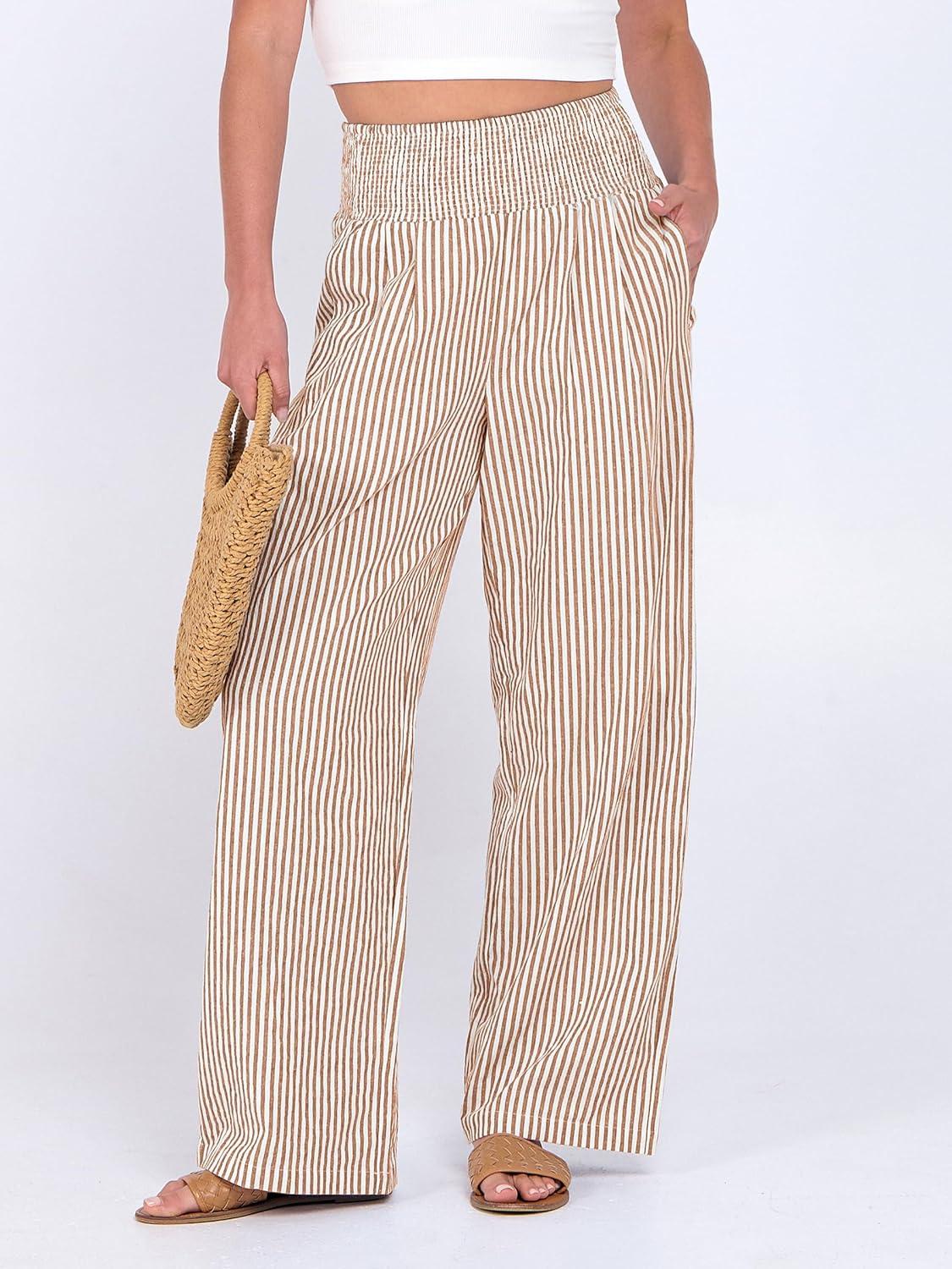 ANRABESS Womens Striped Gingham Palazzo Pants Wide Leg High Waisted Lounge Pajama Pants Cute Casual Trousers with Pockets(Light Brown White Stripe)