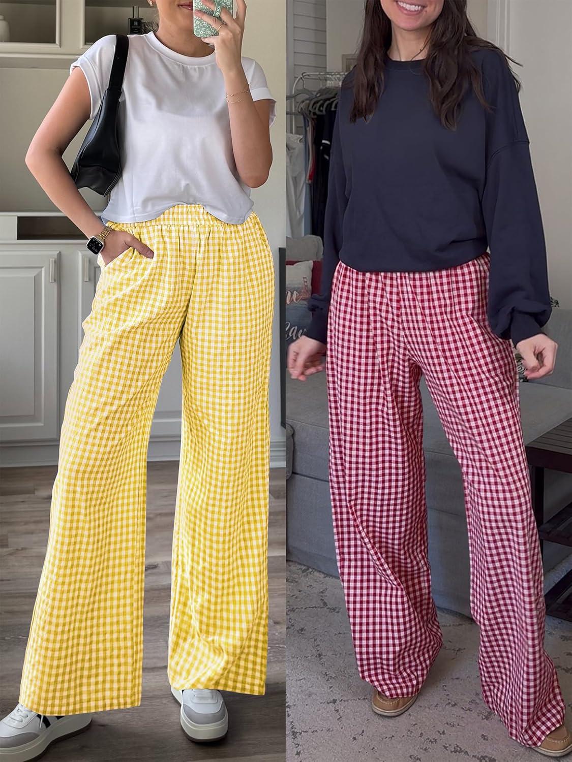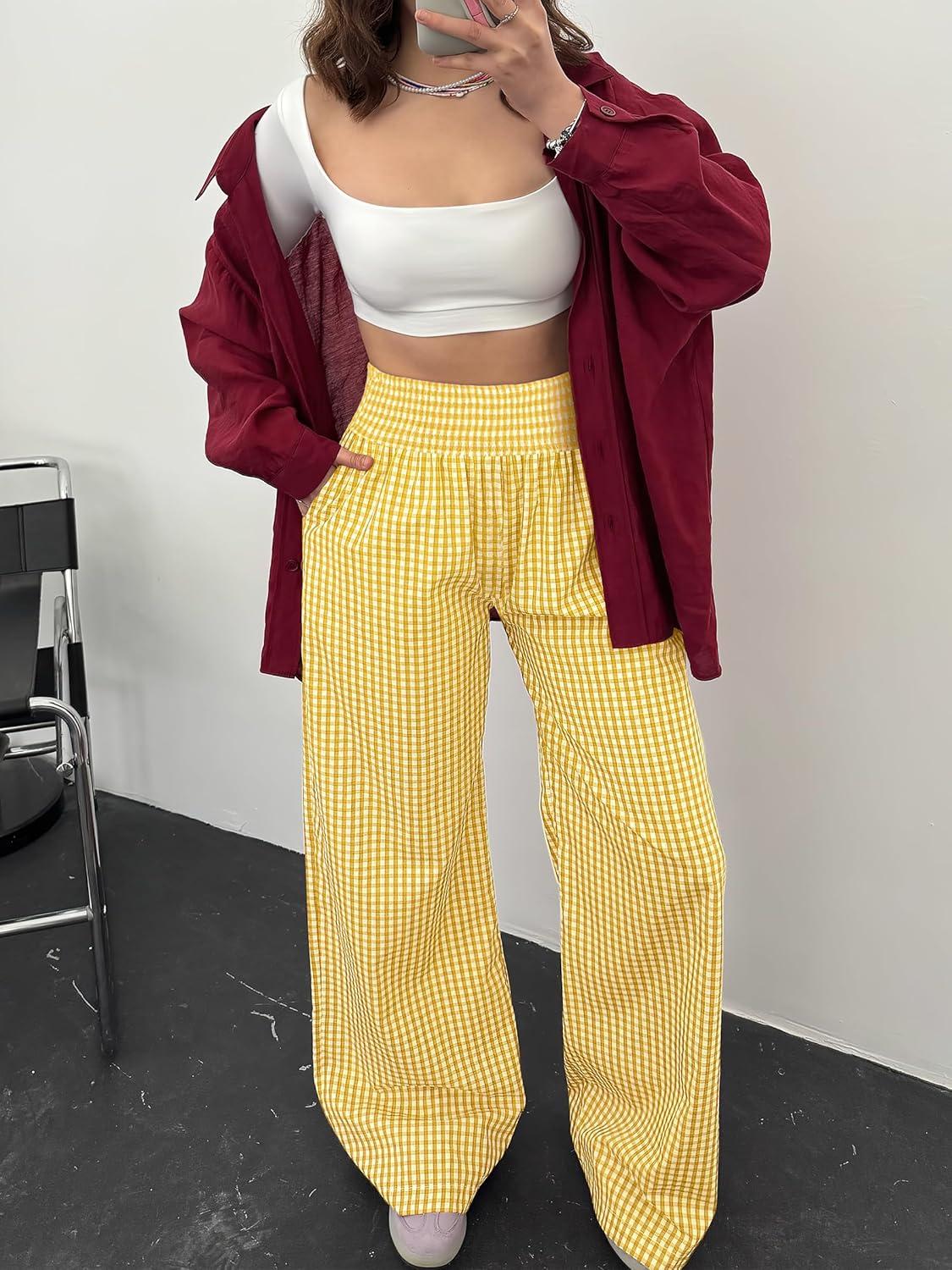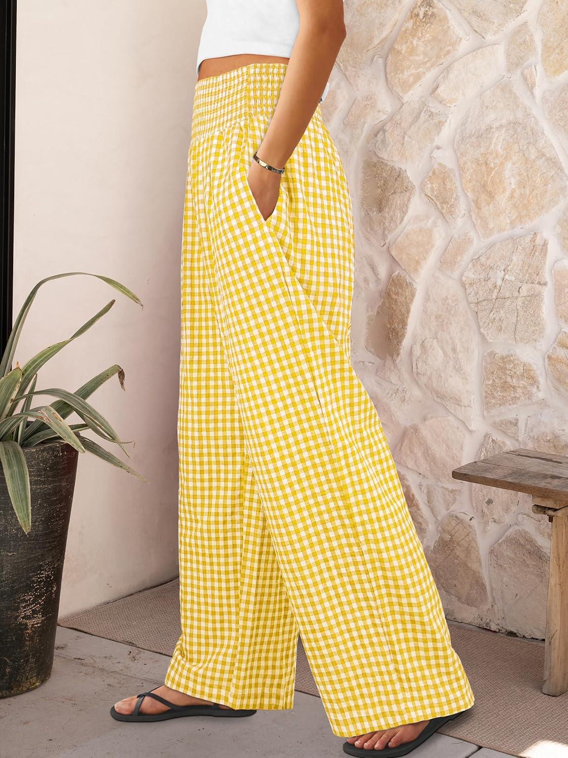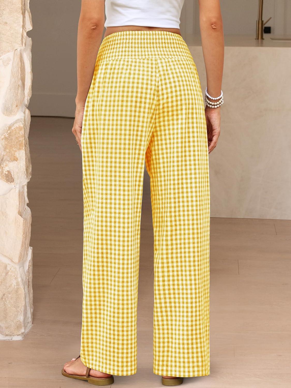 ANRABESS Womens Striped Gingham Palazzo Pants Wide Leg High Waisted Lounge Pajama Pants Cute Casual Trousers with Pockets(Yellow White Plaid)