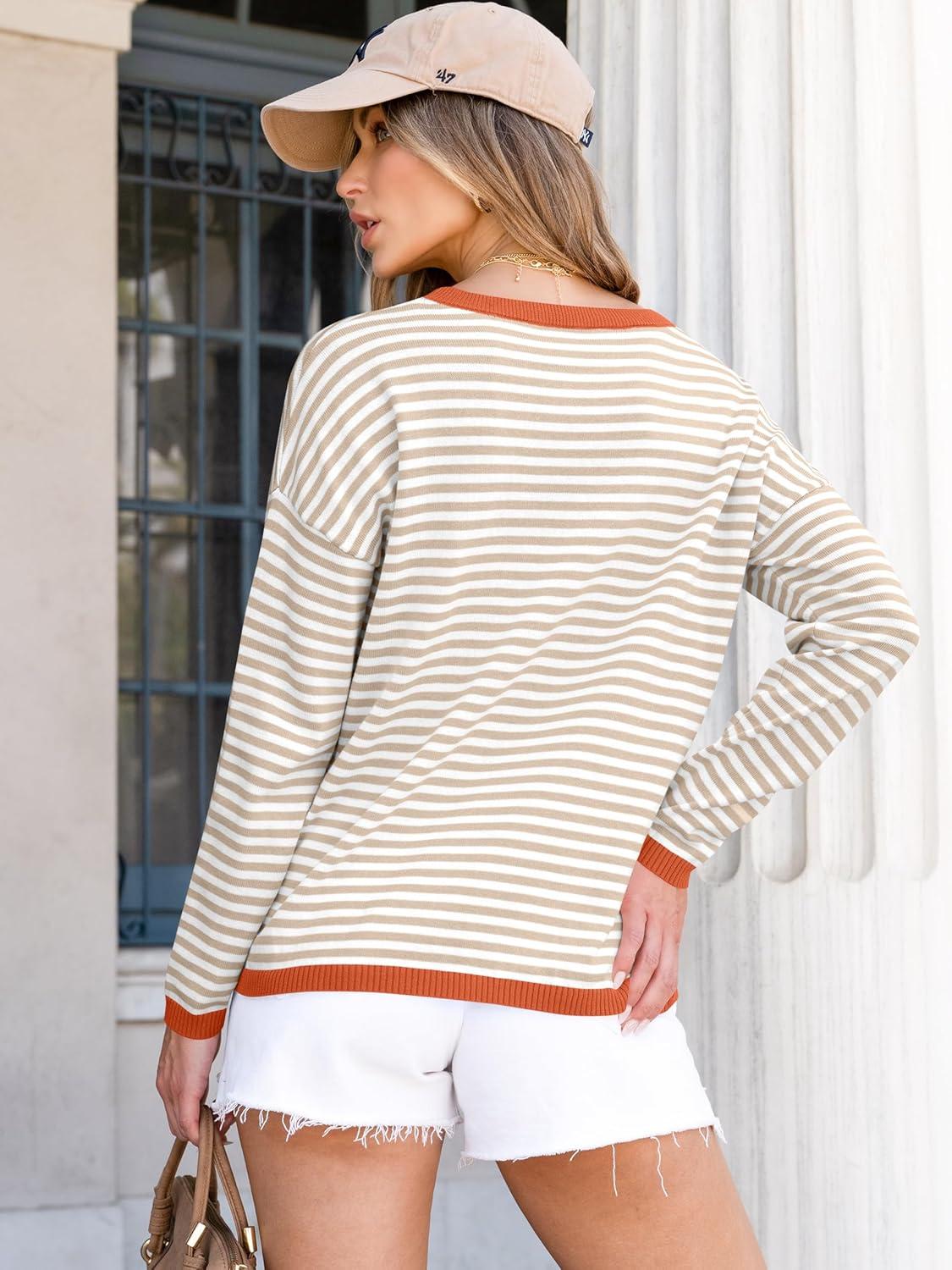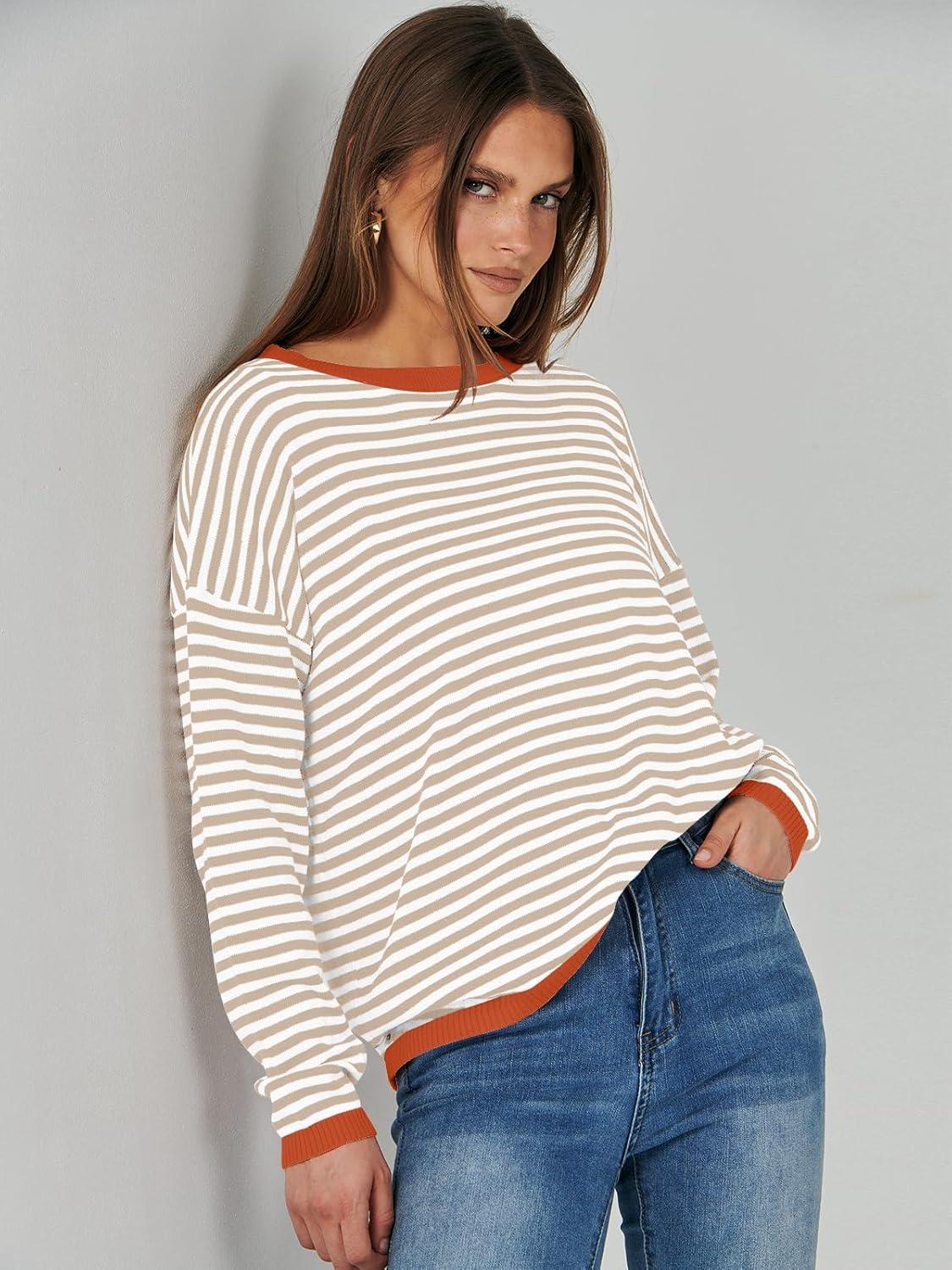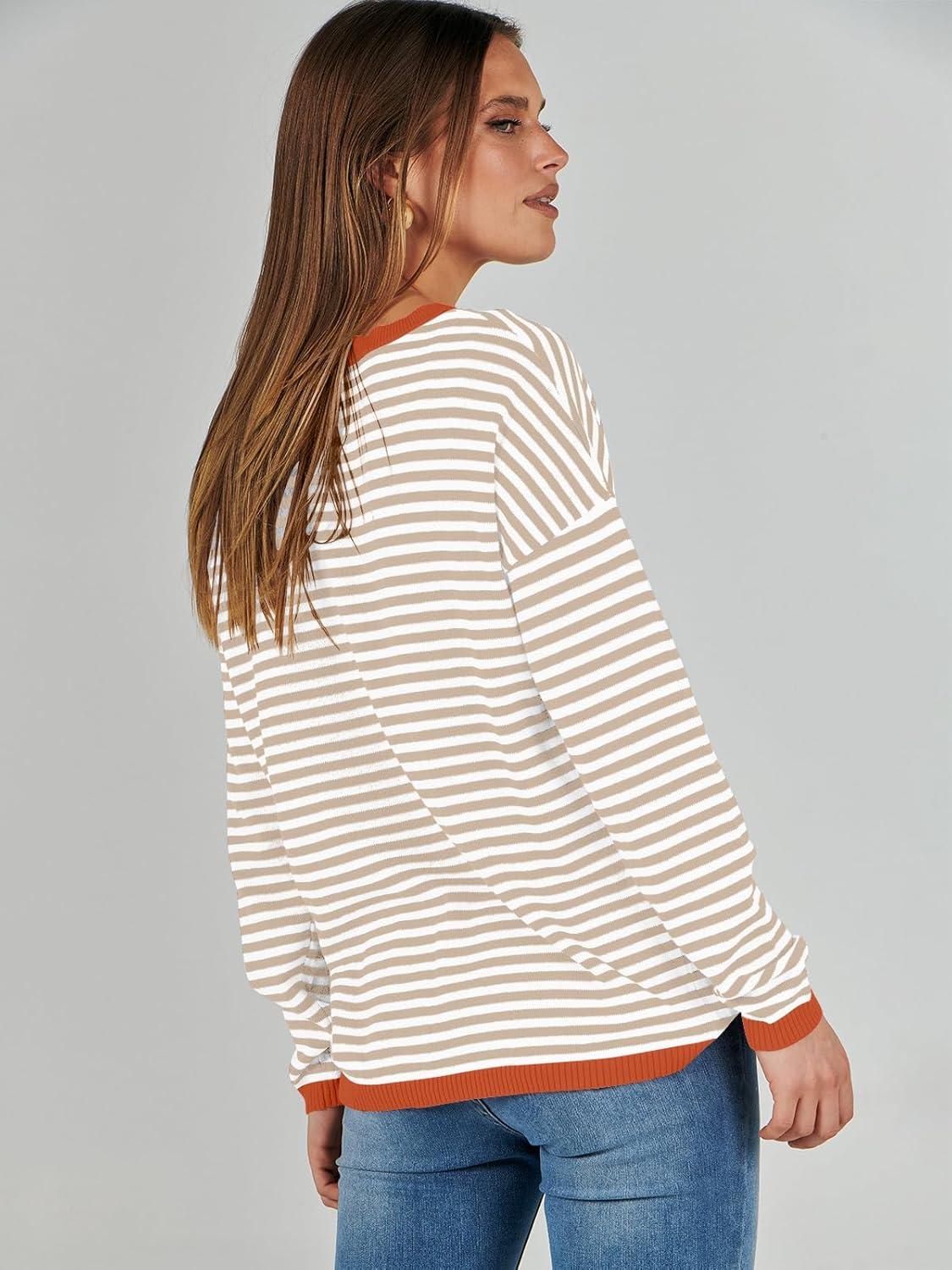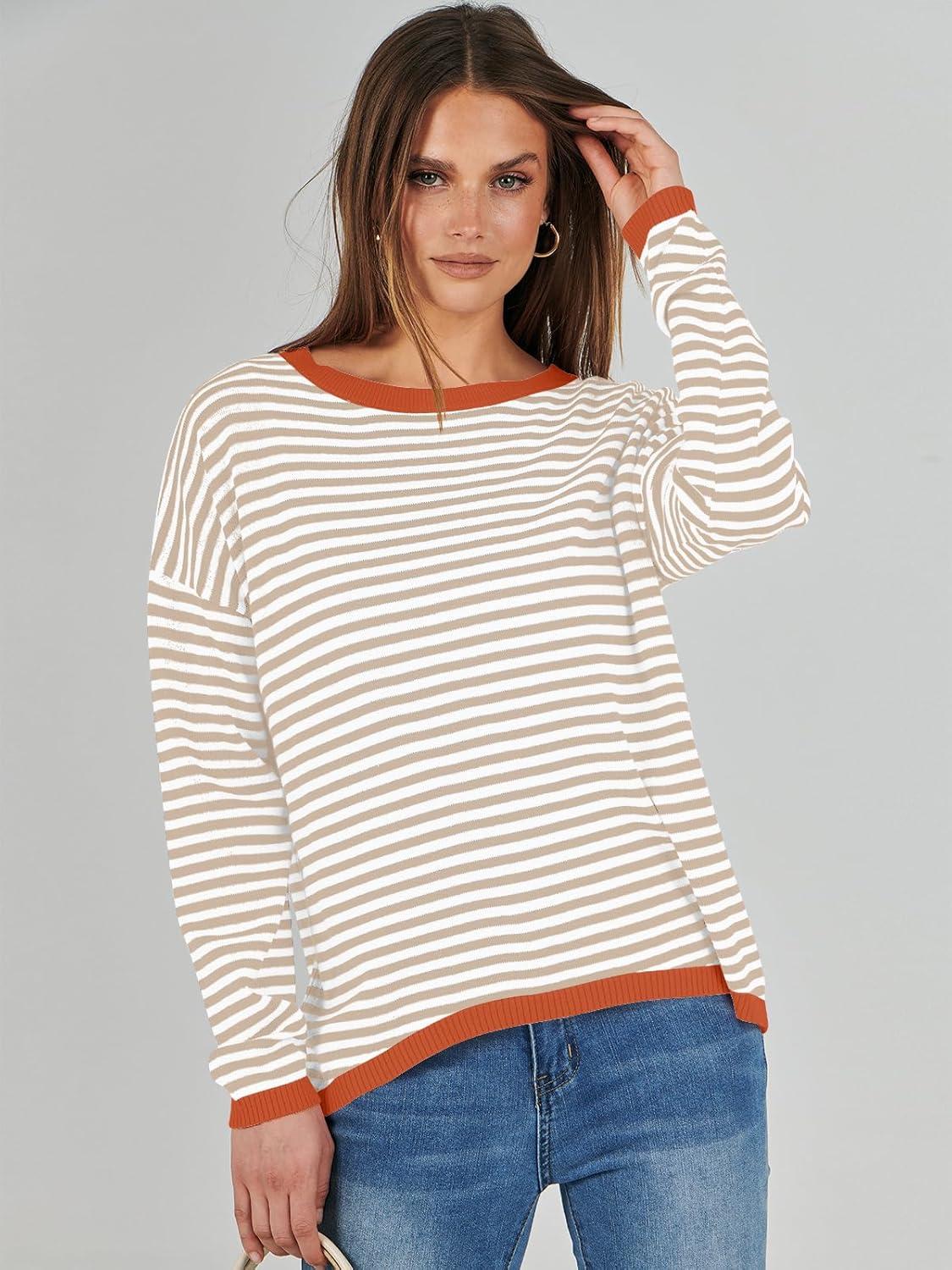 ANRABESS Womens Striped Sweaters Long Sleeve Top Crewneck Color Block Casual Loose Knitted Pullover Shirts 2025 Fall Outfits(Apricot White Orange)