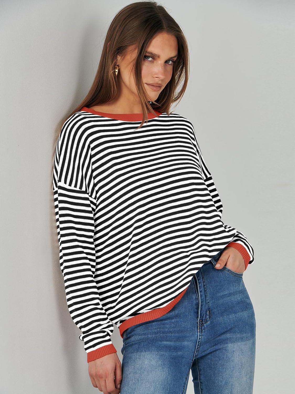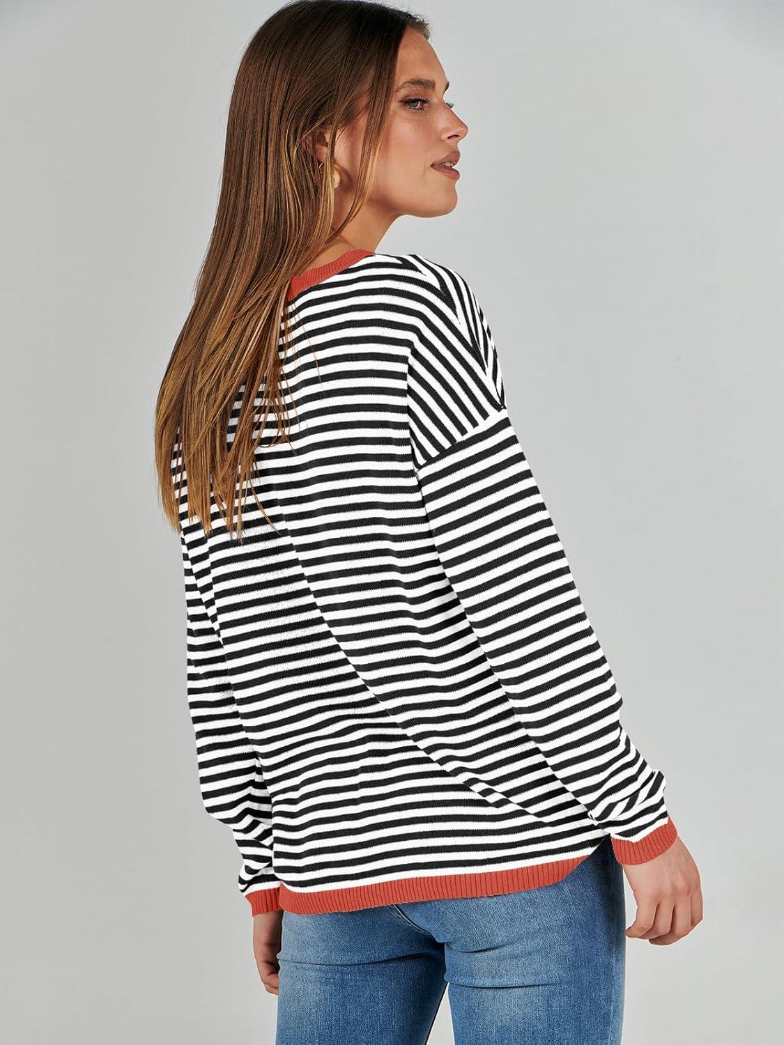 ANRABESS Womens Striped Sweaters Long Sleeve Top Crewneck Color Block Casual Loose Knitted Pullover Shirts 2025 Fall Outfits(Black White Orange)