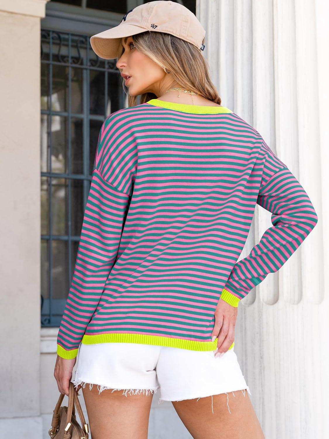 ANRABESS Womens Striped Sweaters Long Sleeve Top Crewneck Color Block Casual Loose Knitted Pullover Shirts 2025 Fall Outfits(Pink Green)