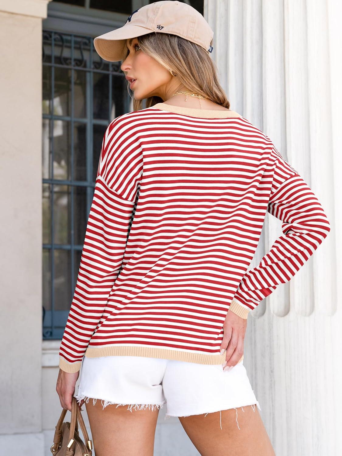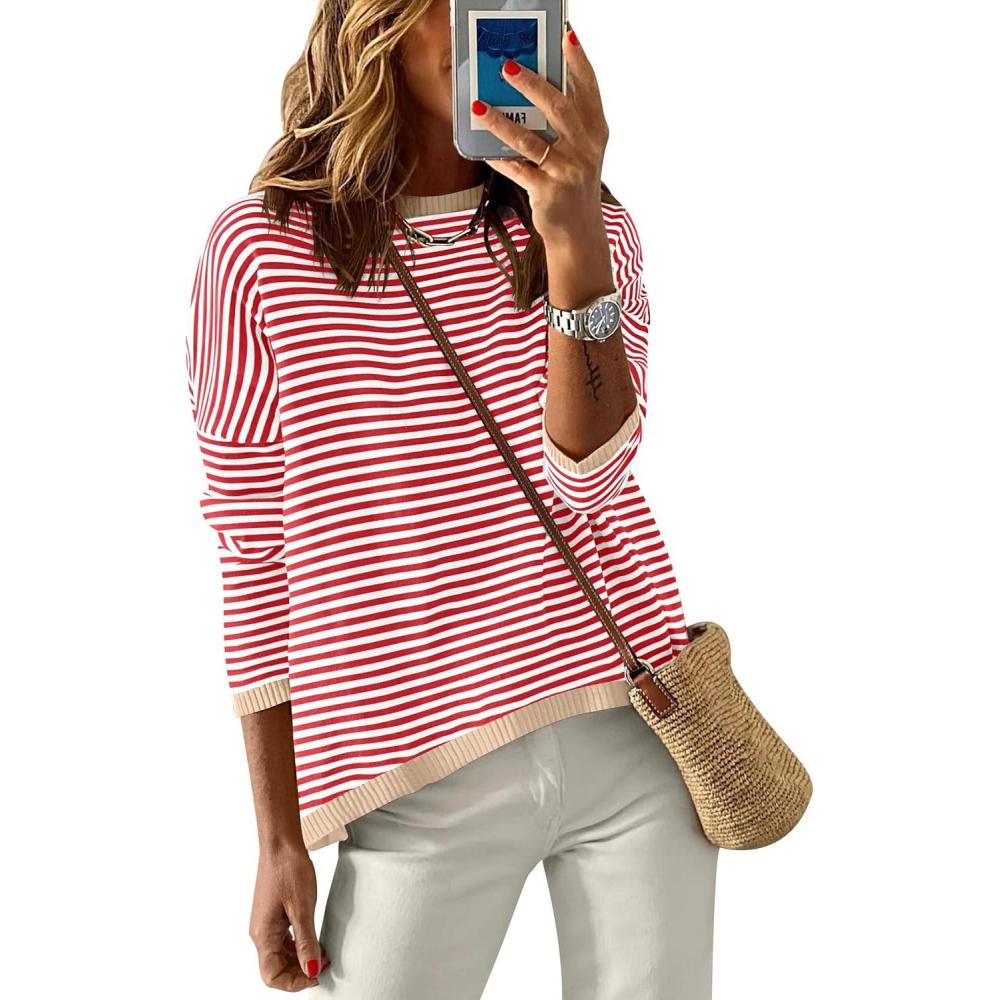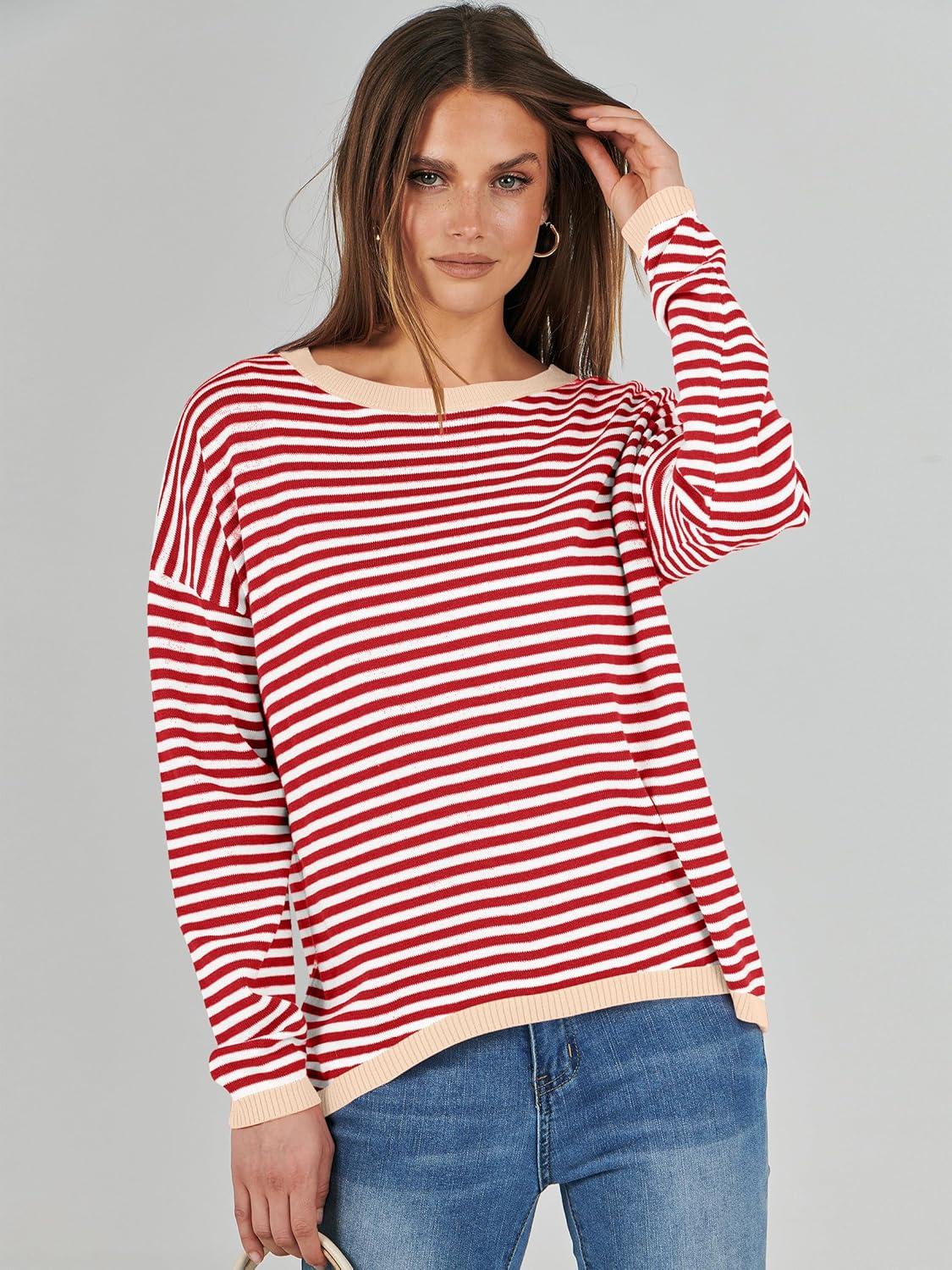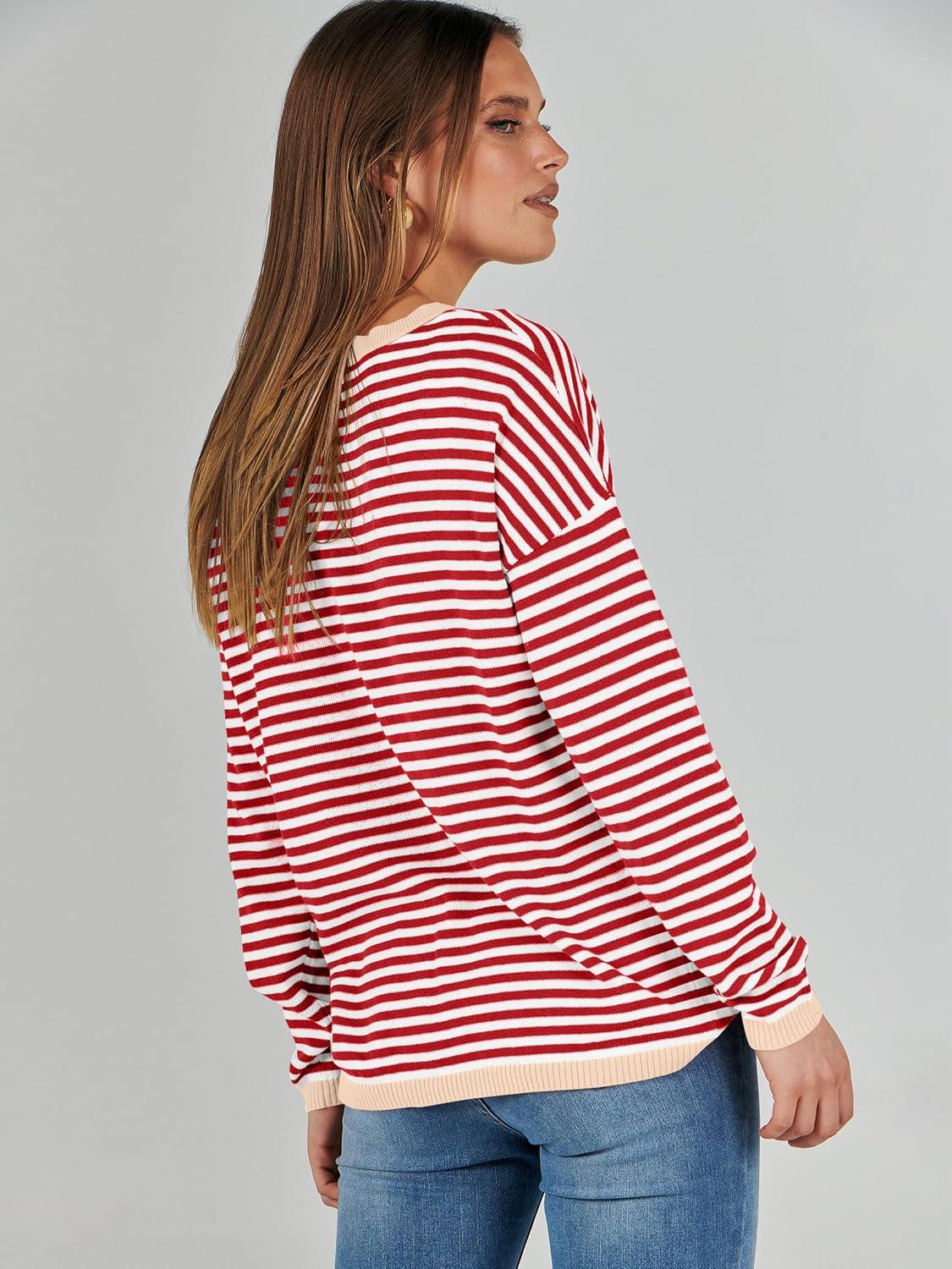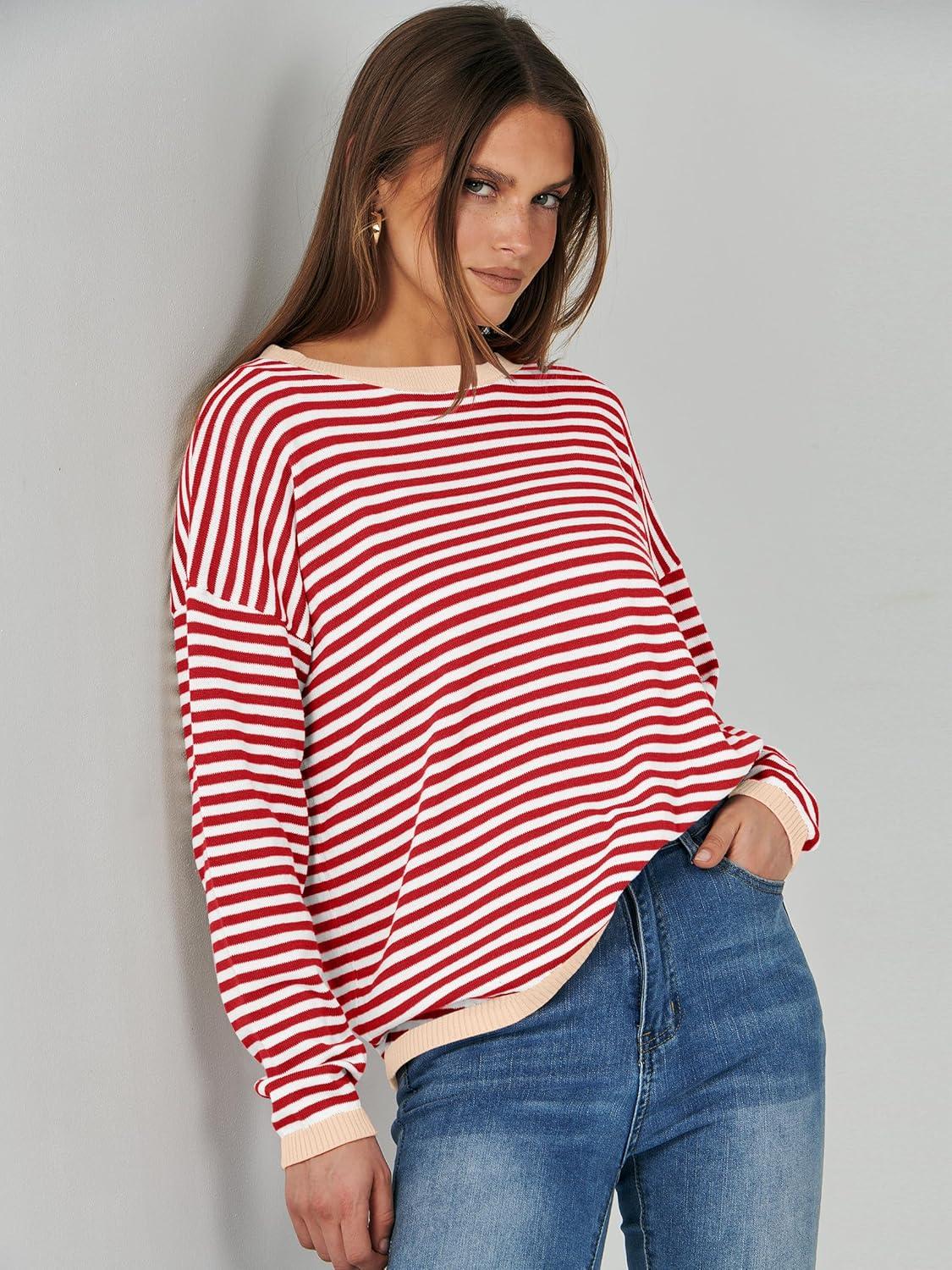 ANRABESS Womens Striped Sweaters Long Sleeve Top Crewneck Color Block Casual Loose Knitted Pullover Shirts 2025 Fall Outfits(Red White Apricot)