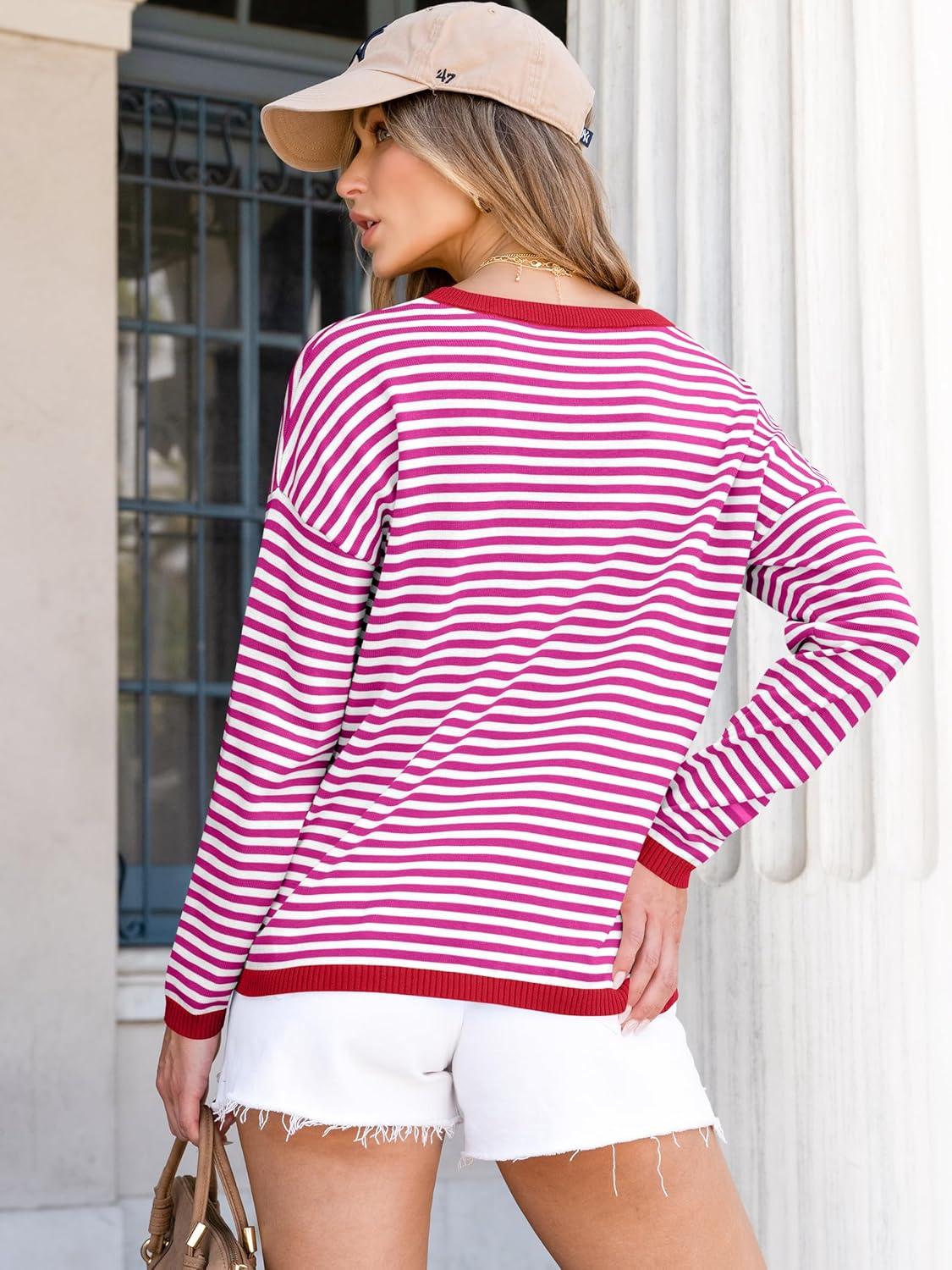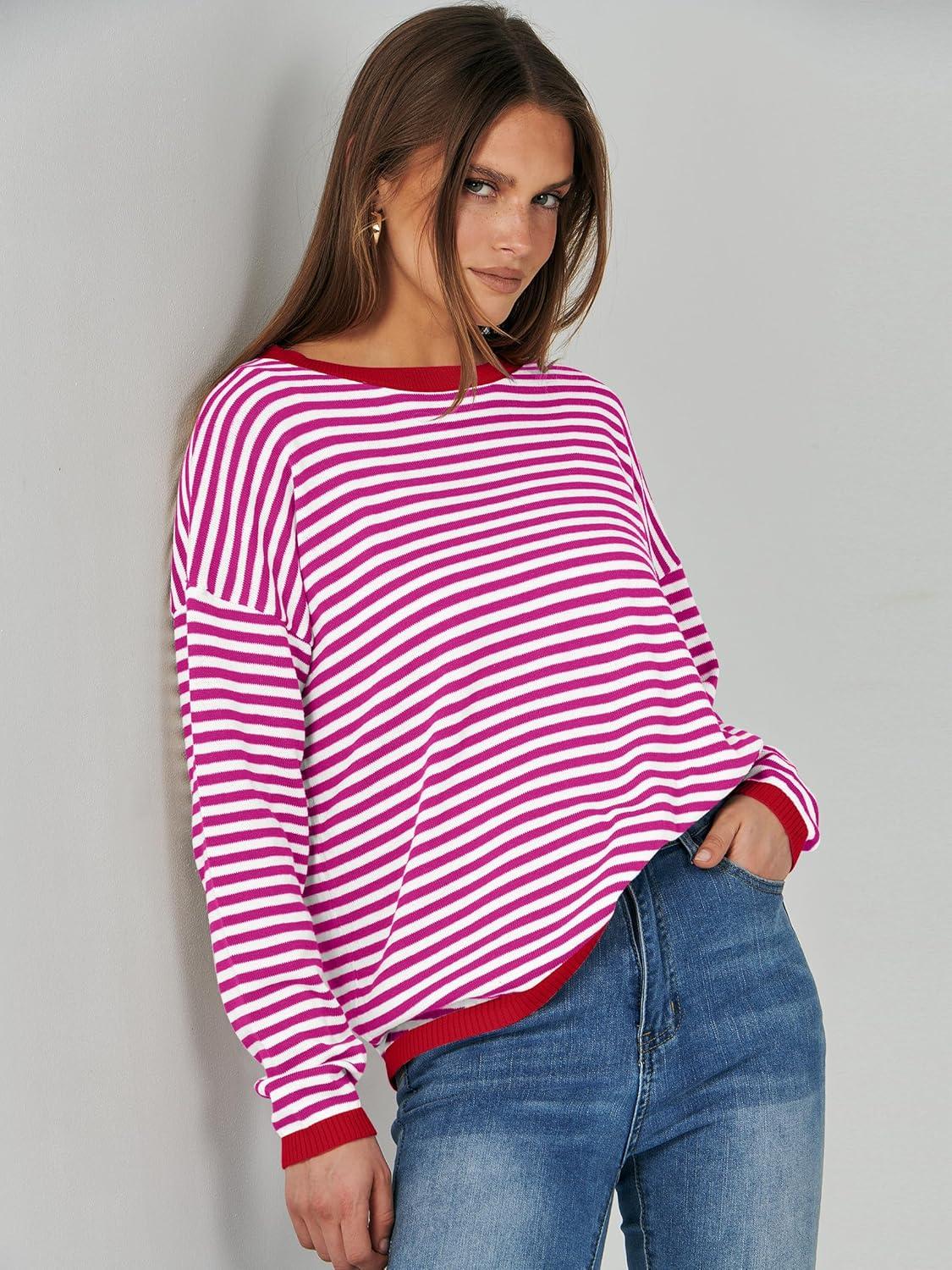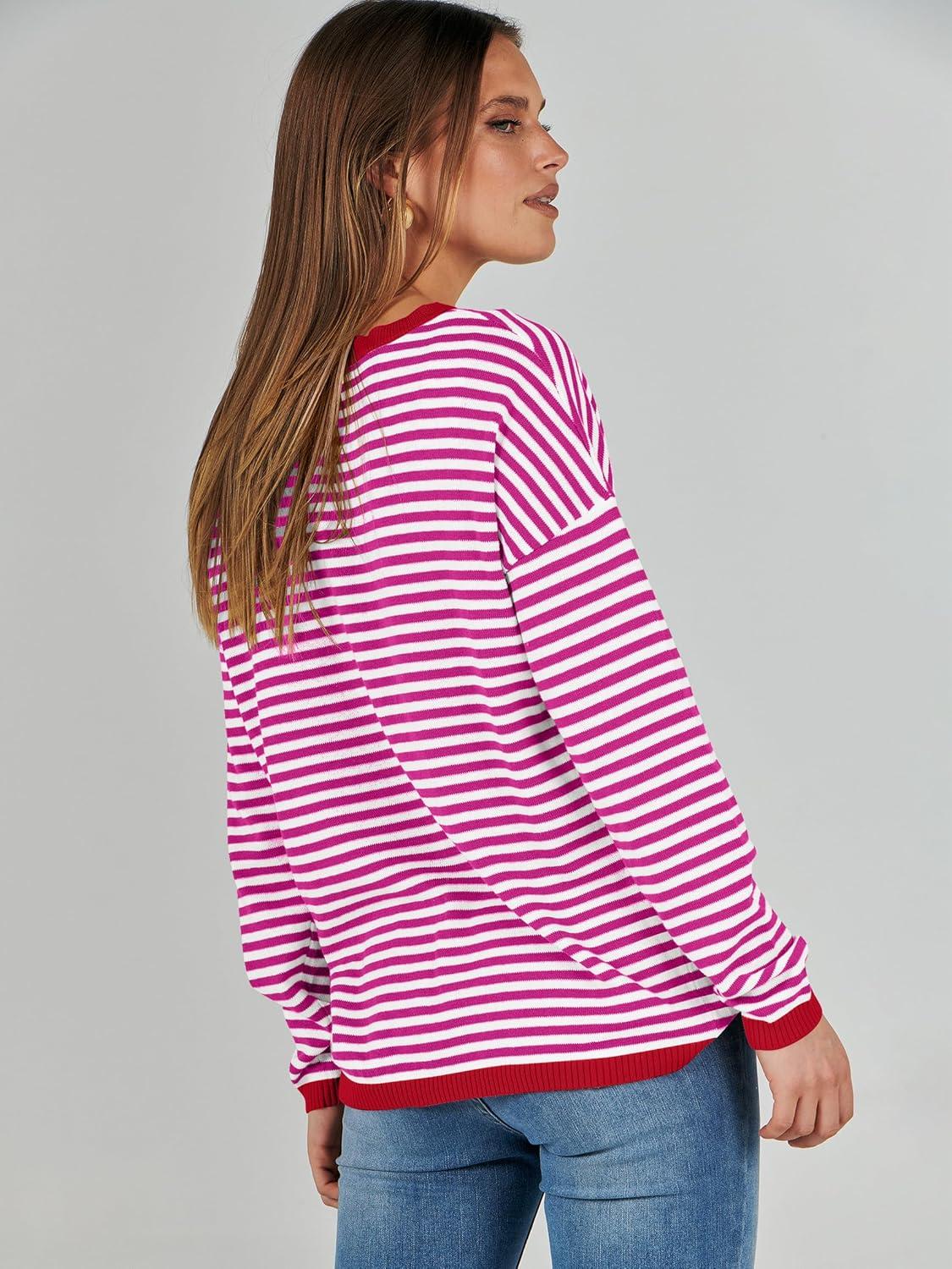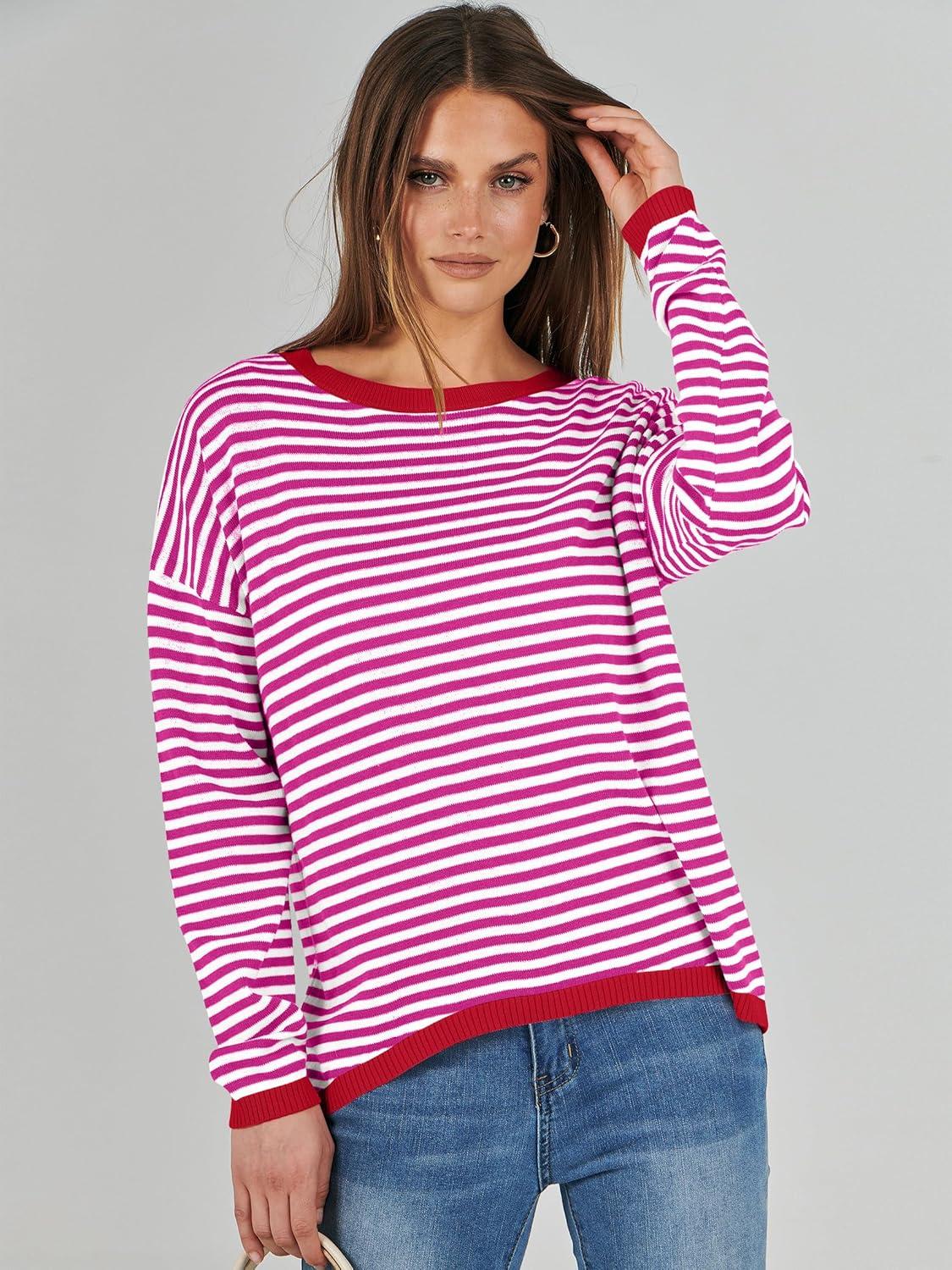 ANRABESS Womens Striped Sweaters Long Sleeve Top Crewneck Color Block Casual Loose Knitted Pullover Shirts 2025 Fall Outfits(Red White Pink)