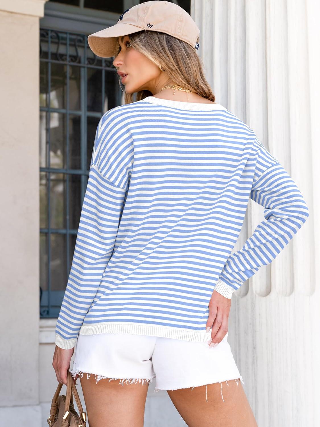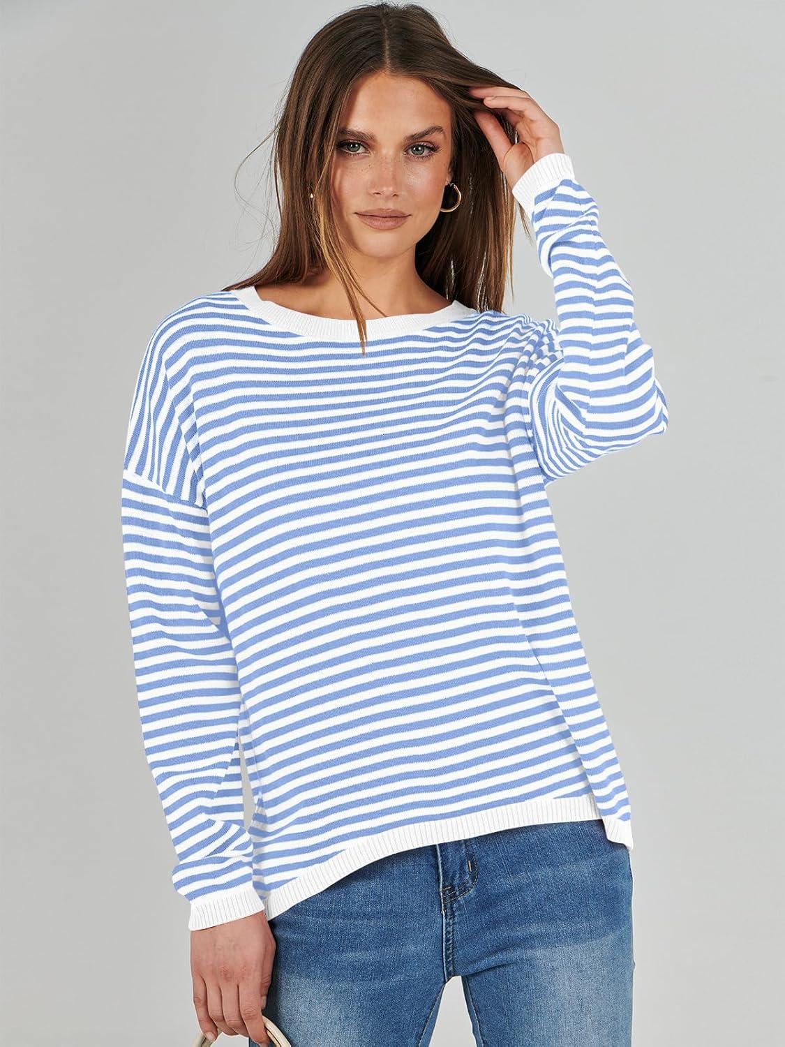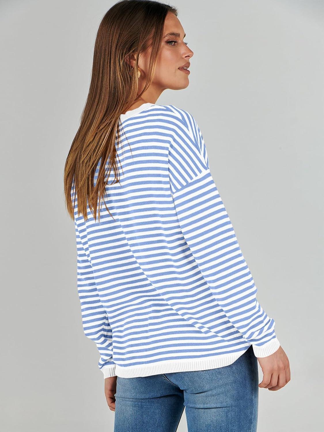 ANRABESS Womens Striped Sweaters Long Sleeve Top Crewneck Color Block Casual Loose Knitted Pullover Shirts 2025 Fall Outfits(White Blue)