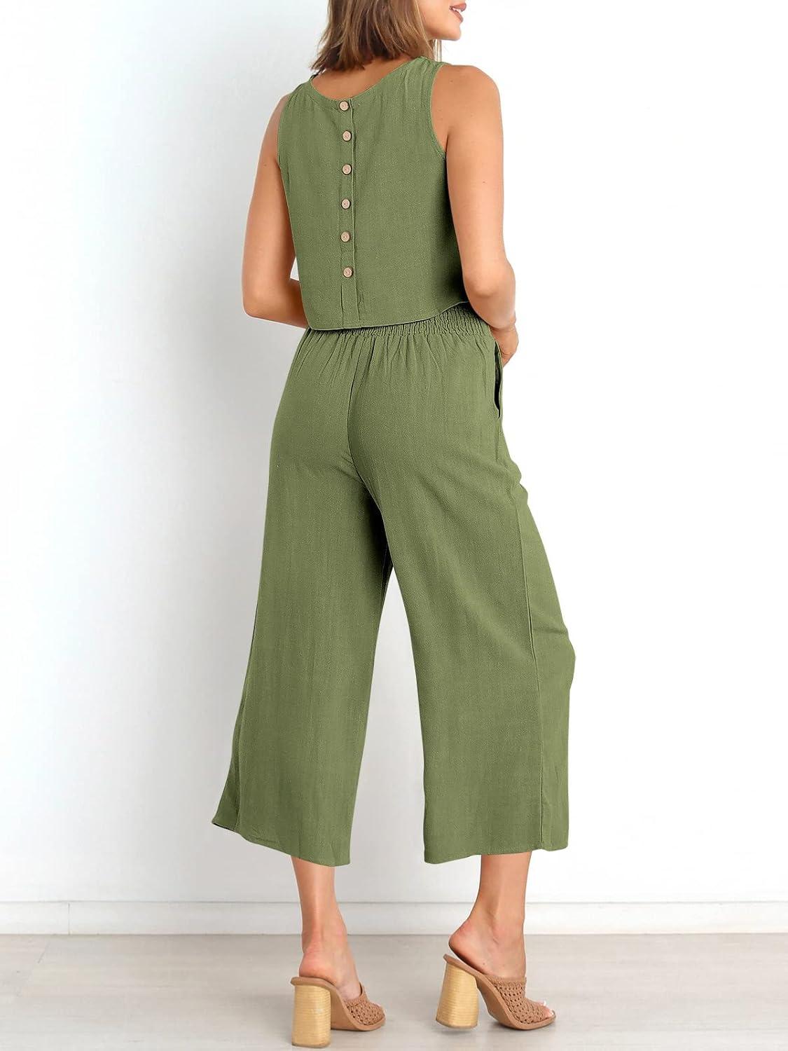 ANRABESS Women's Summer 2 Piece Outfits Sleeveless Crop Top Capri Wide Leg Pants Jumpsuit Casual Linen Lounge Matching Sets 2 piece outfit features a sleeveless round neck crop top, wide-leg cropped pants, button back, high waist, and a wide waistband for added comfort.
