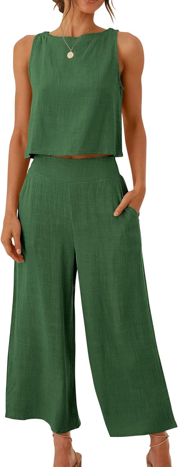 ANRABESS Women’s Summer 2 Piece Outfits Sleeveless Crop Top Capri Wide Leg Pants Jumpsuit Linen Lounge Beach Travel Sets(Green)