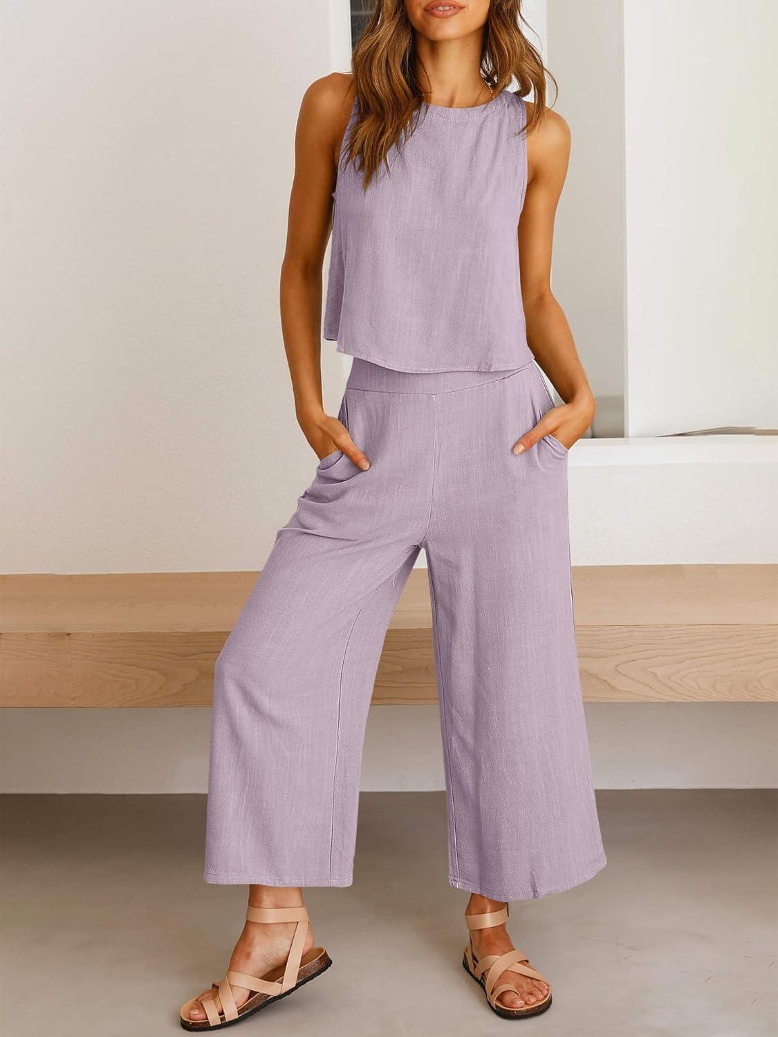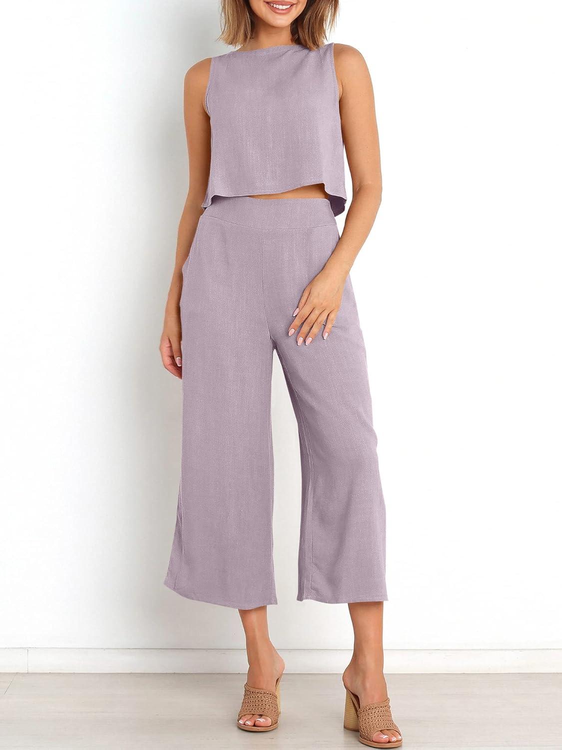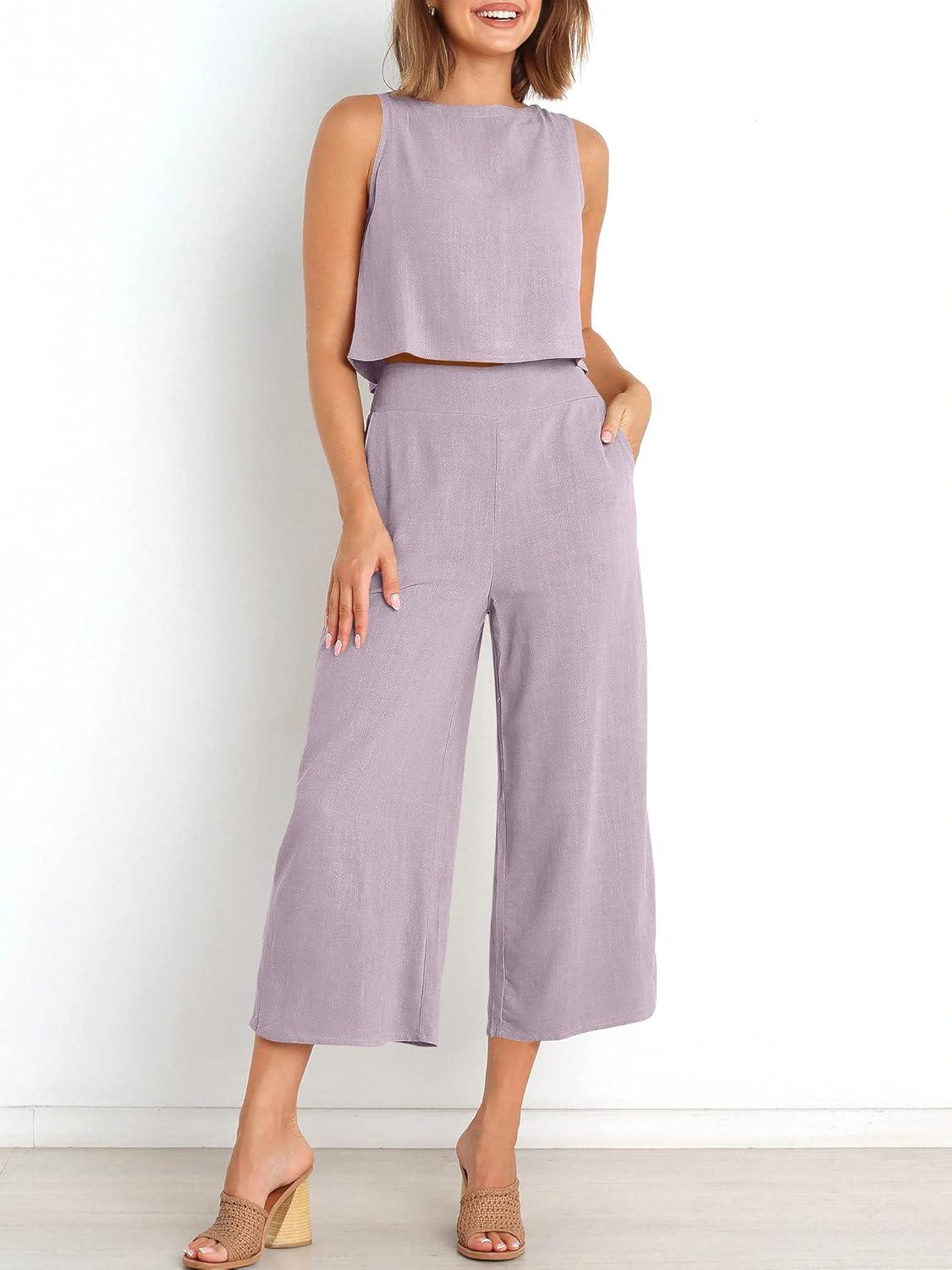 ANRABESS Women’s Summer 2 Piece Outfits Sleeveless Crop Top Capri Wide Leg Pants Jumpsuit Linen Lounge Beach Travel Sets(Purple)