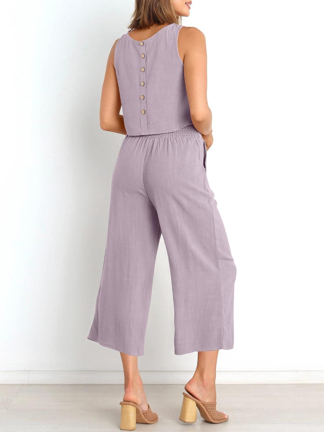ANRABESS Women's Summer 2 Piece Outfits Sleeveless Crop Top Capri Wide Leg Pants Jumpsuit Casual Linen Lounge Matching Sets 2 piece outfit features a sleeveless round neck crop top, wide-leg cropped pants, button back, high waist, and a wide waistband for added comfort.