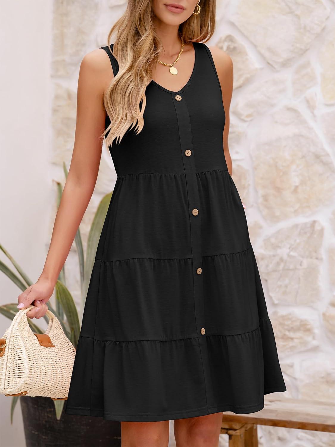 ANRABESS Womens Summer Beach Vacation Dresses V Neck Sleeveless Casual Button Down A Line Swing Mini Sundresses with Pockets(Black)