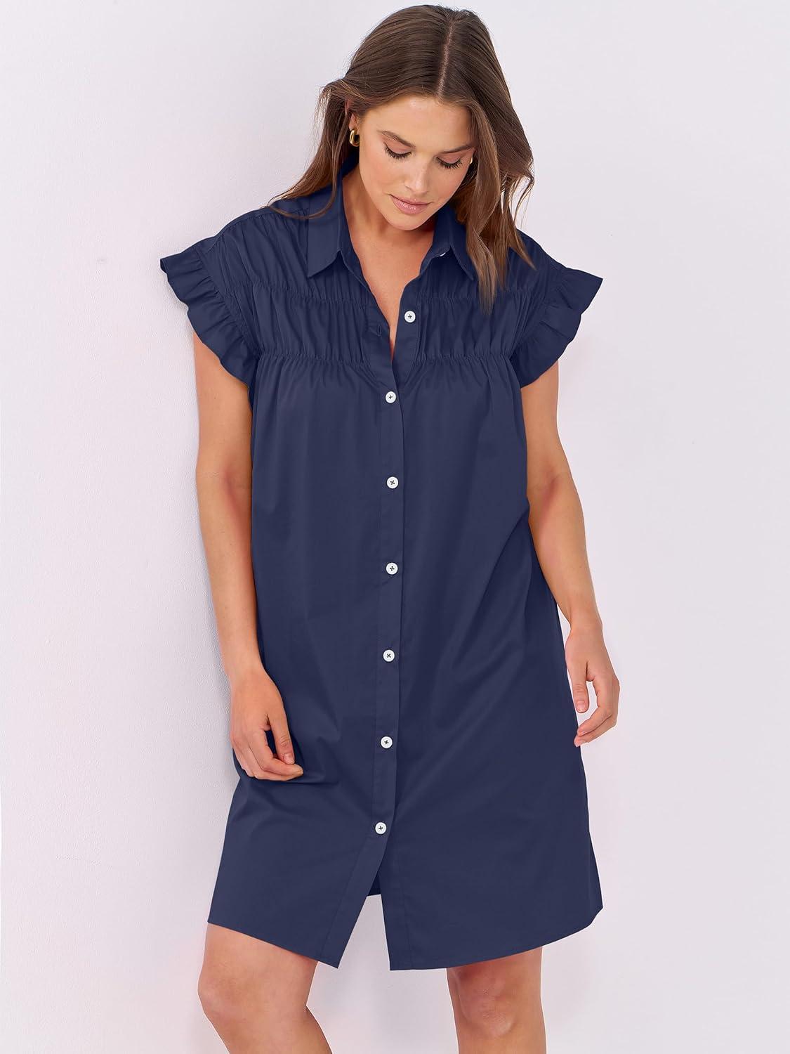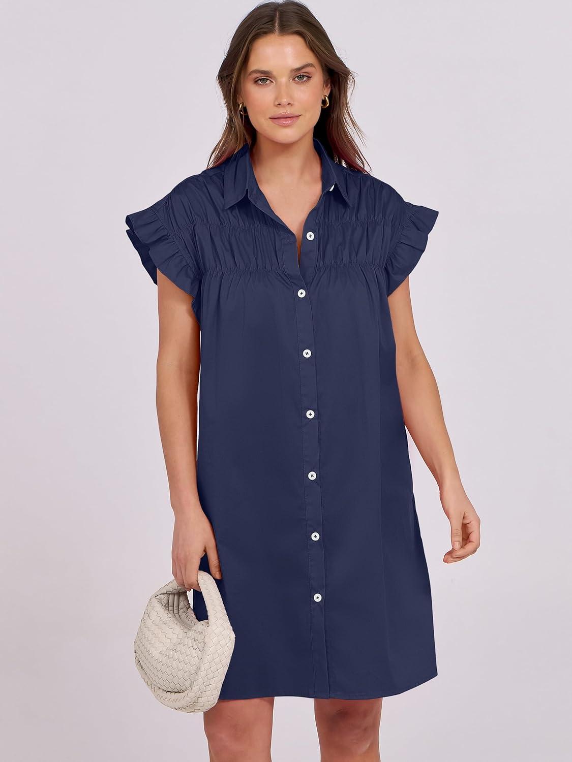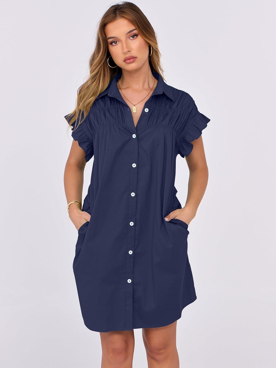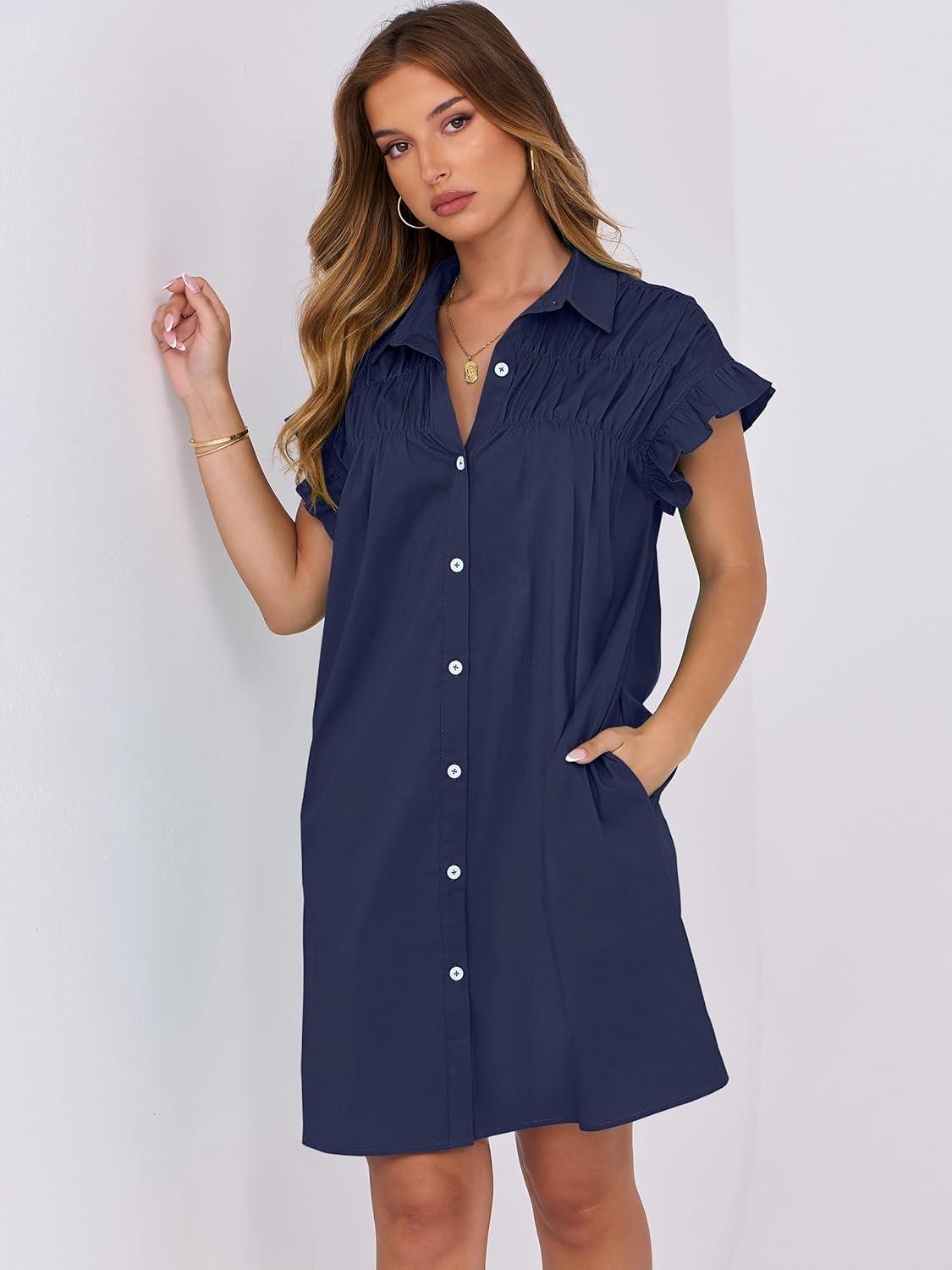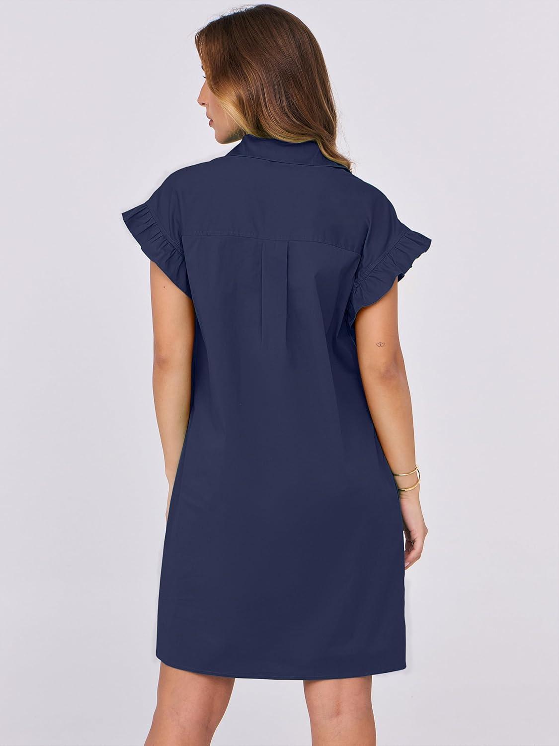 ANRABESS Womens Summer Button Down Shirt Dress Ruffle Short Sleeve Mini Dresses Loose Fit Casual Sundress with Pockets(Navy Blue)