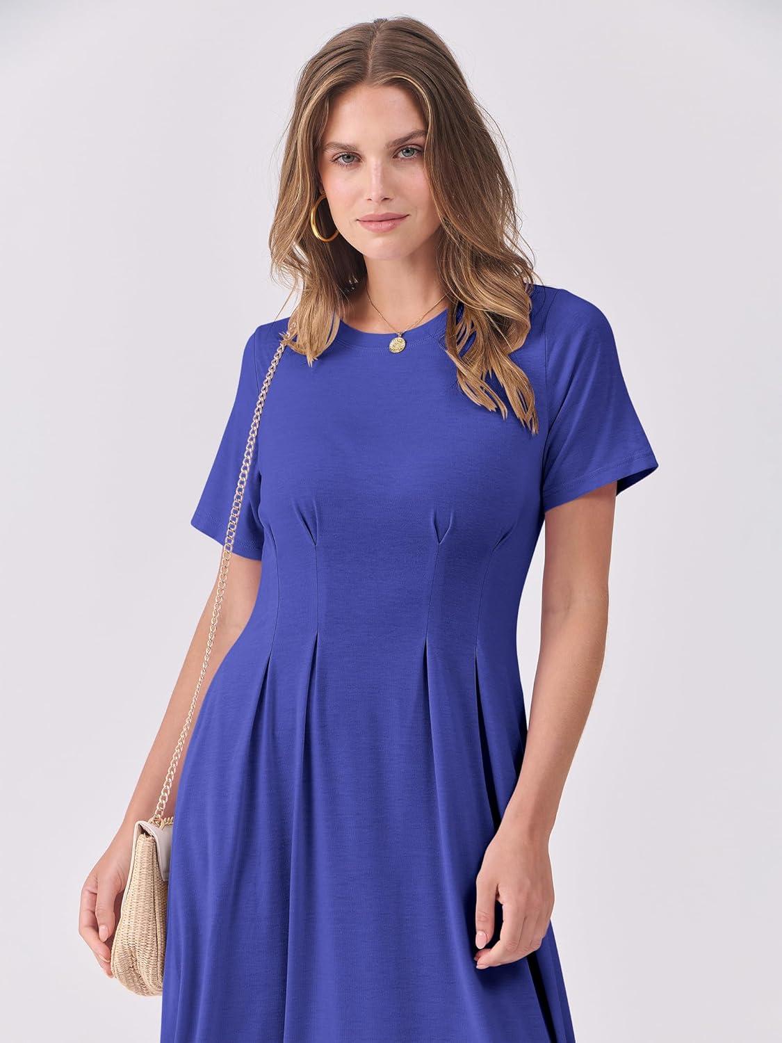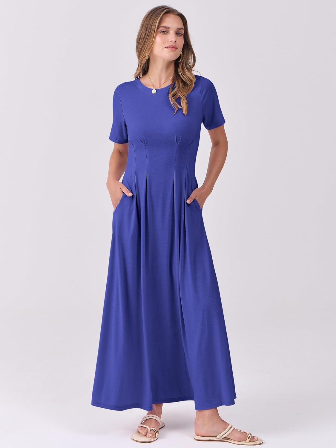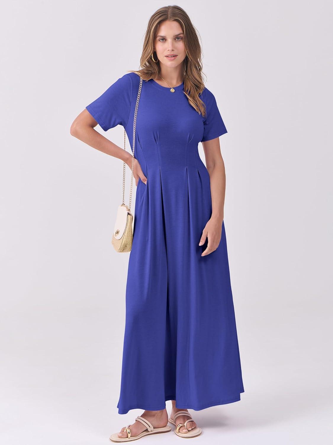 ANRABESS Women’s Summer Casual Dress Short Sleeve Crewneck Pleated Waisted Swing Flowy 2025 A Line Beach Maxi Long Dresses(Royal Blue)
