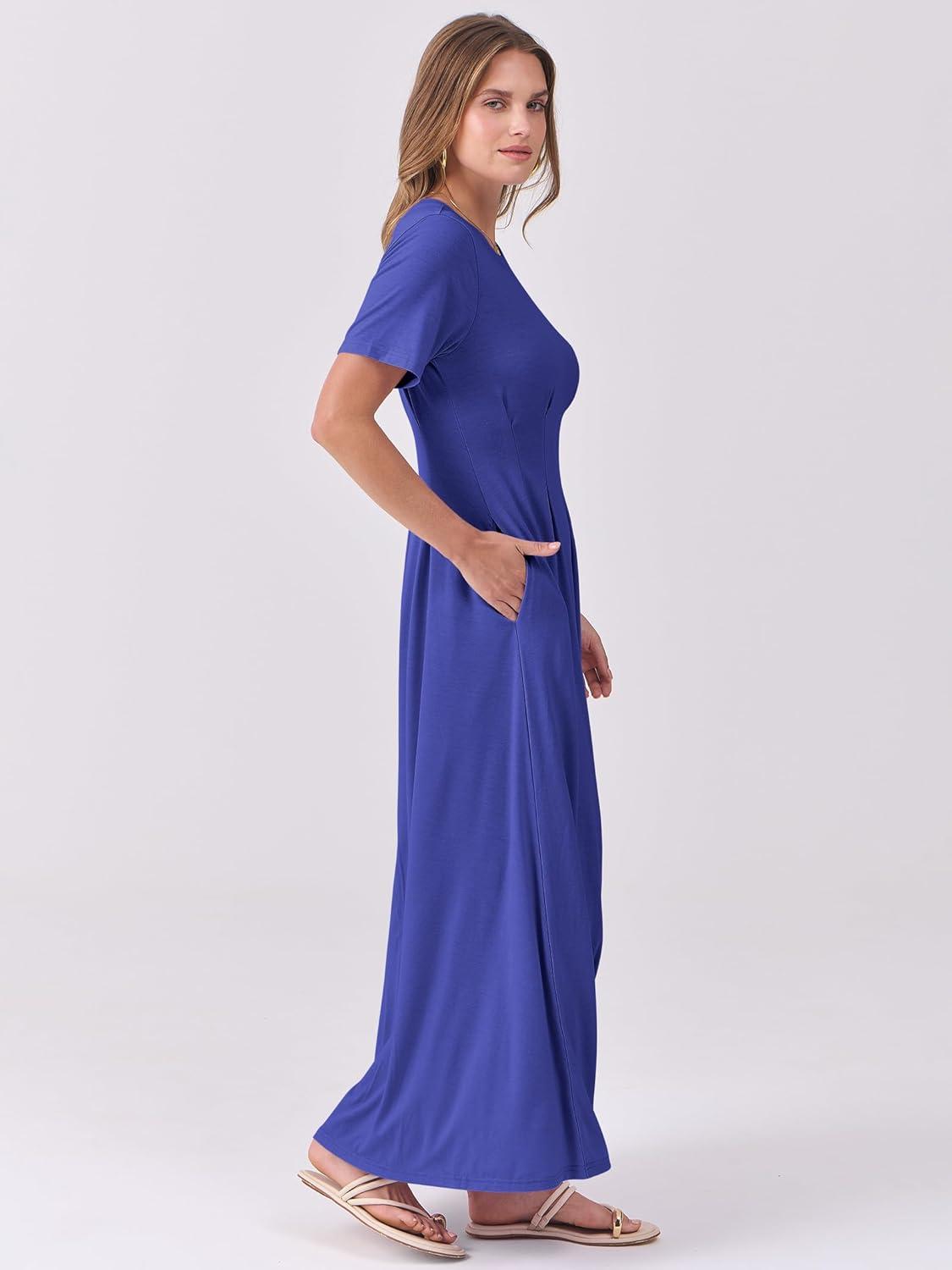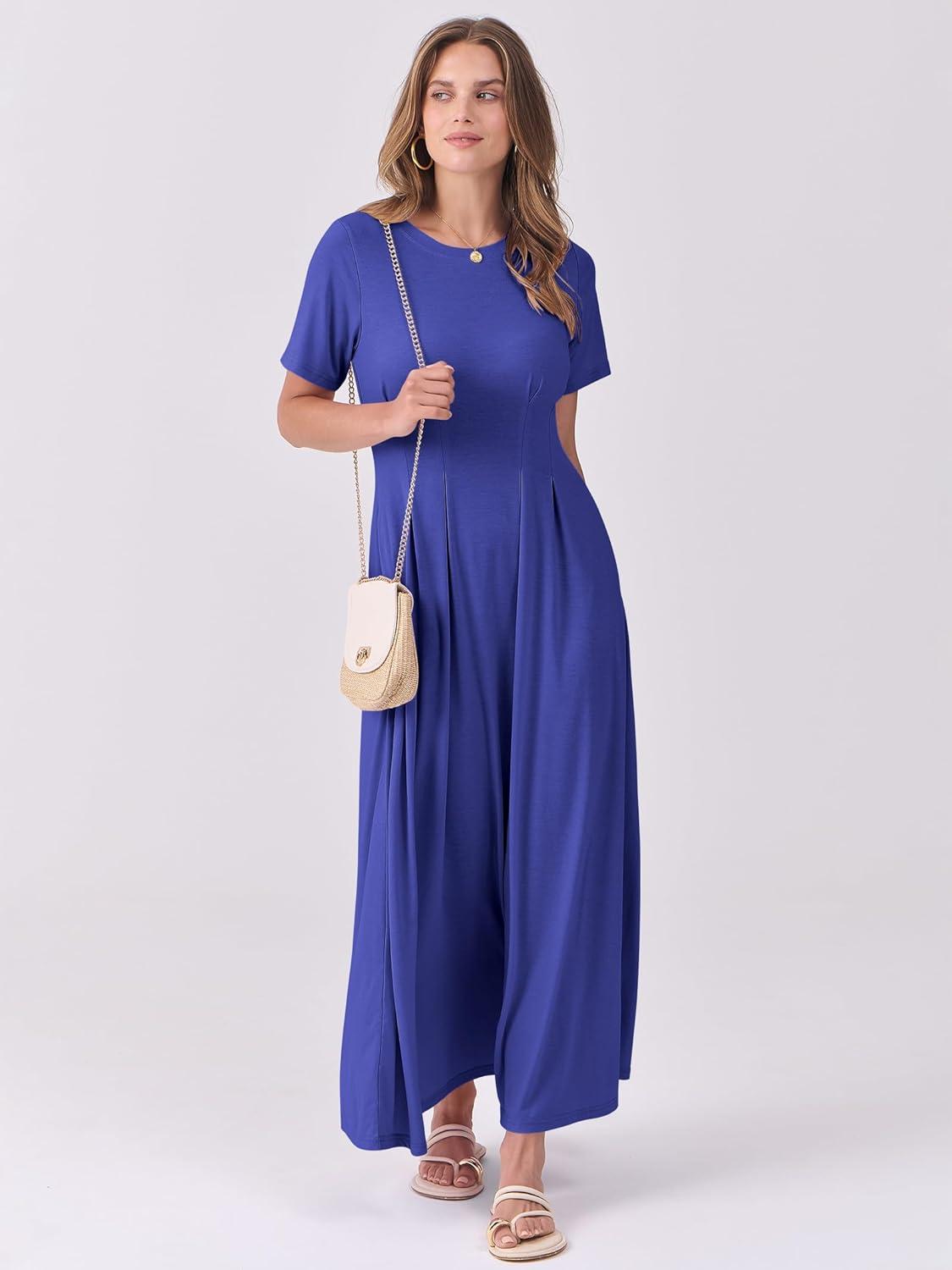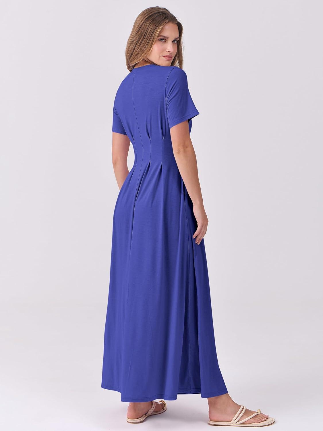 ANRABESS Women’s Summer Casual Dress Short Sleeve Crewneck Pleated Waisted Swing Flowy 2025 A Line Beach Maxi Long Dresses(Royal Blue)