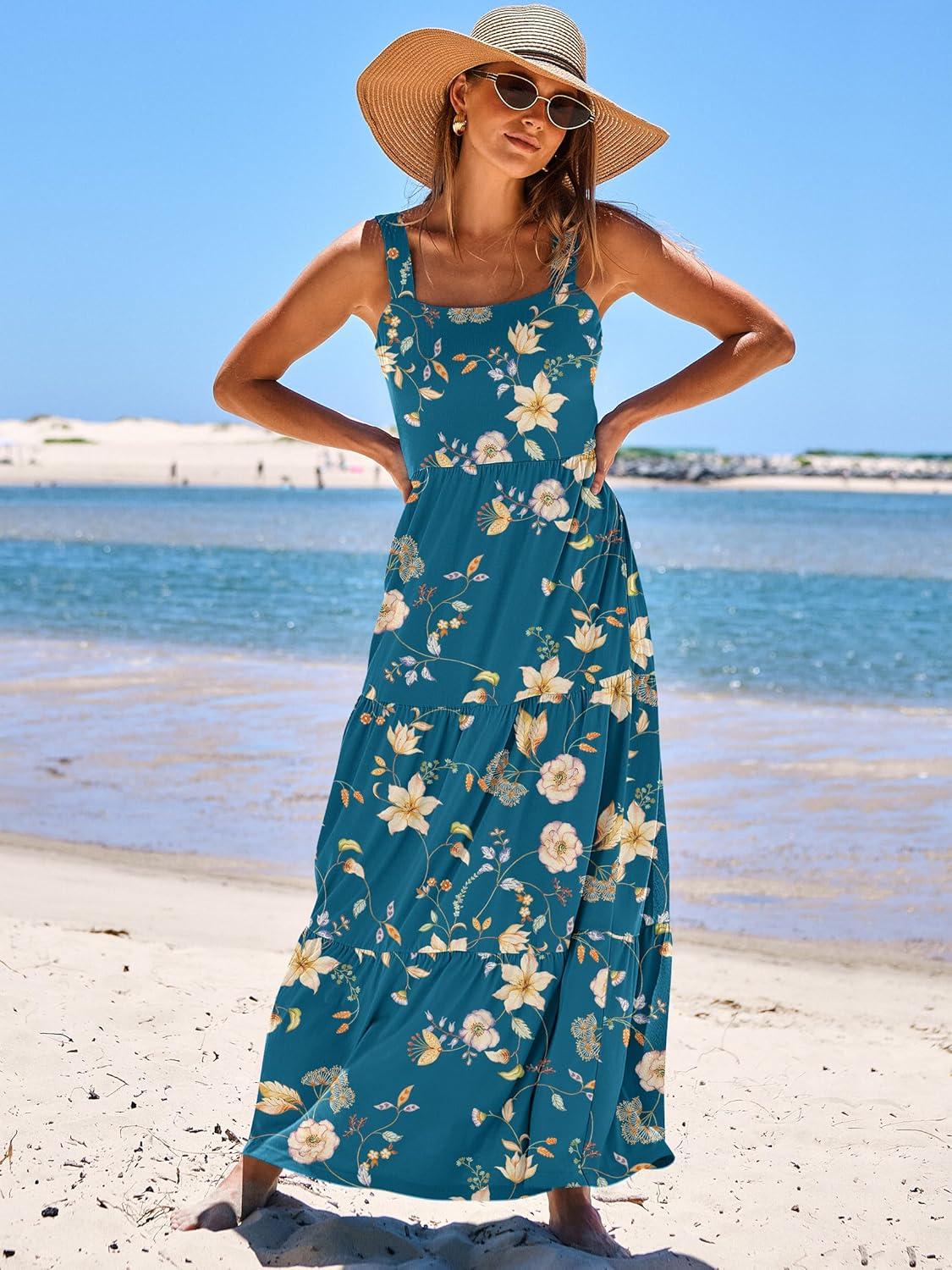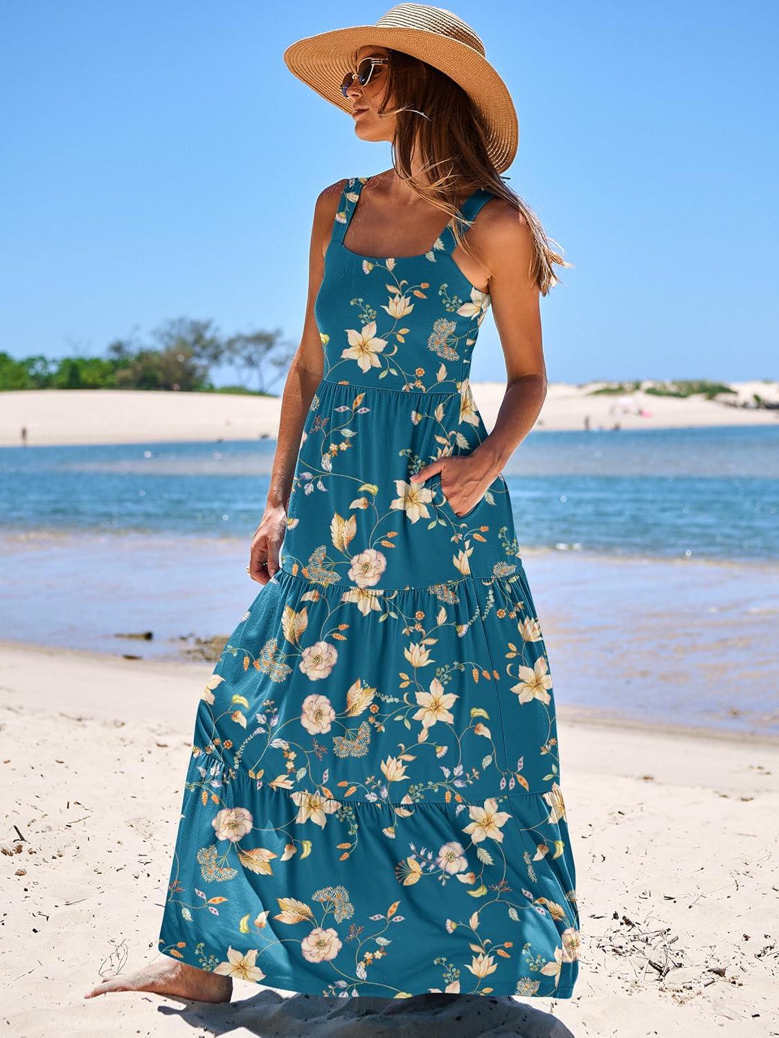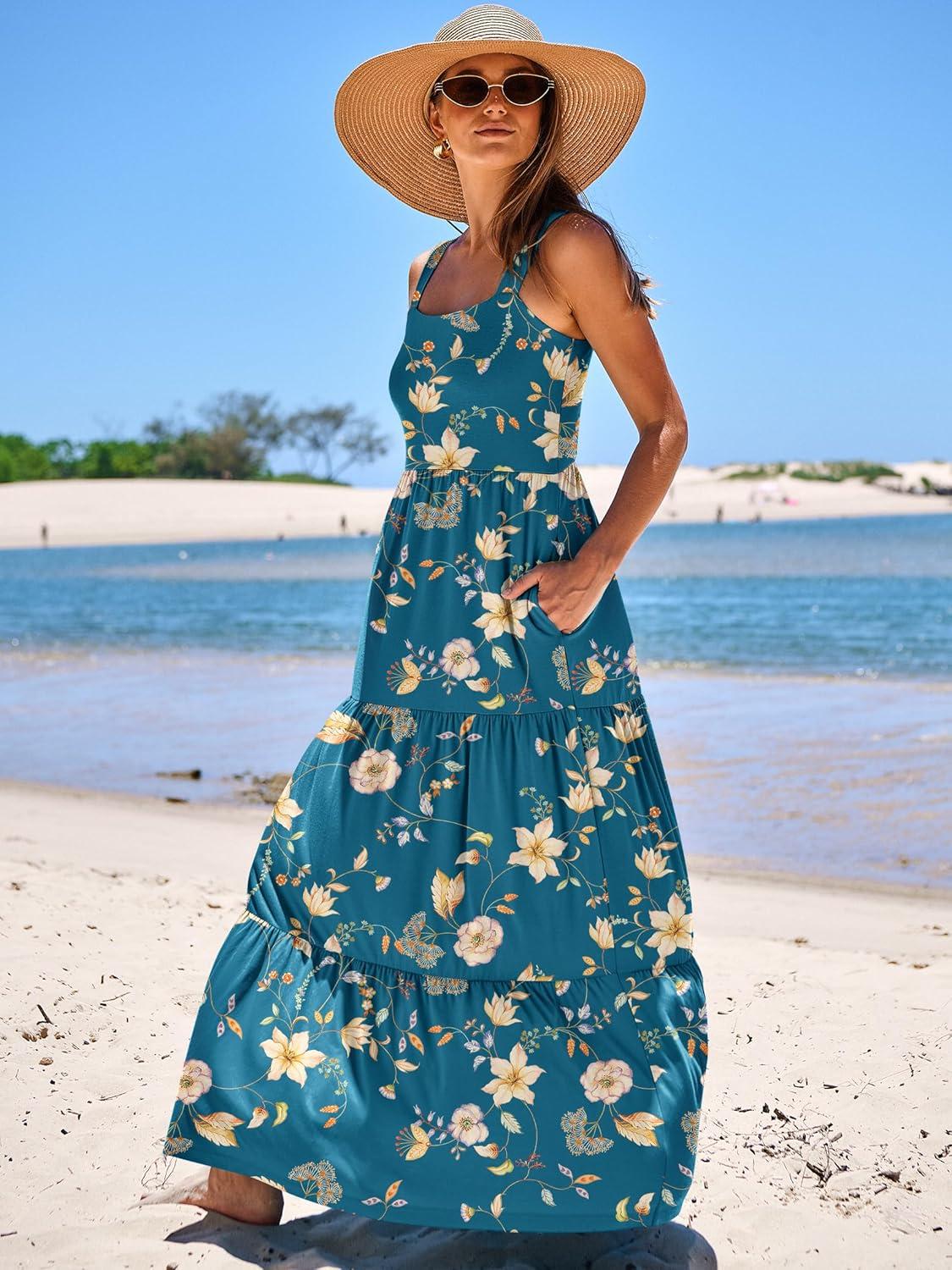 ANRABESS Women’s Summer Casual Long Maxi Beach Vacation Dresses Sleeveless Square Neck Flowy Tiered Sun Dress with Pockets(Blue Yellow Floral)