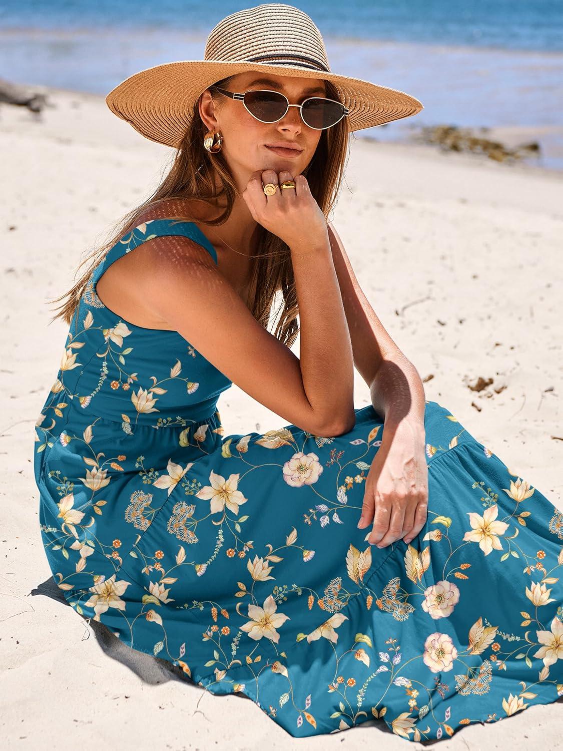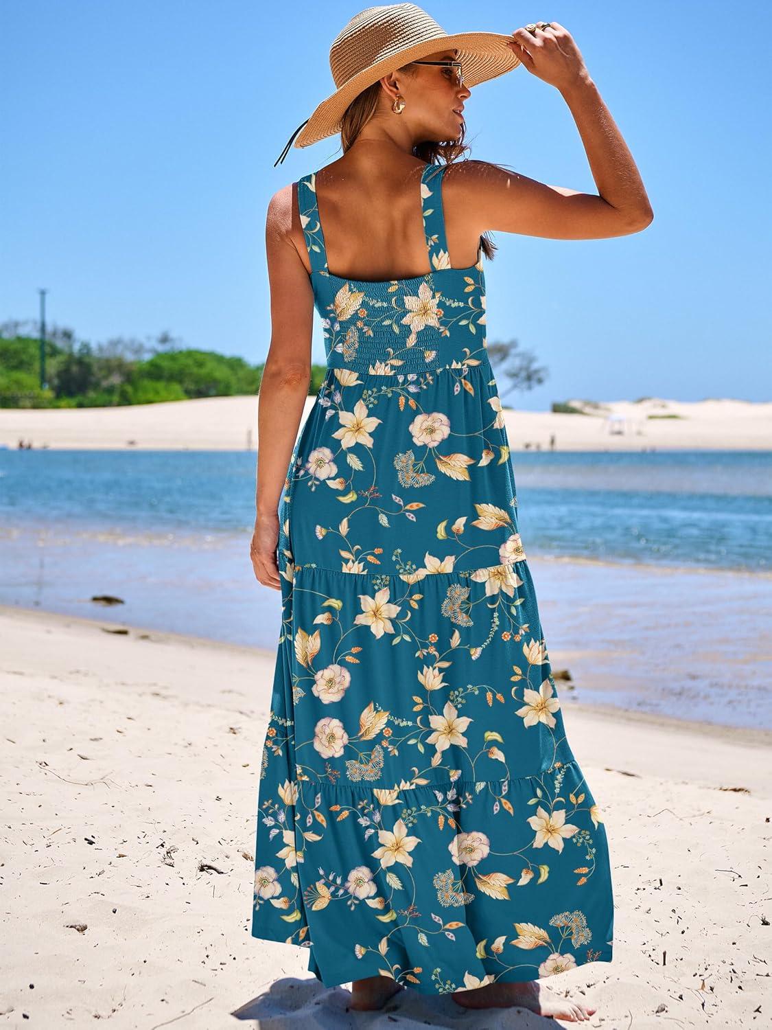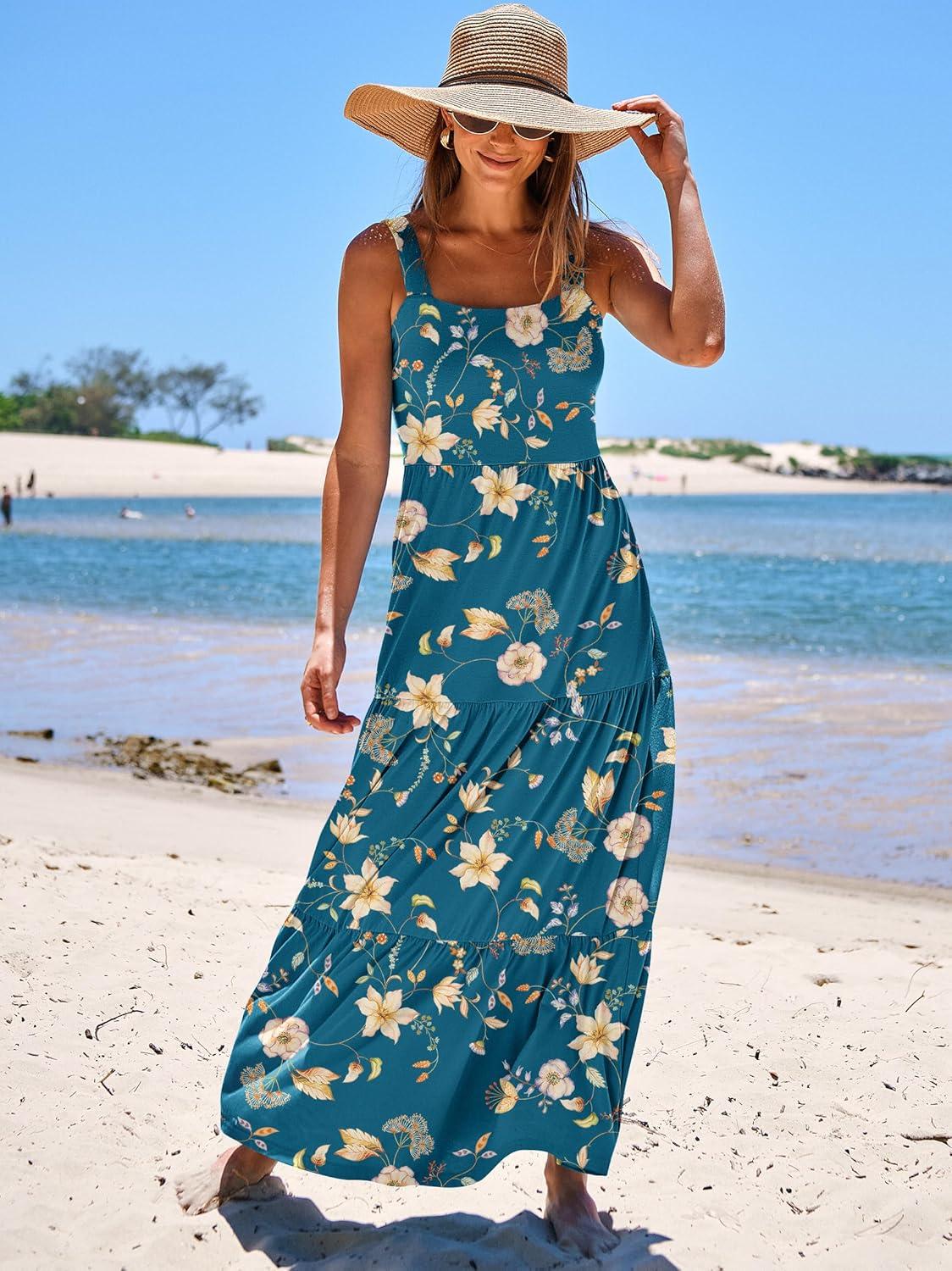 ANRABESS Women’s Summer Casual Long Maxi Beach Vacation Dresses Sleeveless Square Neck Flowy Tiered Sun Dress with Pockets(Blue Yellow Floral)