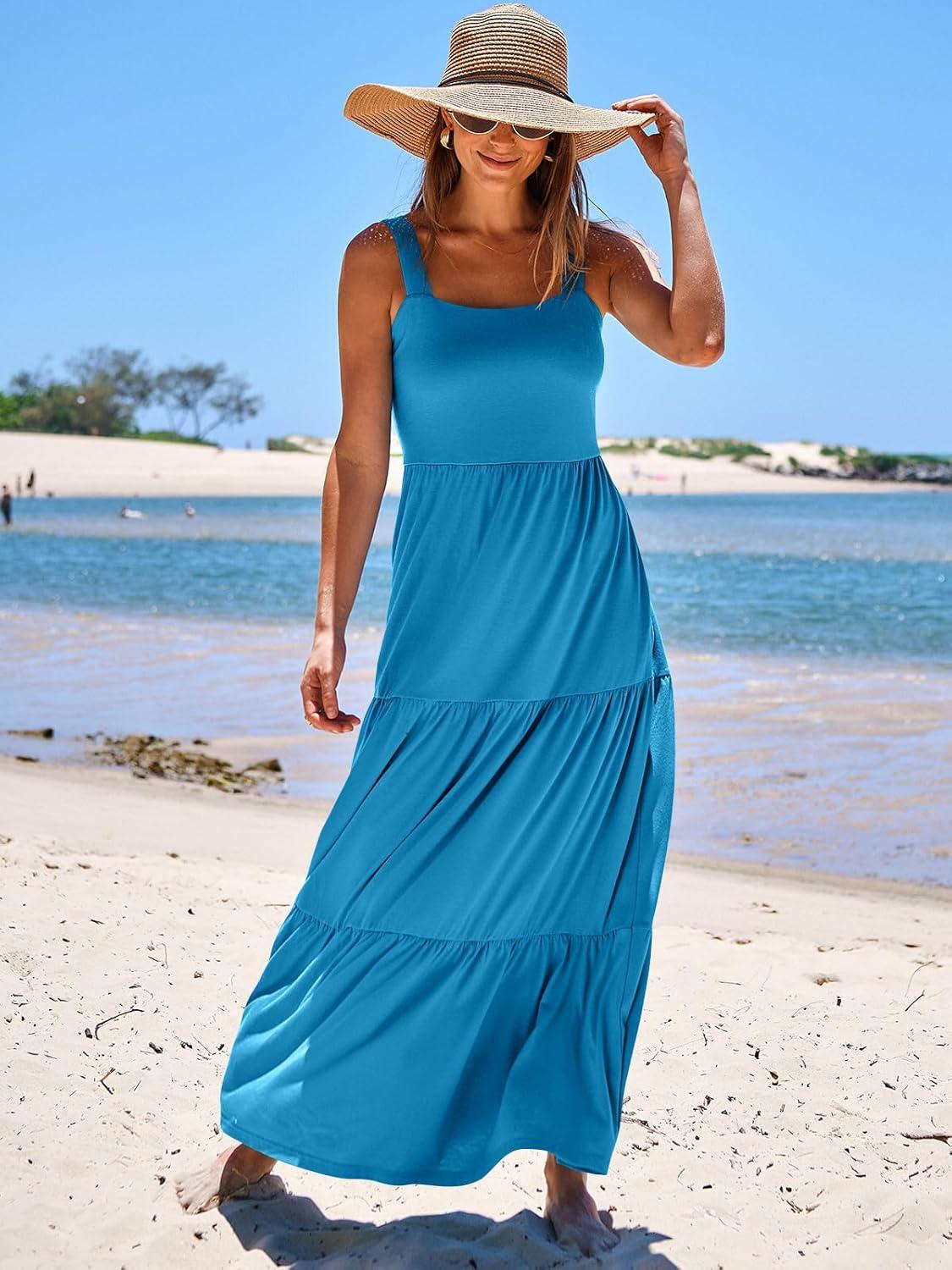 ANRABESS Women’s Summer Casual Long Maxi Beach Vacation Dresses Sleeveless Square Neck Flowy Tiered Sun Dress with Pockets(Blue)