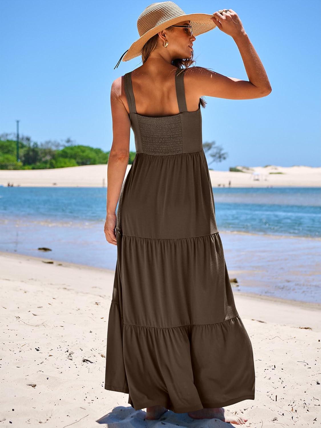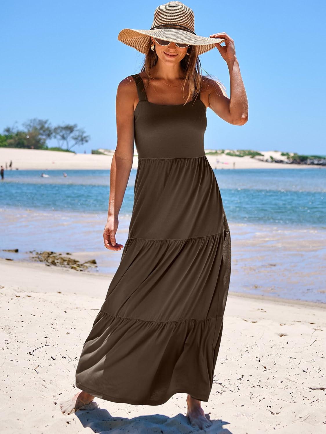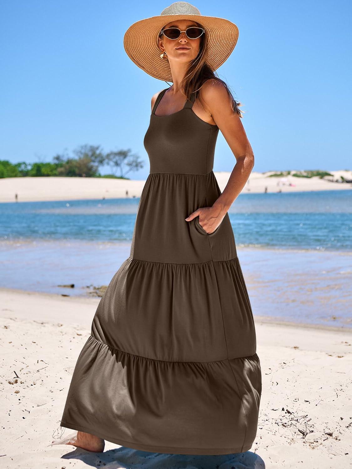 ANRABESS Women’s Summer Casual Long Maxi Beach Vacation Dresses Sleeveless Square Neck Flowy Tiered Sun Dress with Pockets(Coffee)
