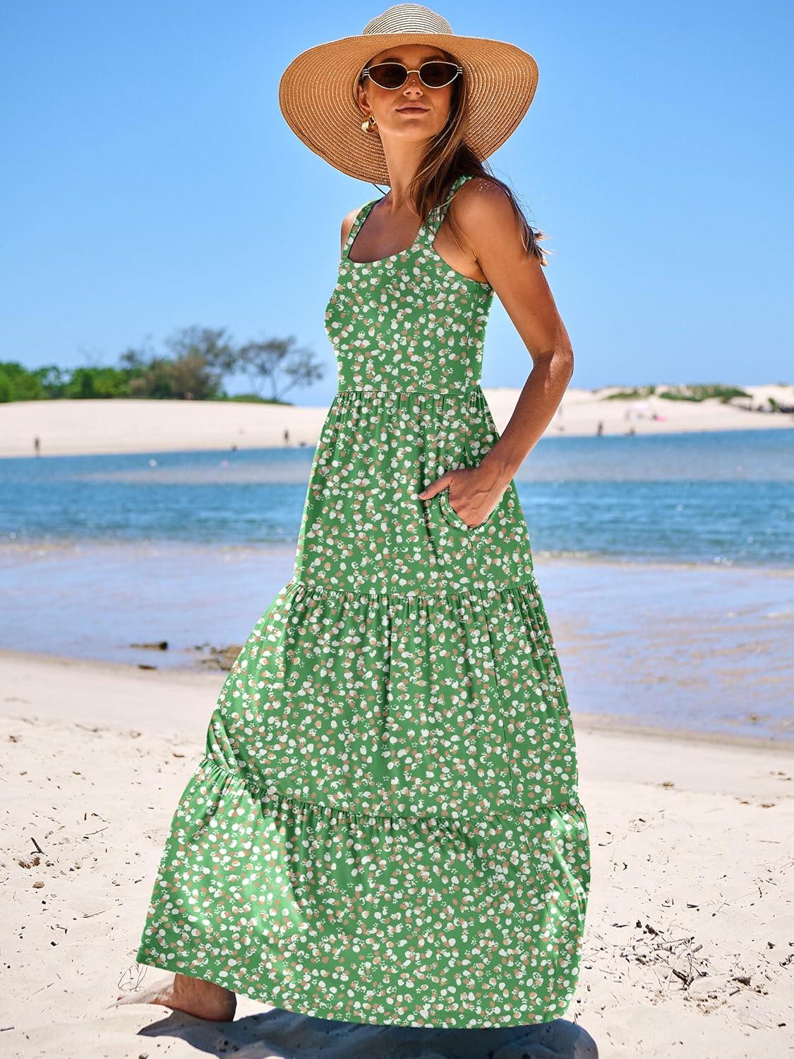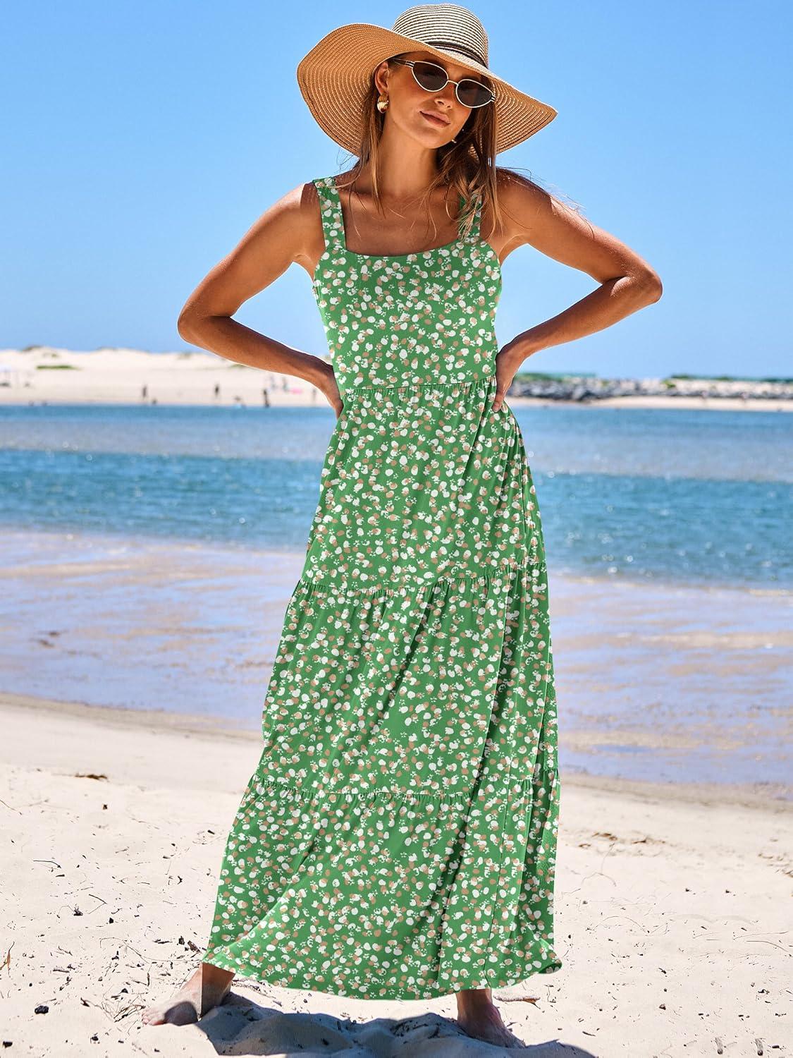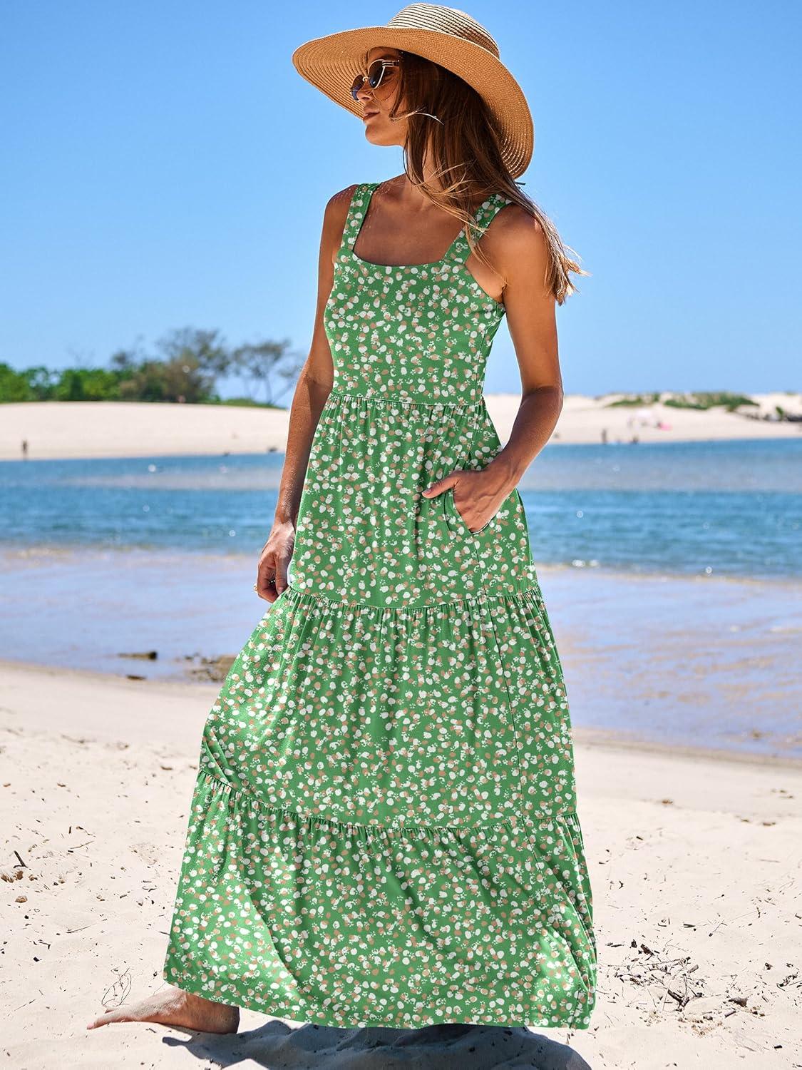 ANRABESS Women’s Summer Casual Long Maxi Beach Vacation Dresses Sleeveless Square Neck Flowy Tiered Sun Dress with Pockets(Green White Point)