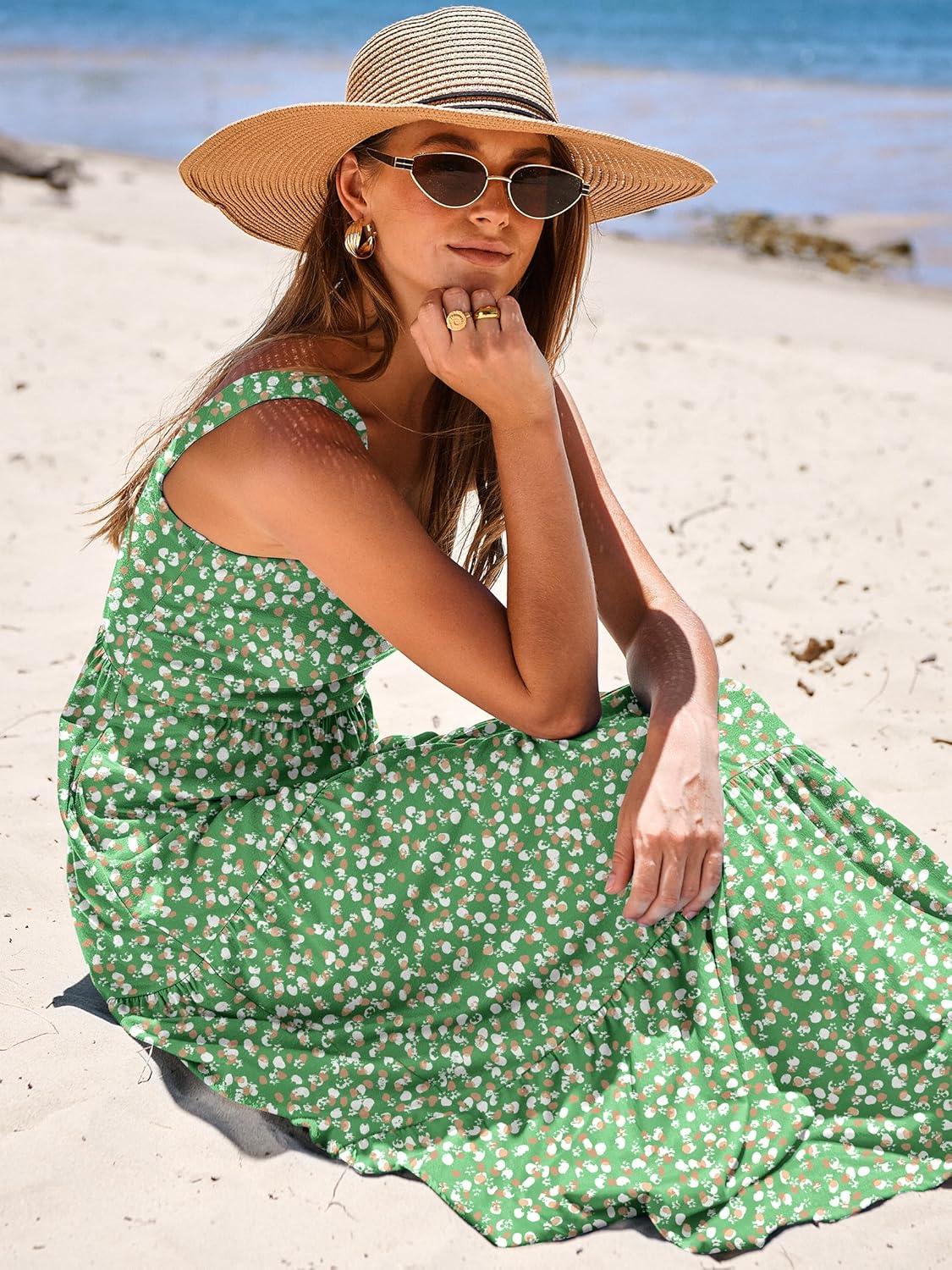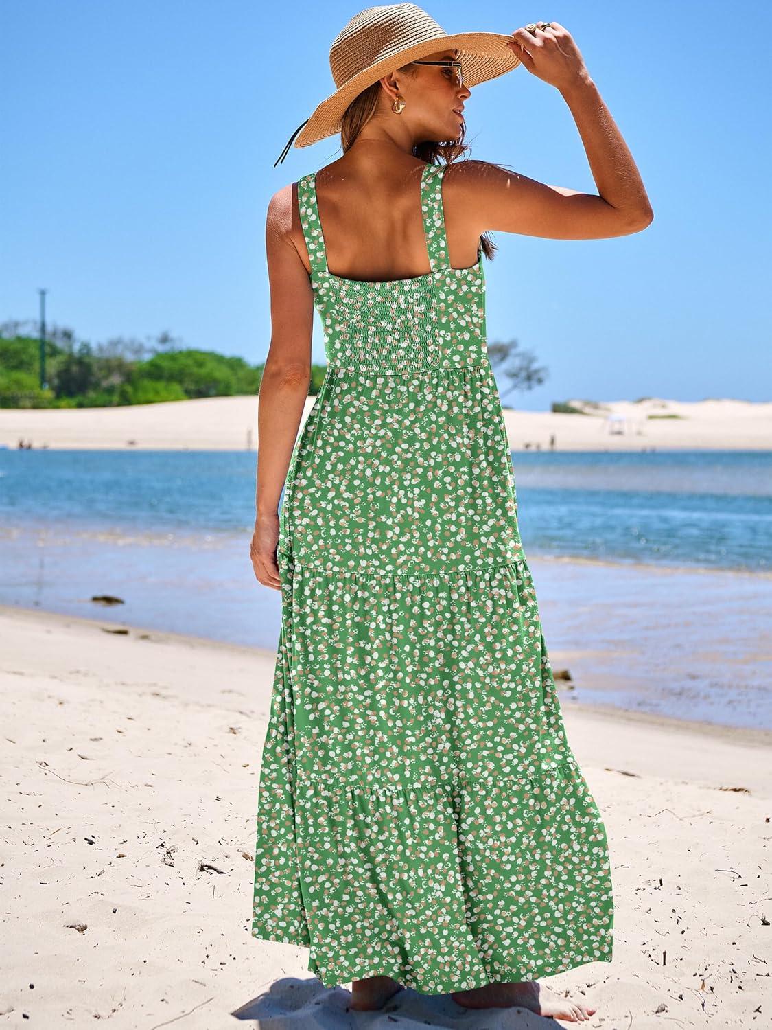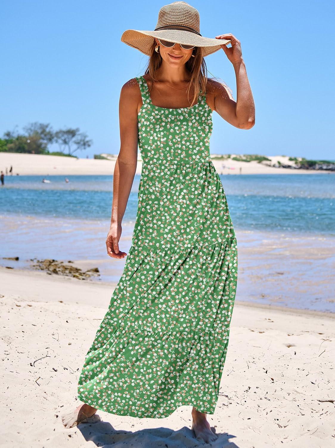 ANRABESS Women’s Summer Casual Long Maxi Beach Vacation Dresses Sleeveless Square Neck Flowy Tiered Sun Dress with Pockets(Green White Point)