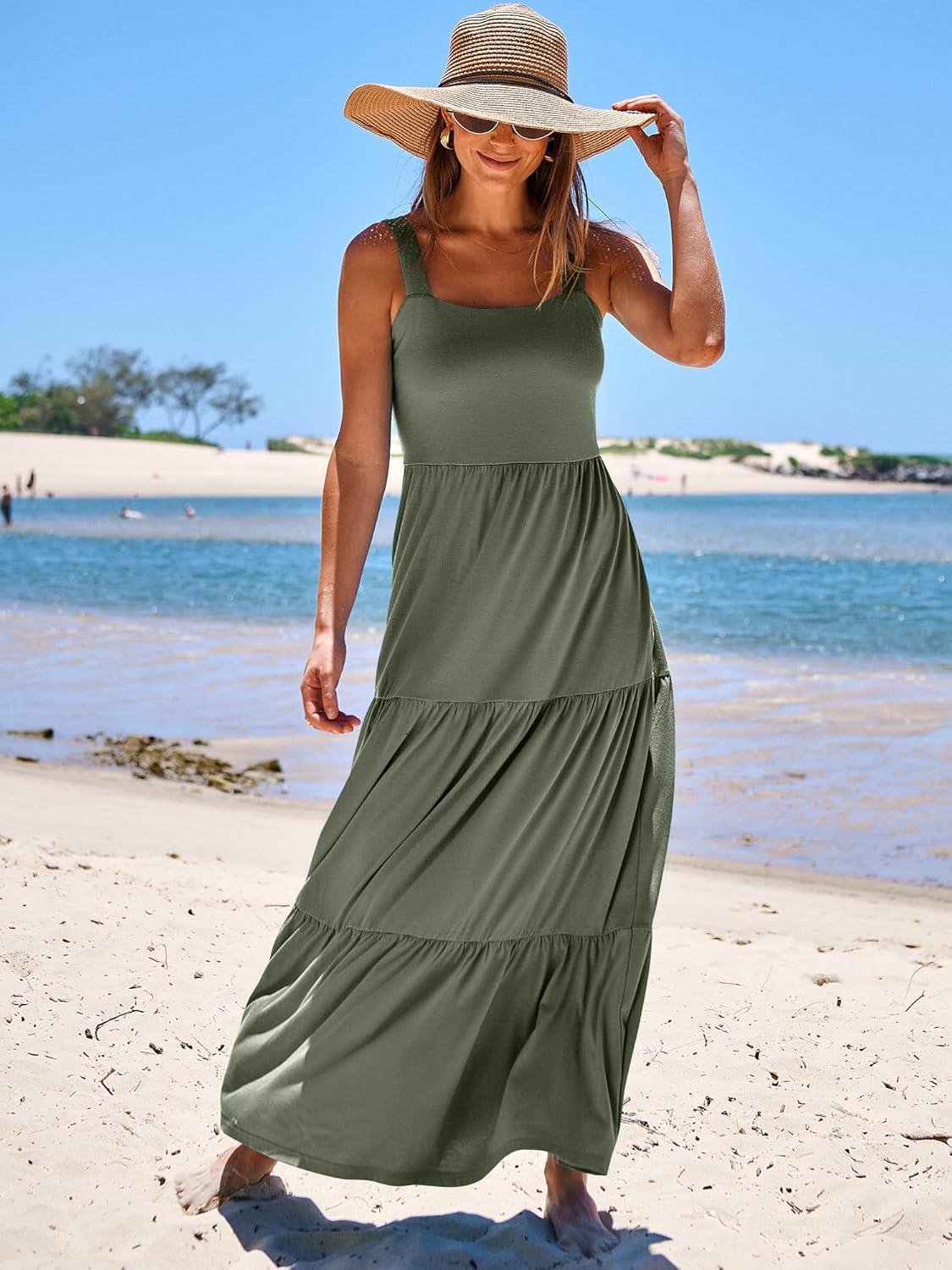 ANRABESS Women’s Summer Casual Long Maxi Beach Vacation Dresses Sleeveless Square Neck Flowy Tiered Sun Dress with Pockets(Olive)