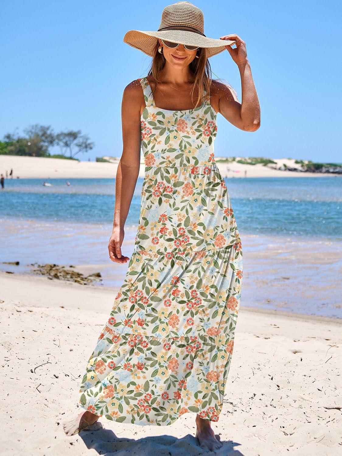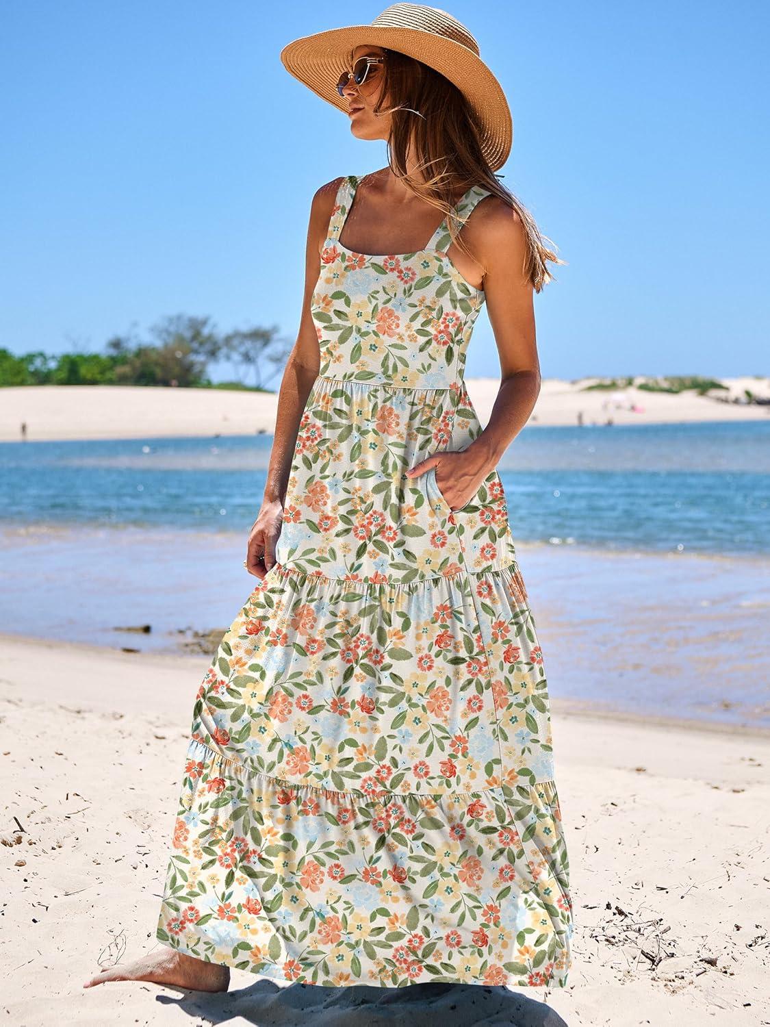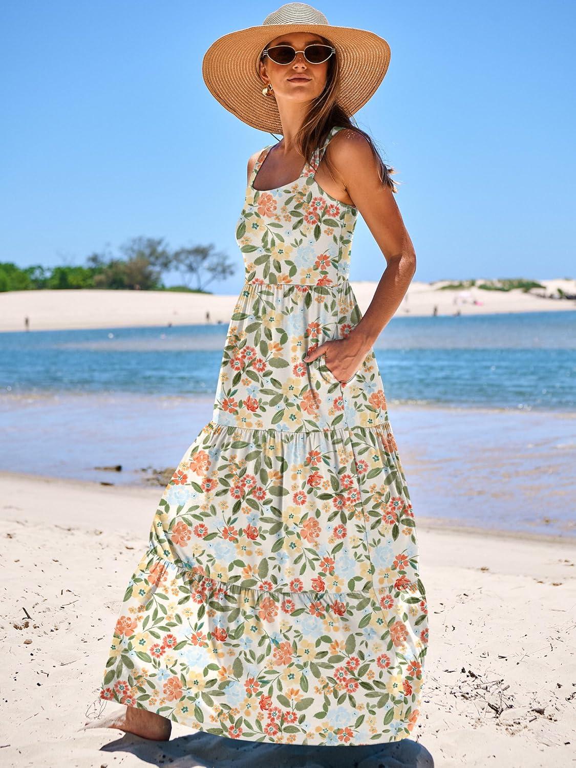 ANRABESS Women’s Summer Casual Long Maxi Beach Vacation Dresses Sleeveless Square Neck Flowy Tiered Sun Dress with Pockets(Orange Green Floral)