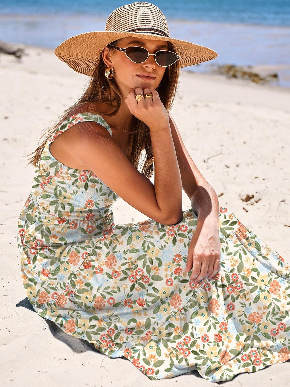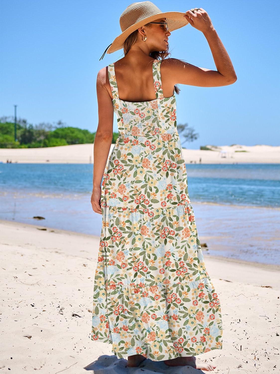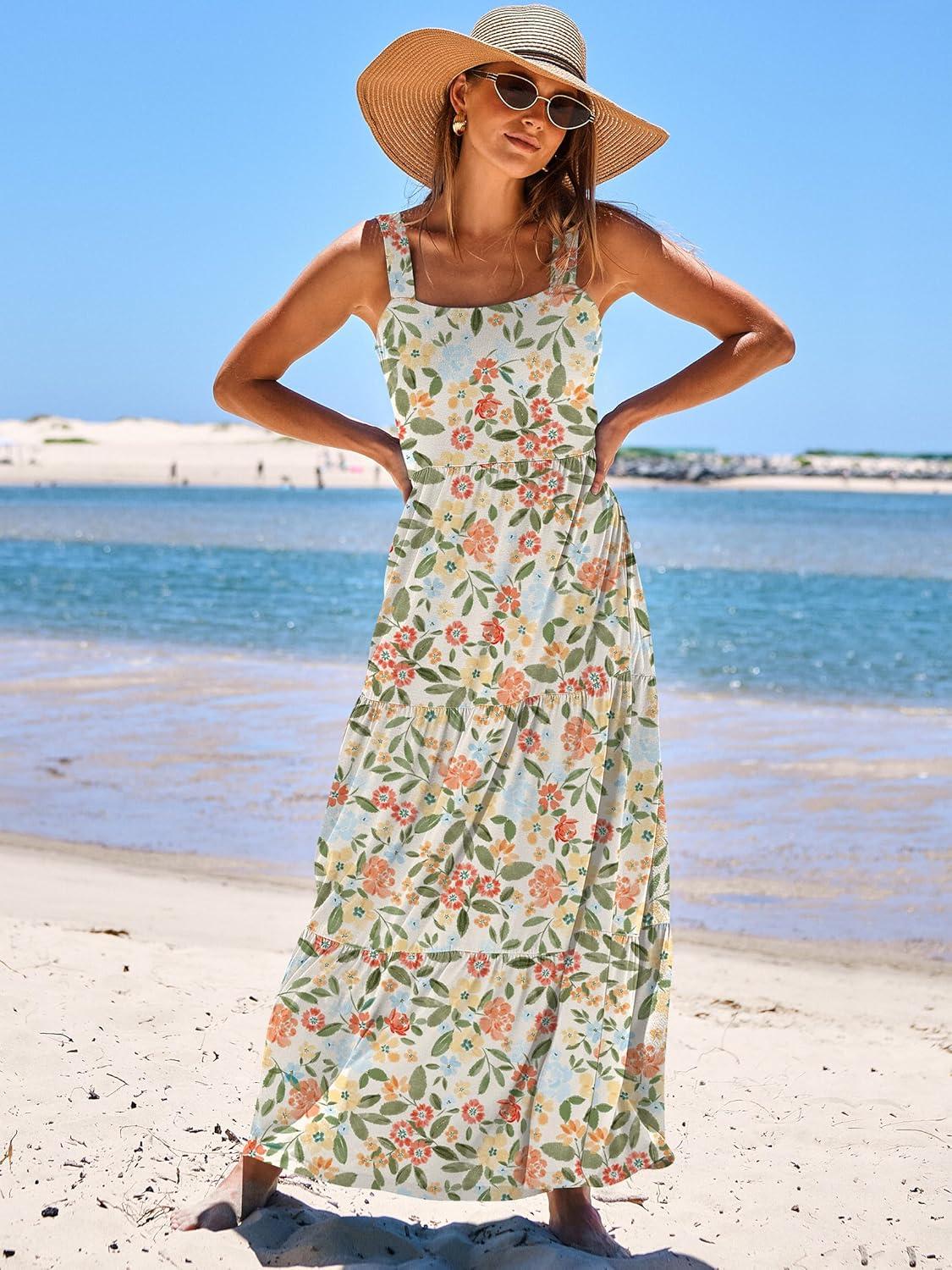 ANRABESS Women’s Summer Casual Long Maxi Beach Vacation Dresses Sleeveless Square Neck Flowy Tiered Sun Dress with Pockets(Orange Green Floral)