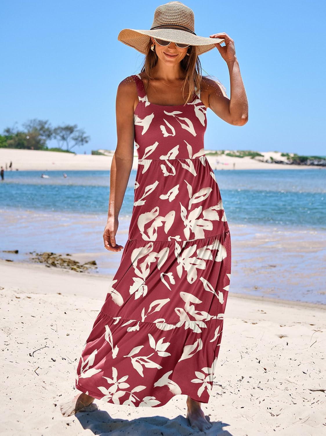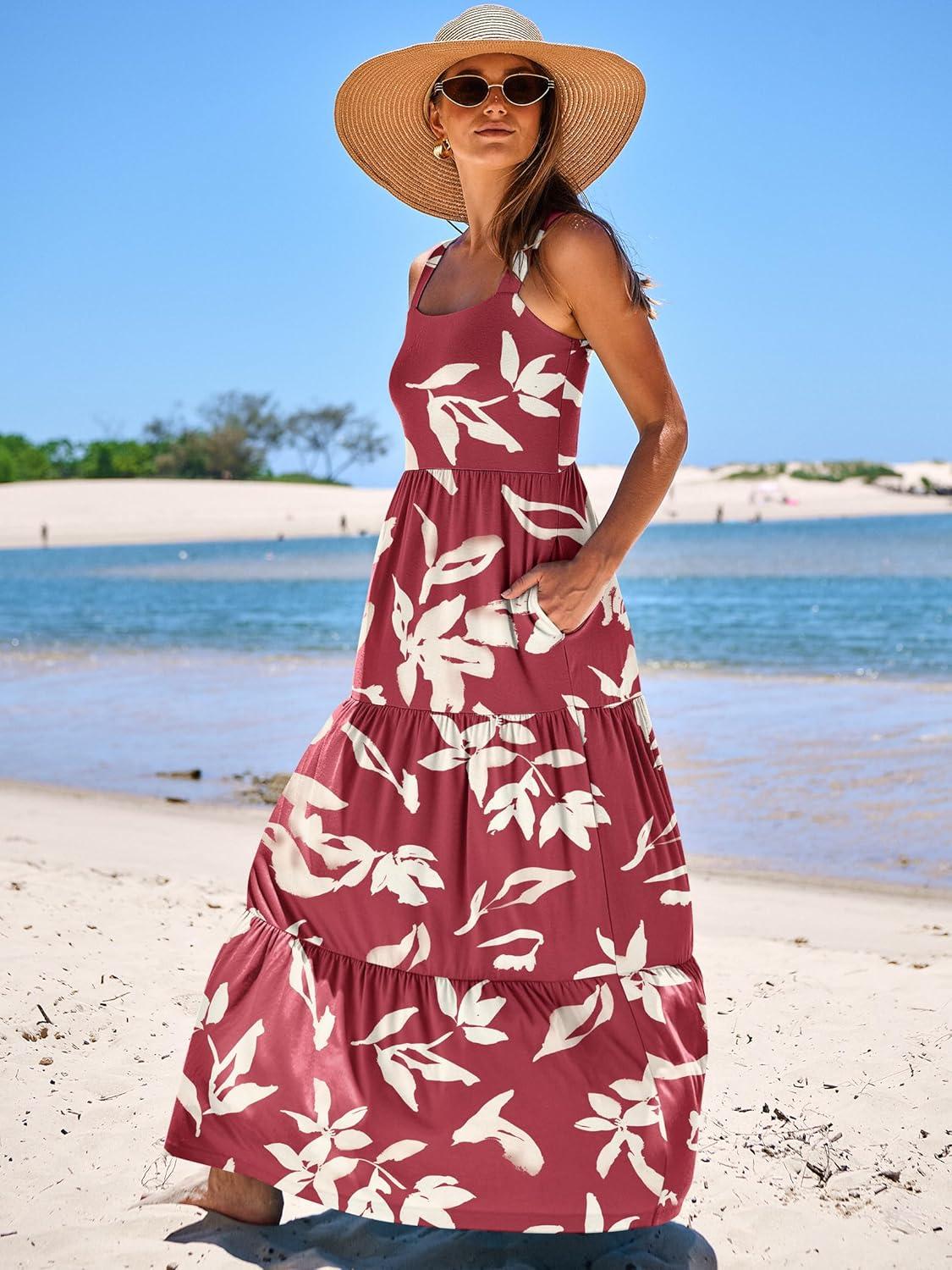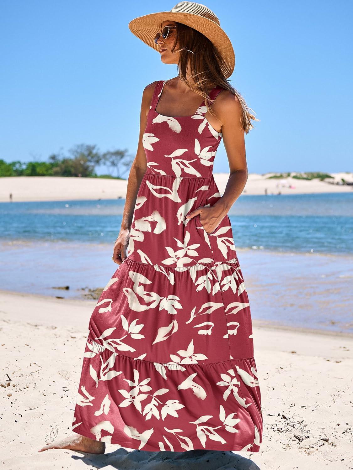 ANRABESS Women’s Summer Casual Long Maxi Beach Vacation Dresses Sleeveless Square Neck Flowy Tiered Sun Dress with Pockets(Red Yellow Floral)