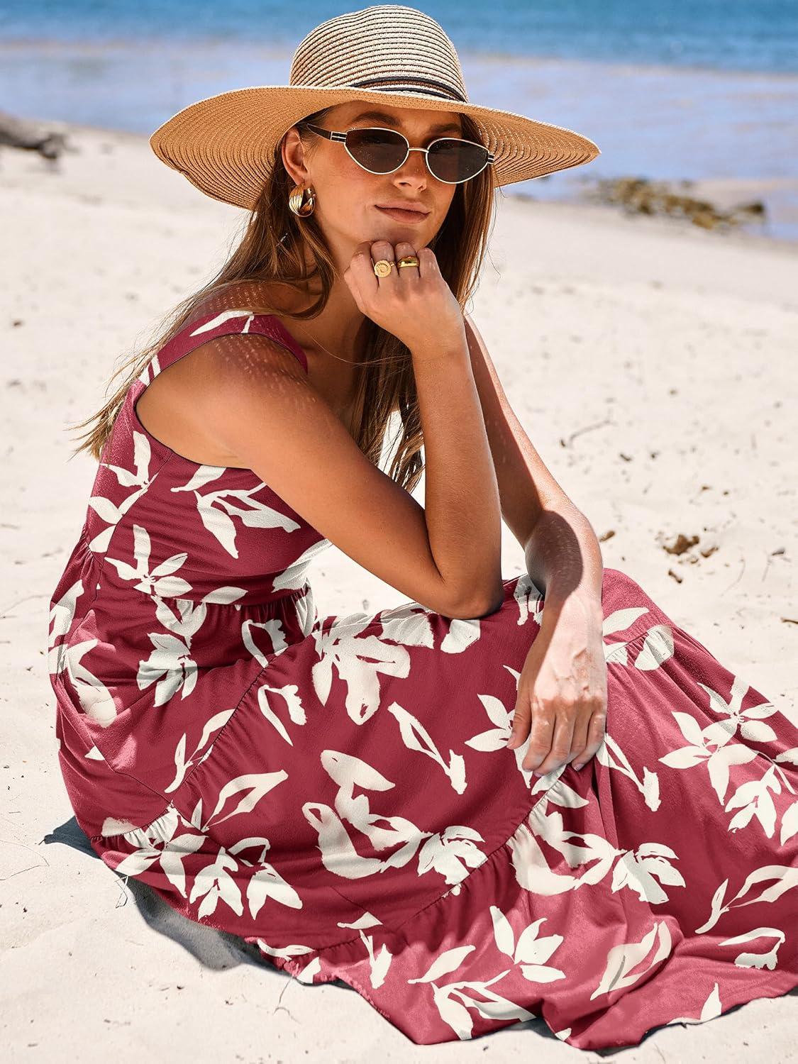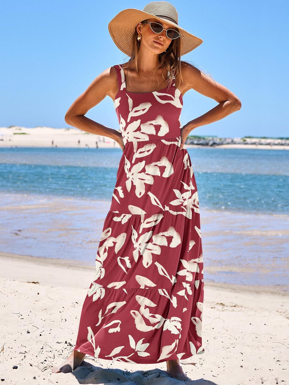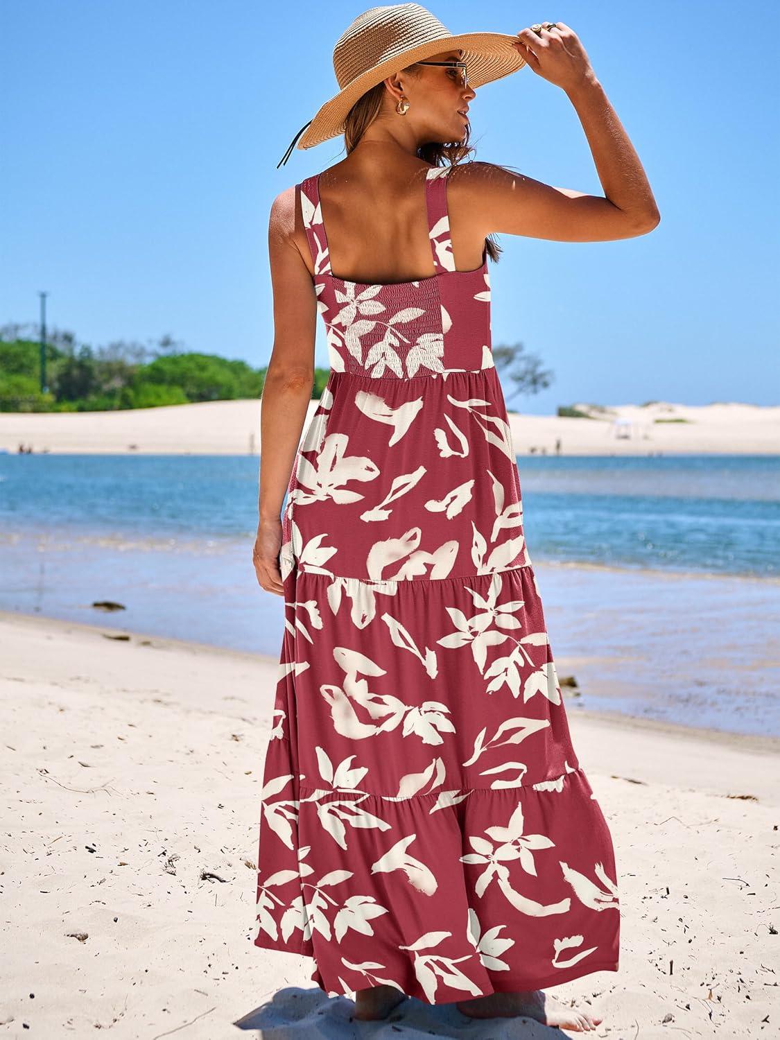 ANRABESS Women’s Summer Casual Long Maxi Beach Vacation Dresses Sleeveless Square Neck Flowy Tiered Sun Dress with Pockets(Red Yellow Floral)