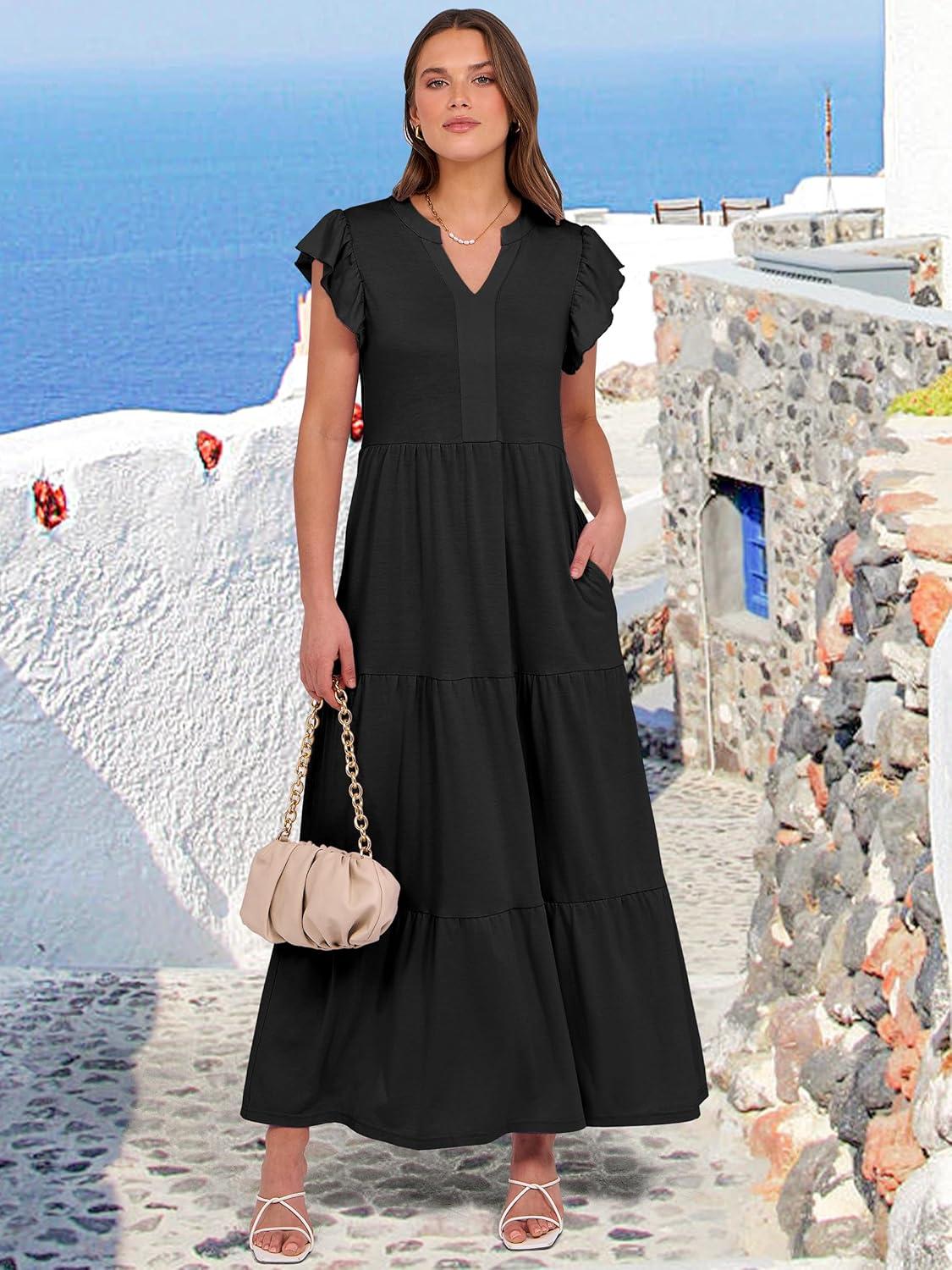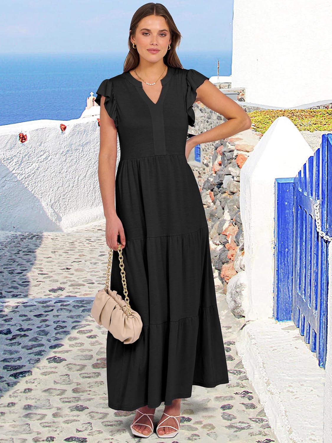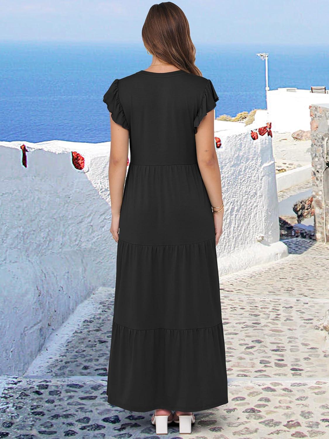 ANRABESS Womens Summer Casual Maxi Dress V Neck Ruffle Sleeve Long Dresses Fashion Flowy Tiered Boho Beach Vacation Sundress(Black)