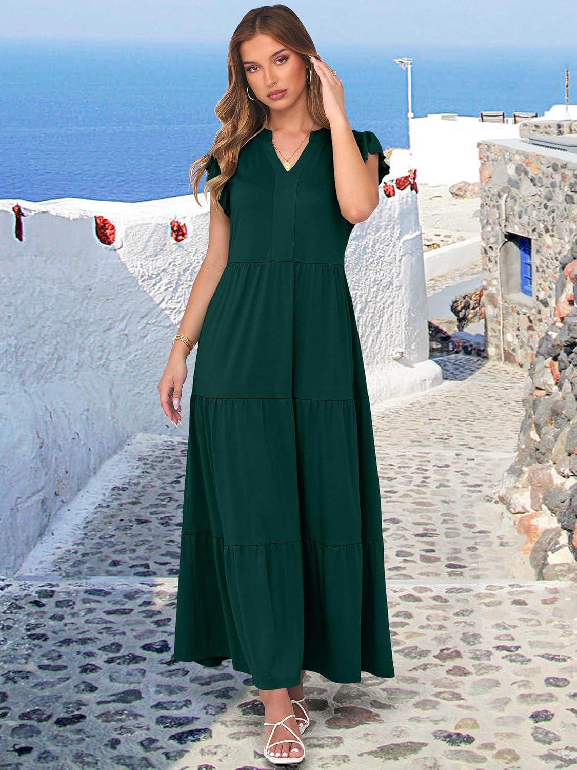 ANRABESS Womens Summer Casual Maxi Dress V Neck Ruffle Sleeve Long Dresses Fashion Flowy Tiered Boho Beach Vacation Sundress(Deep Green)