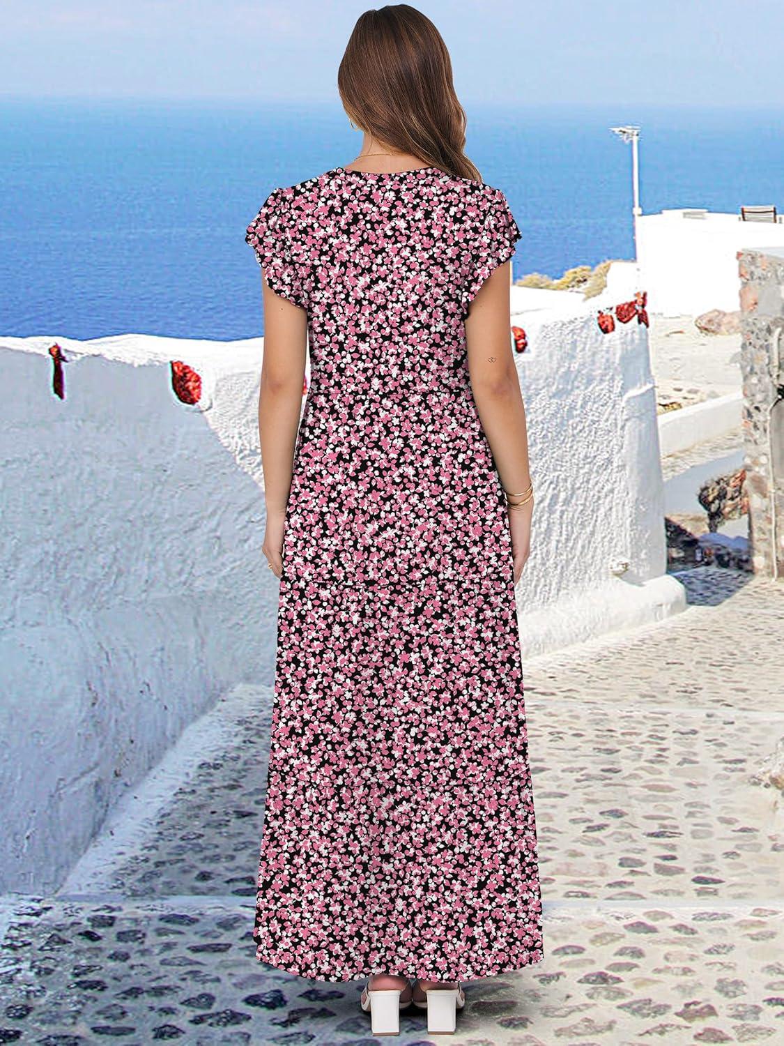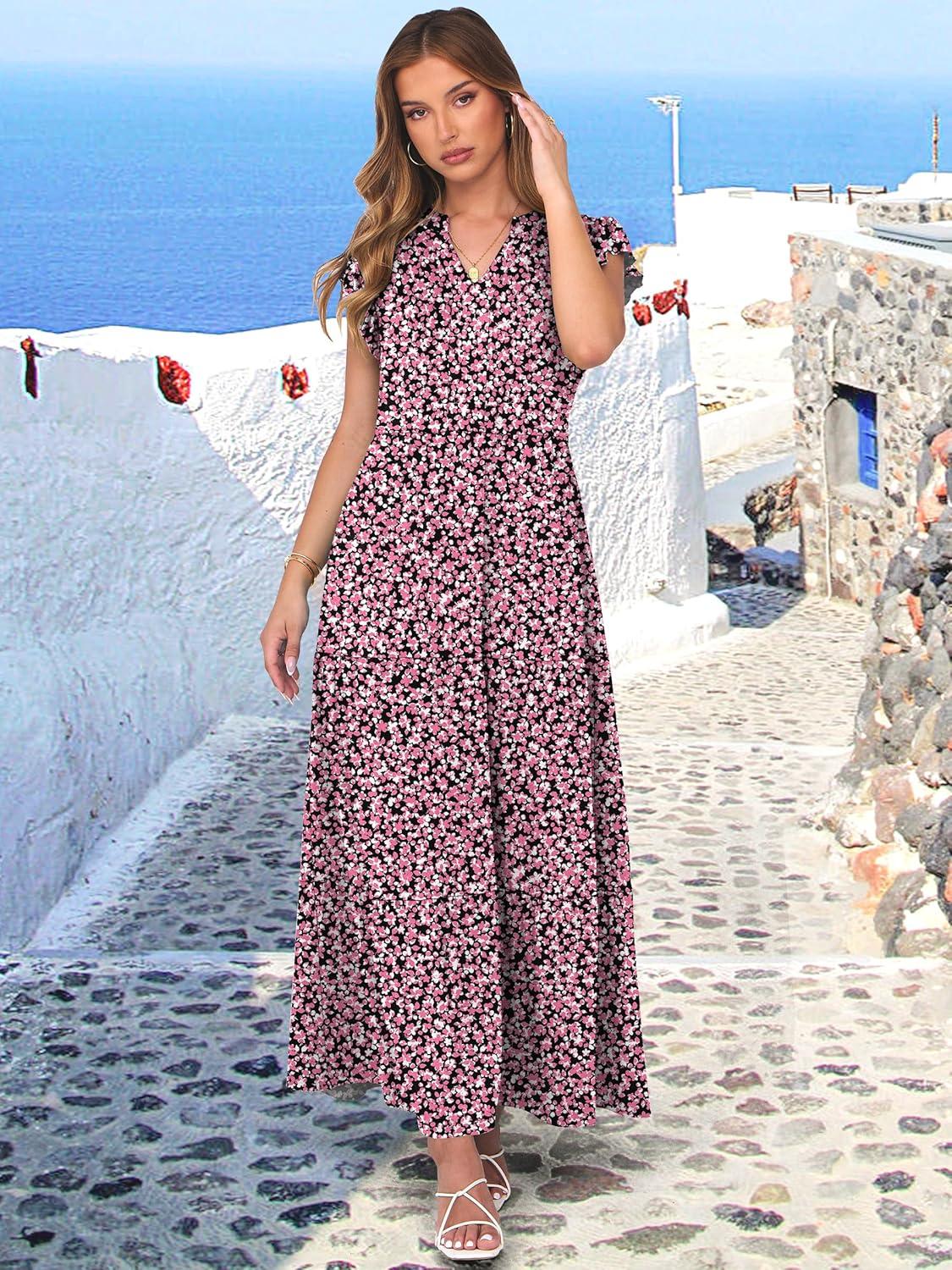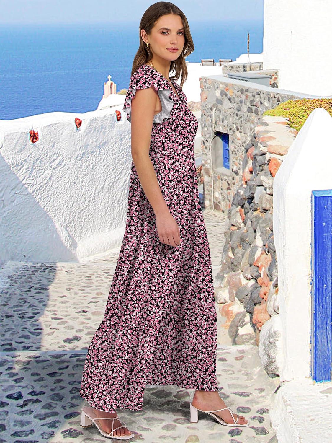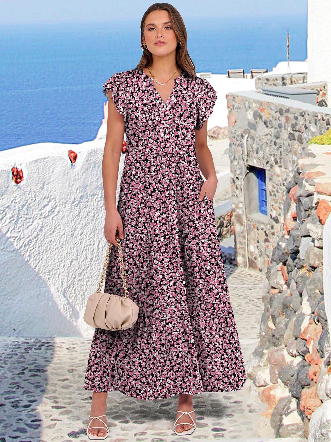 ANRABESS Womens Summer Casual Maxi Dress V Neck Ruffle Sleeve Long Dresses Fashion Flowy Tiered Boho Beach Vacation Sundress(Floral Black Pink)