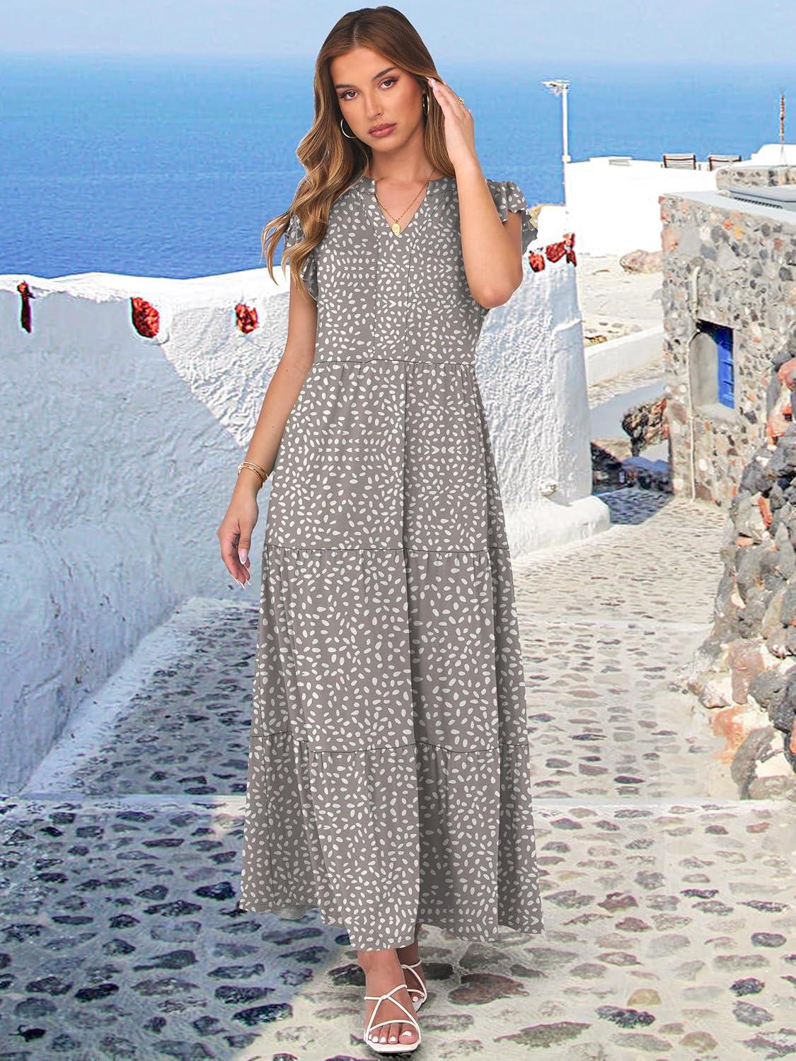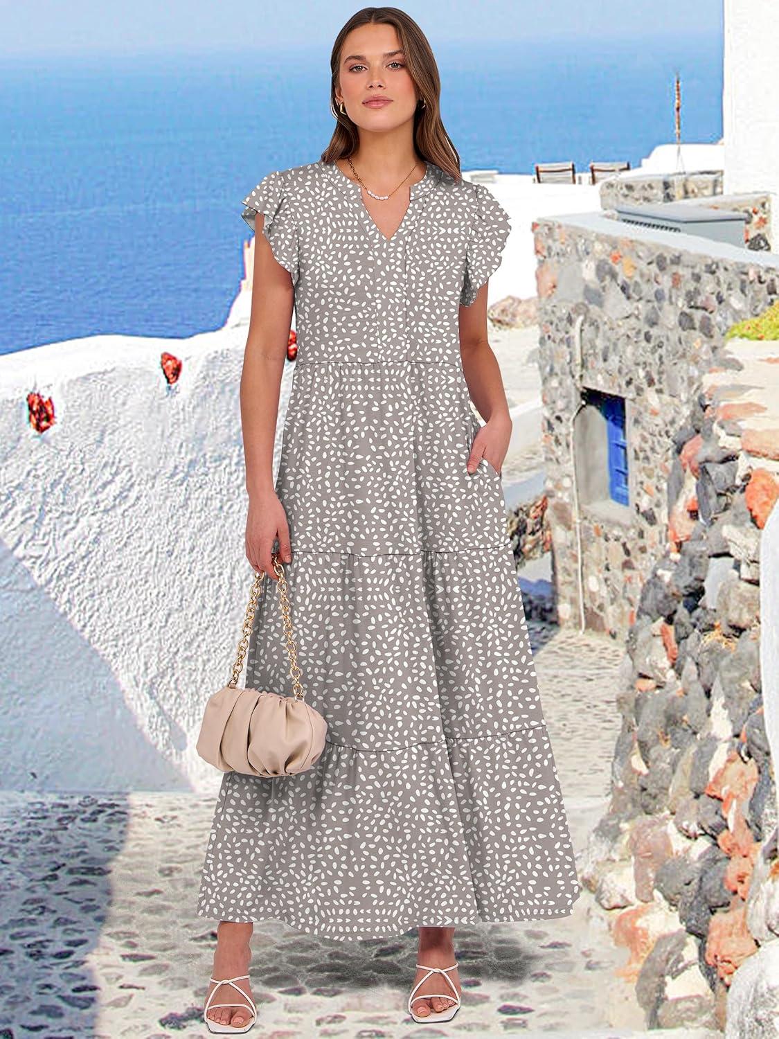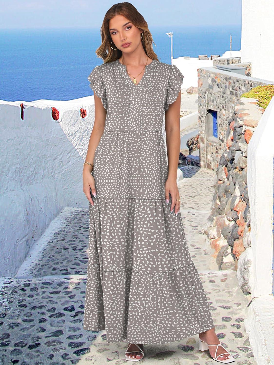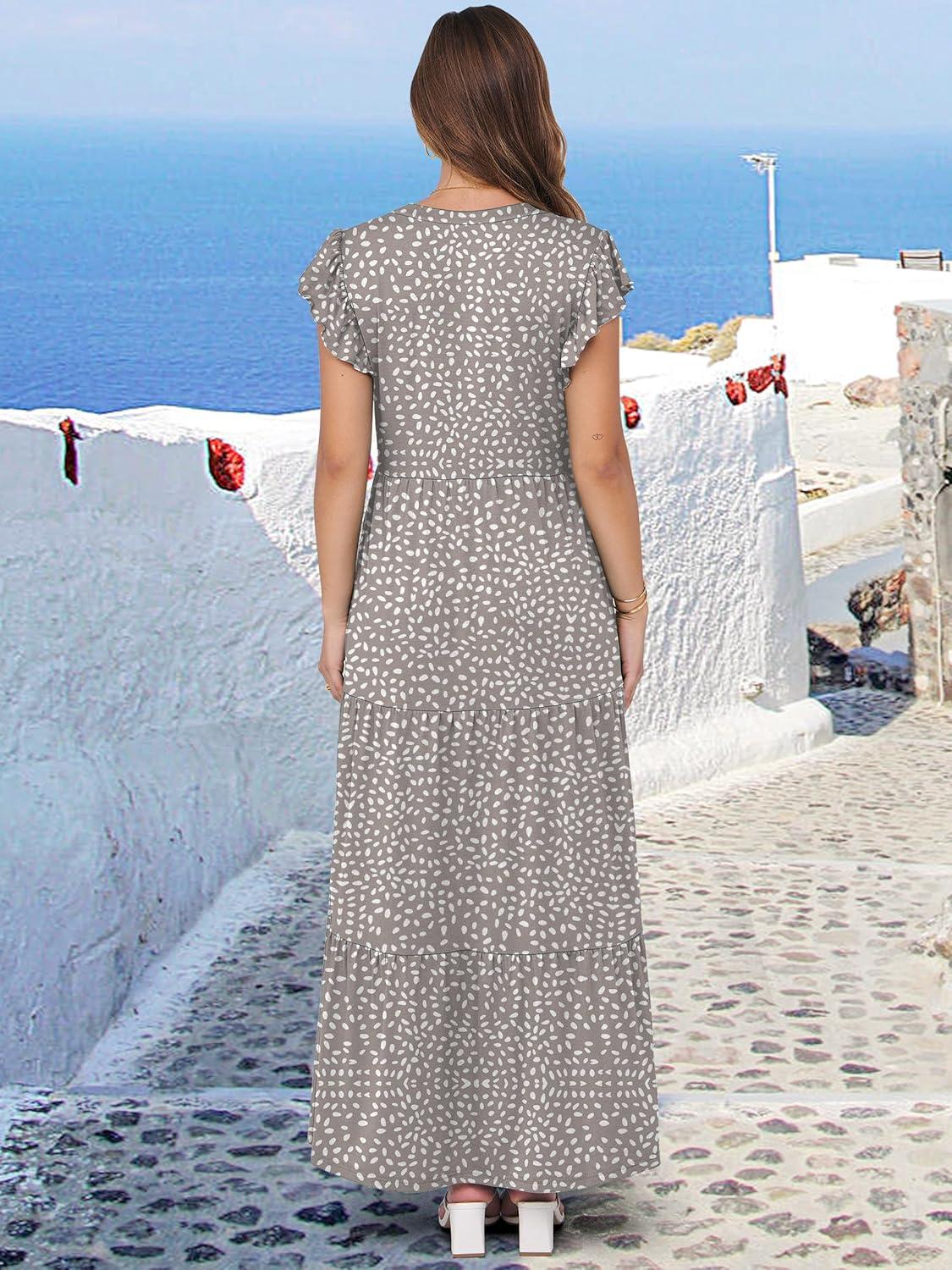 ANRABESS Womens Summer Casual Maxi Dress V Neck Ruffle Sleeve Long Dresses Fashion Flowy Tiered Boho Beach Vacation Sundress(Khaki Polka Dot)