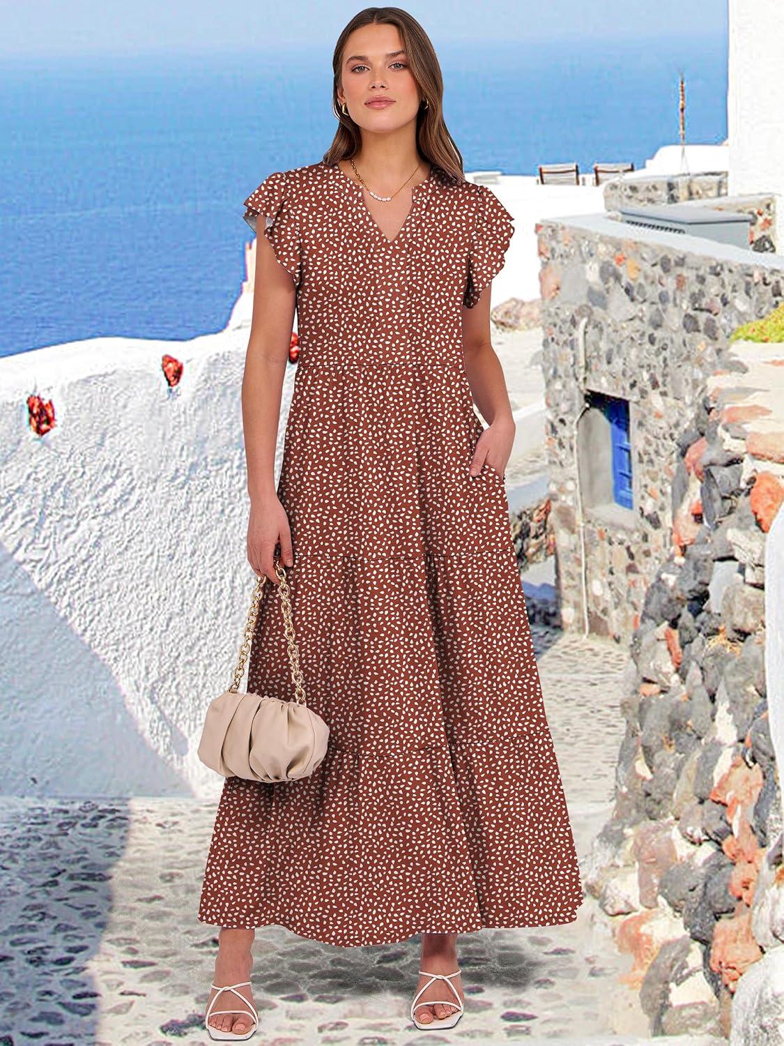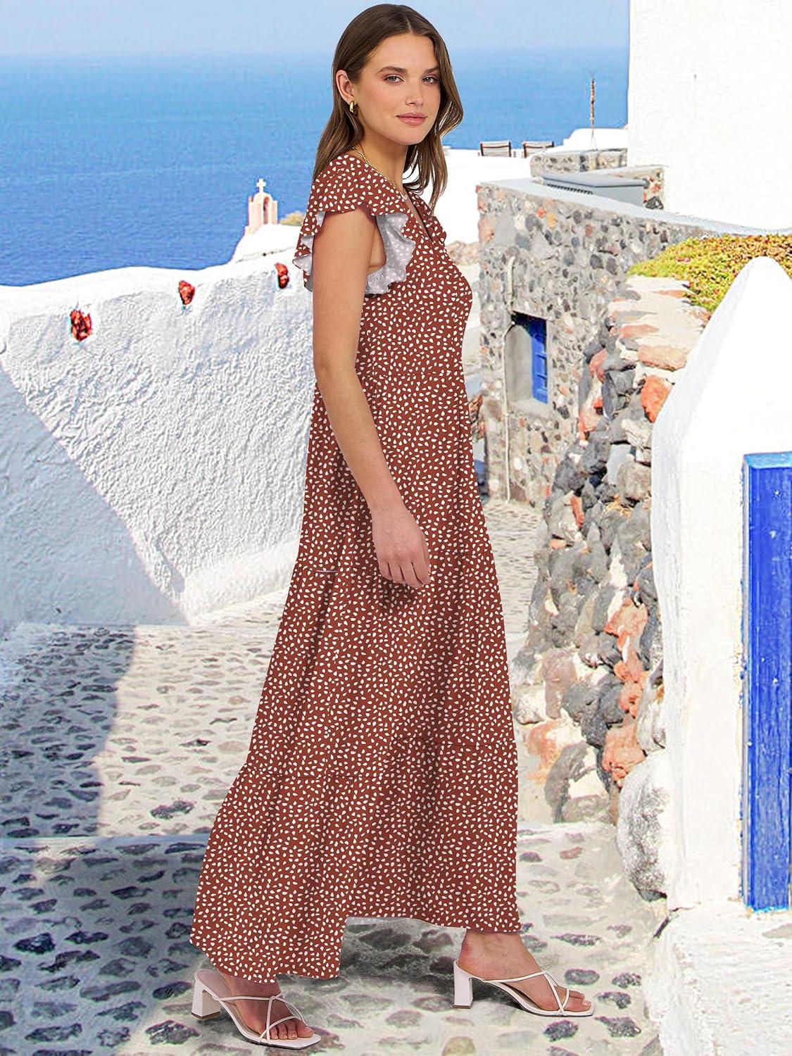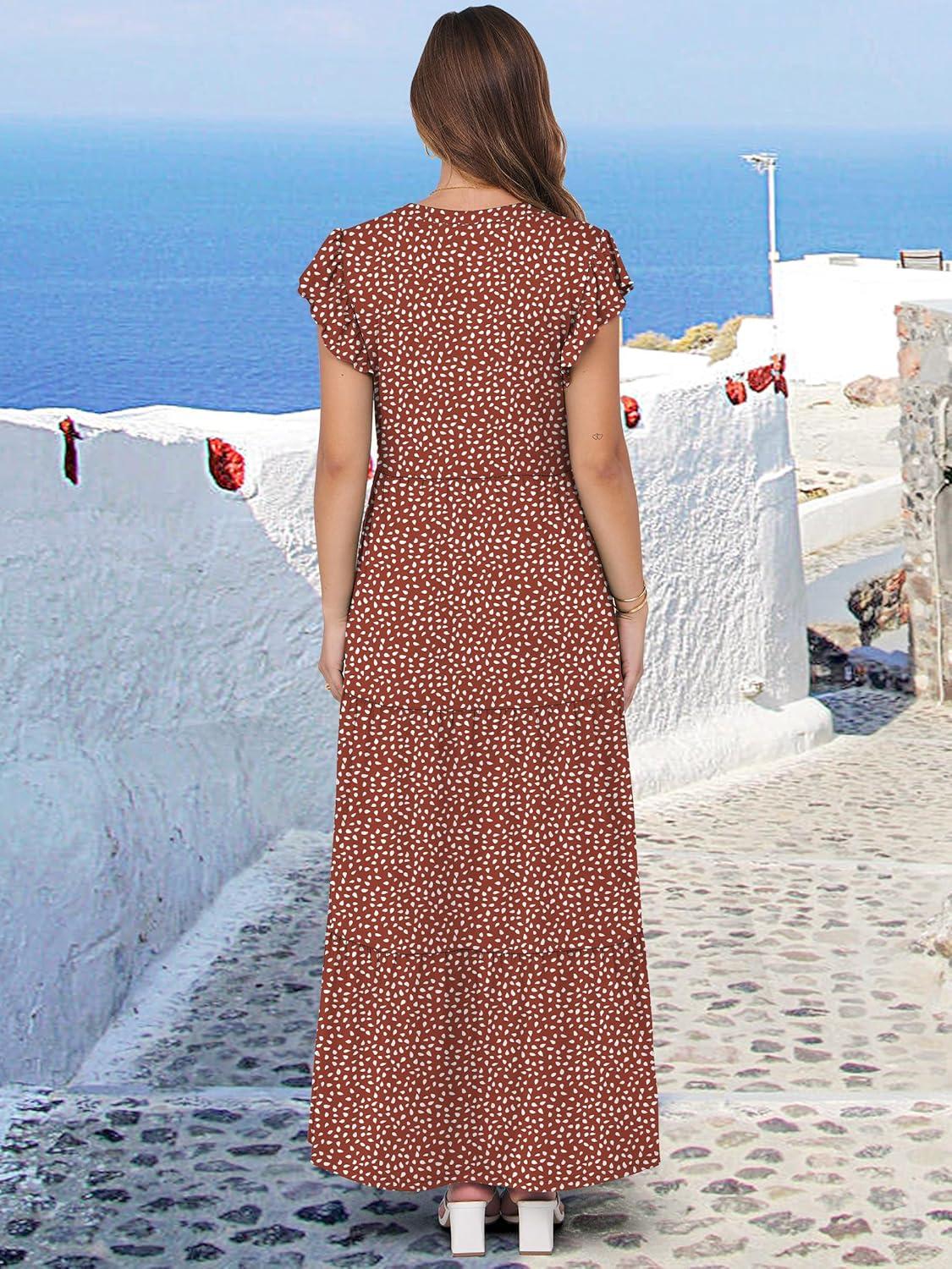 ANRABESS Womens Summer Casual Maxi Dress V Neck Ruffle Sleeve Long Dresses Fashion Flowy Tiered Boho Beach Vacation Sundress(Rust Red White Dot)