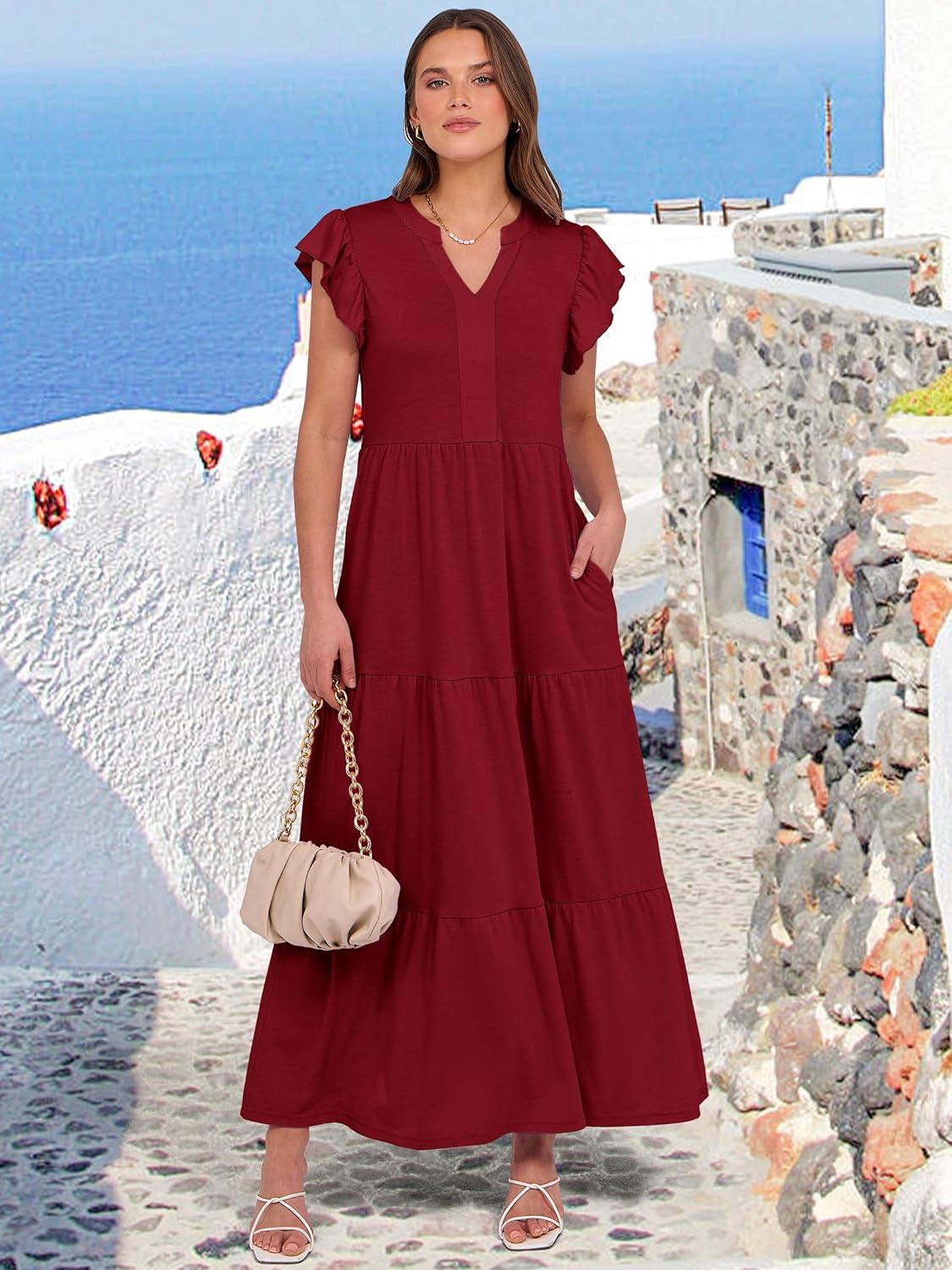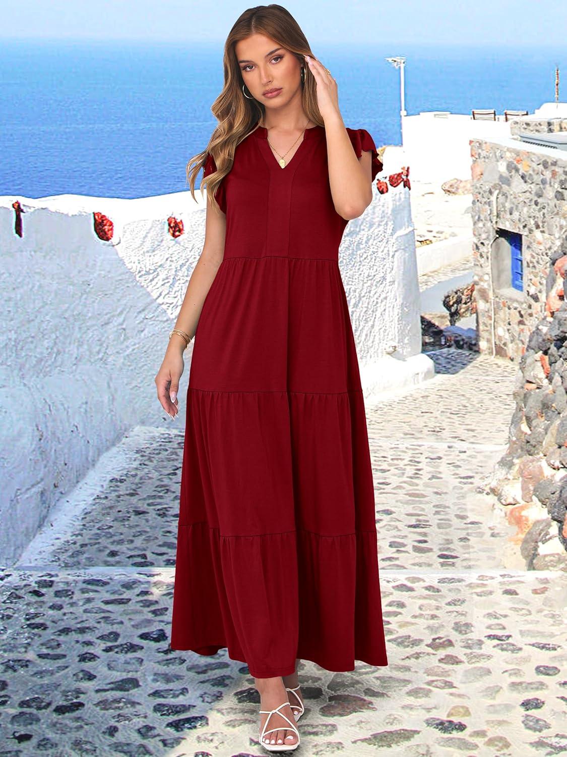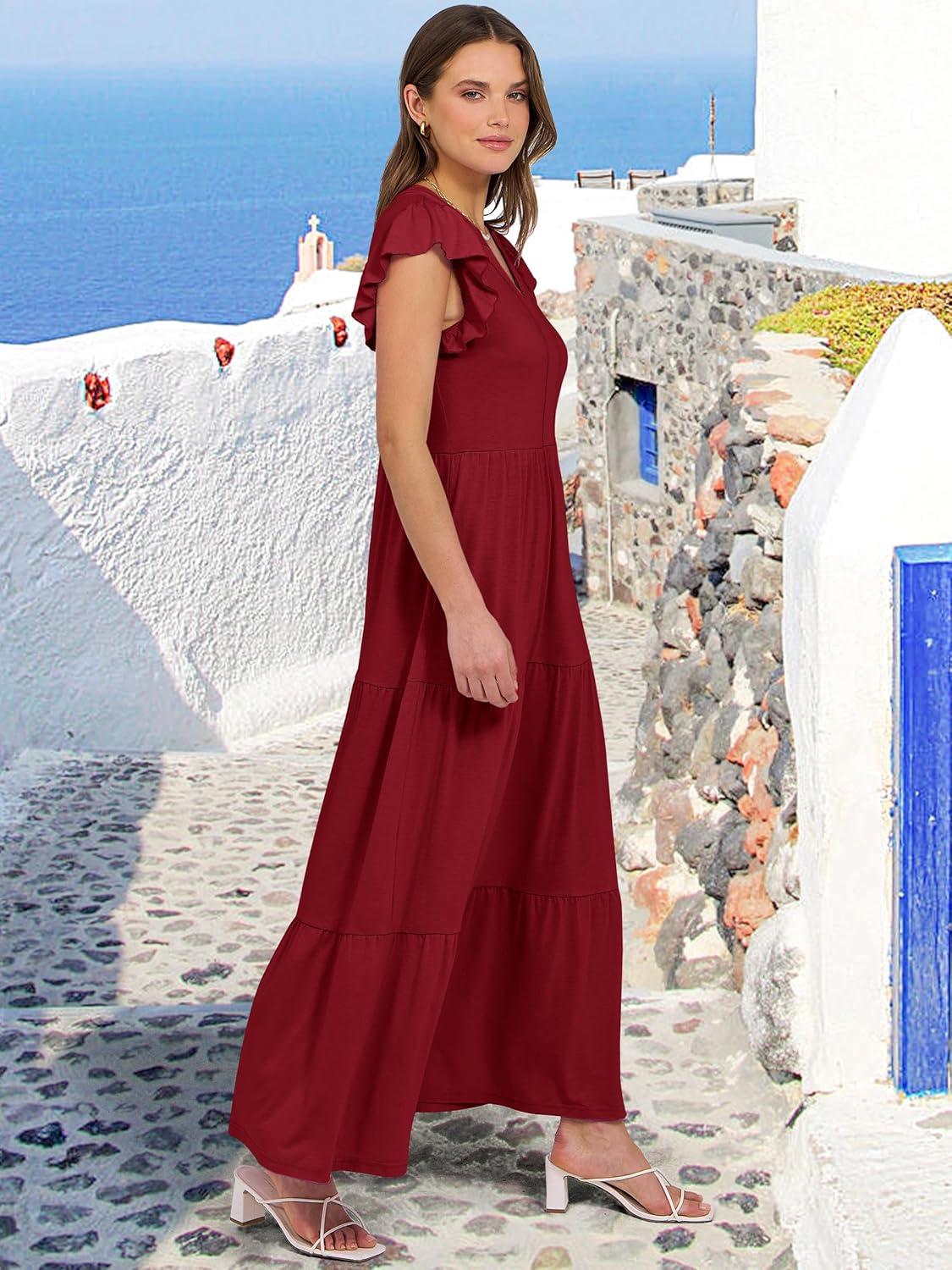 ANRABESS Womens Summer Casual Maxi Dress V Neck Ruffle Sleeve Long Dresses Fashion Flowy Tiered Boho Beach Vacation Sundress(Wine Red)