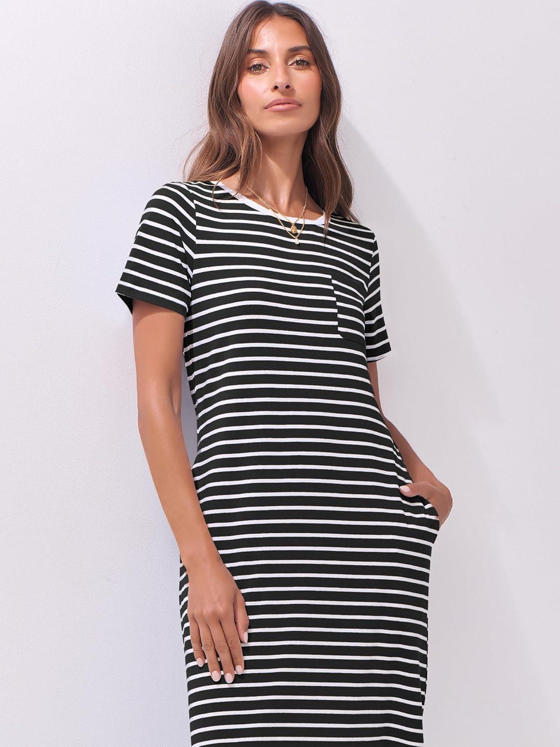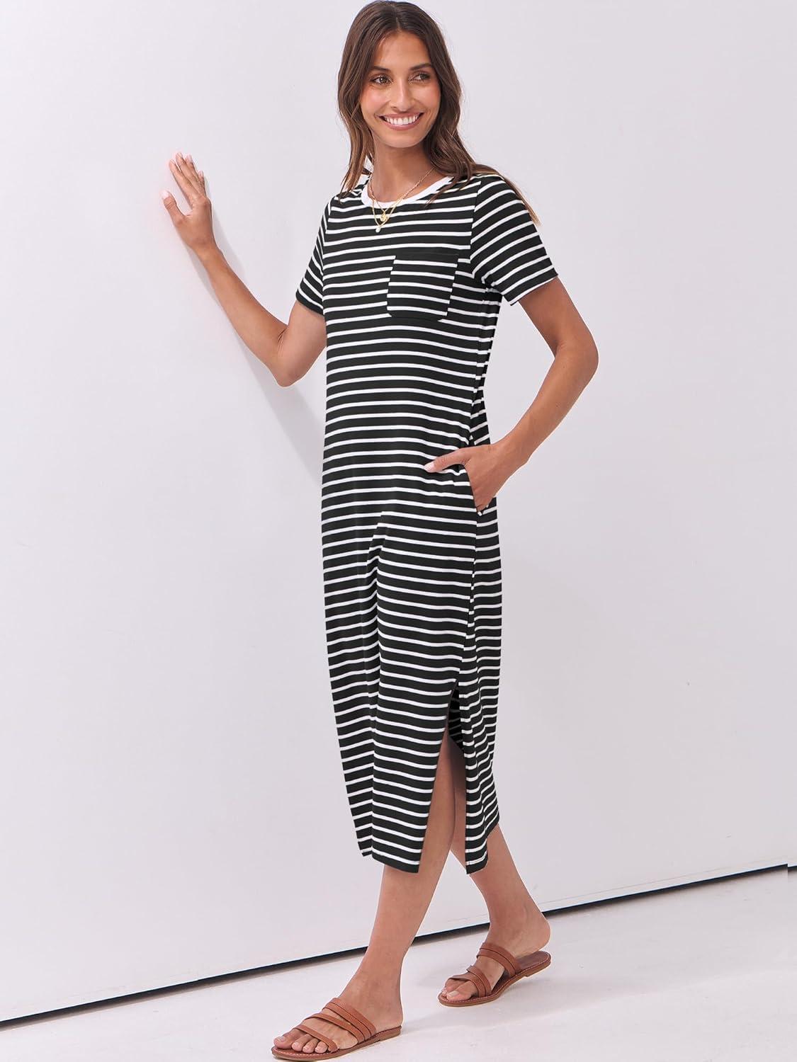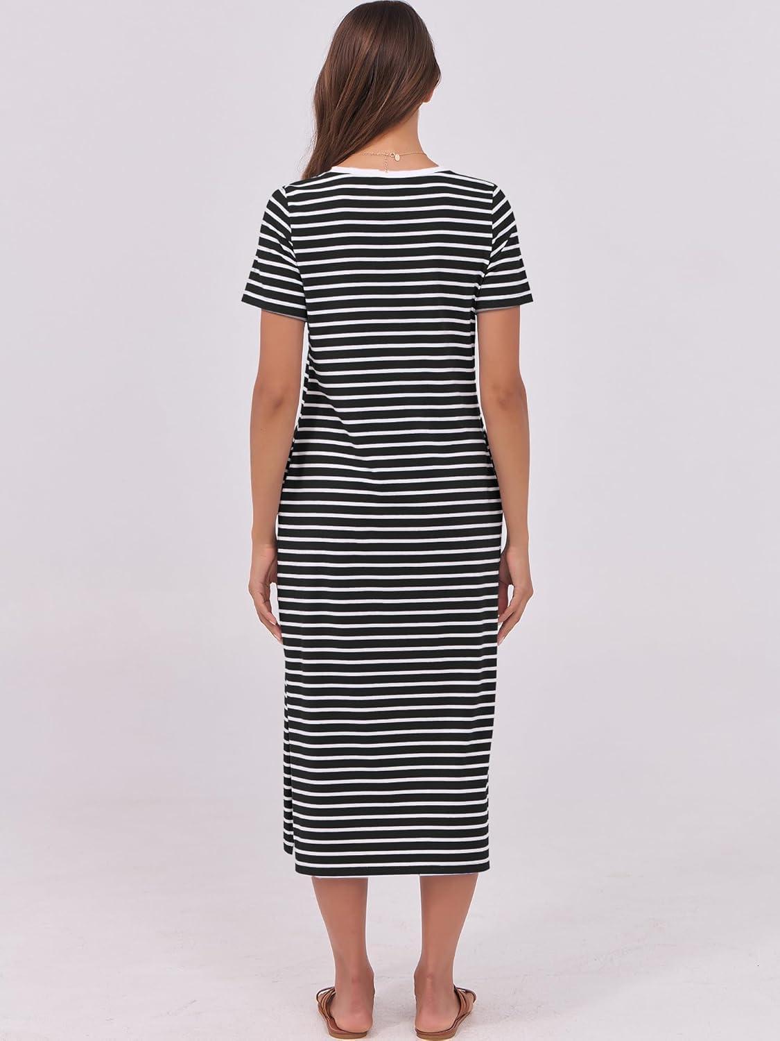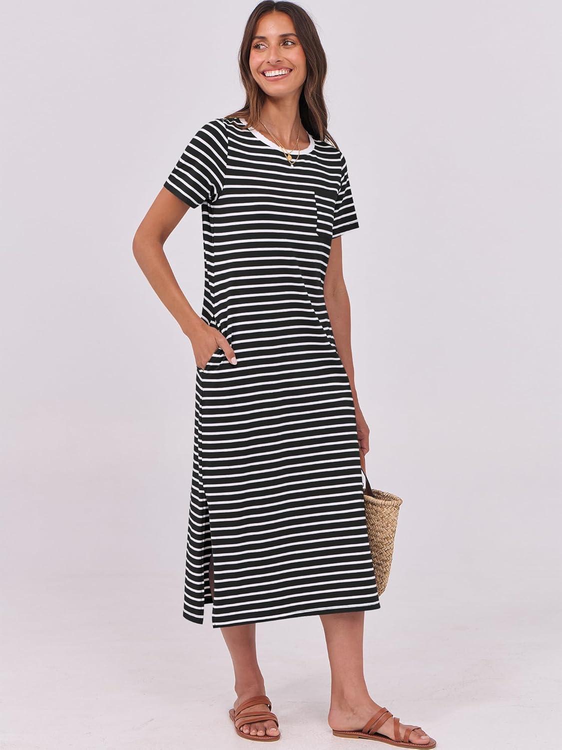 ANRABESS Womens Summer Casual Midi Dress Short Sleeve Crewneck T Shirt Long Dresses Split Stripe Beach Vacation Travel Outfit(Black White Stripe)