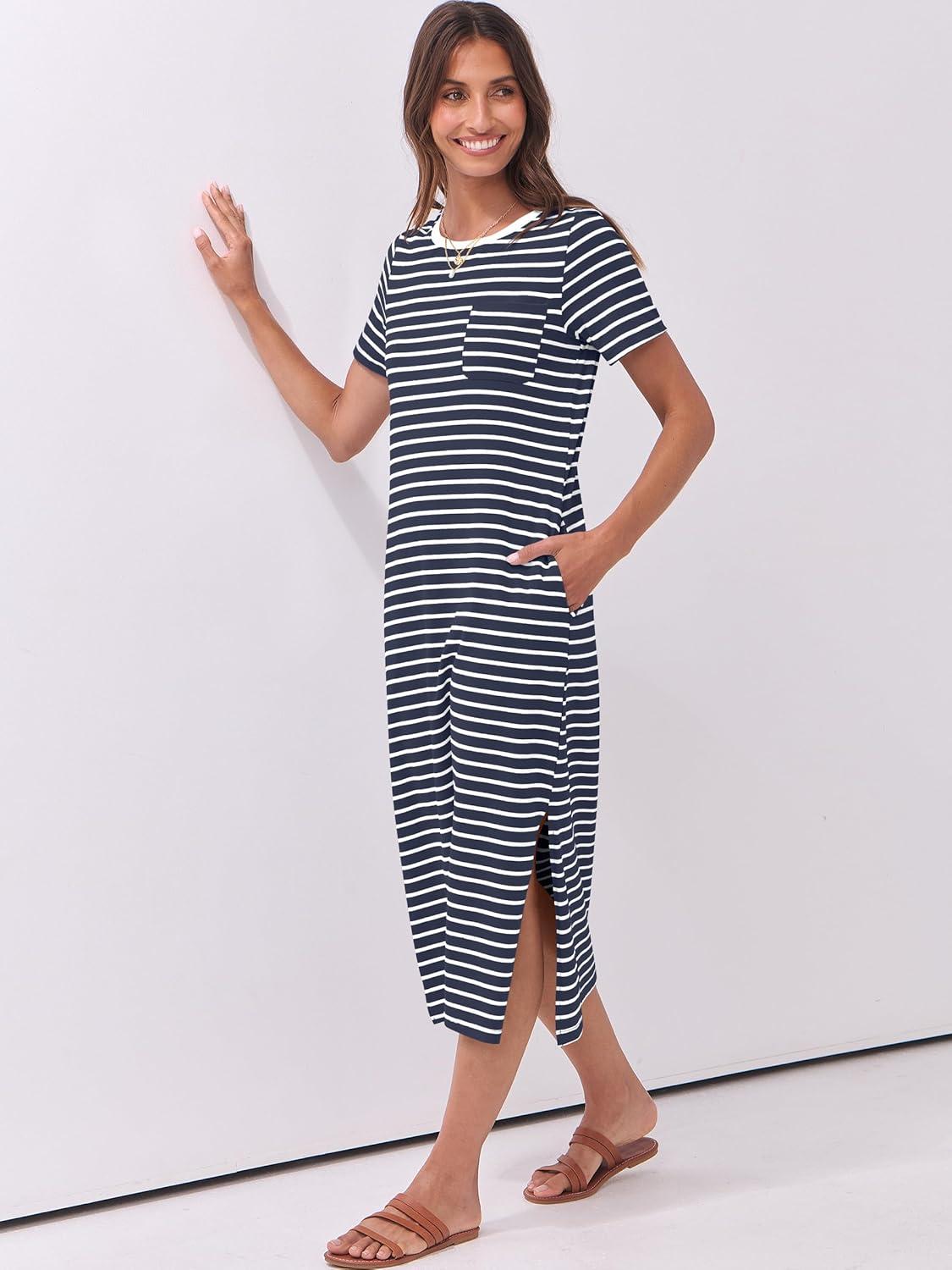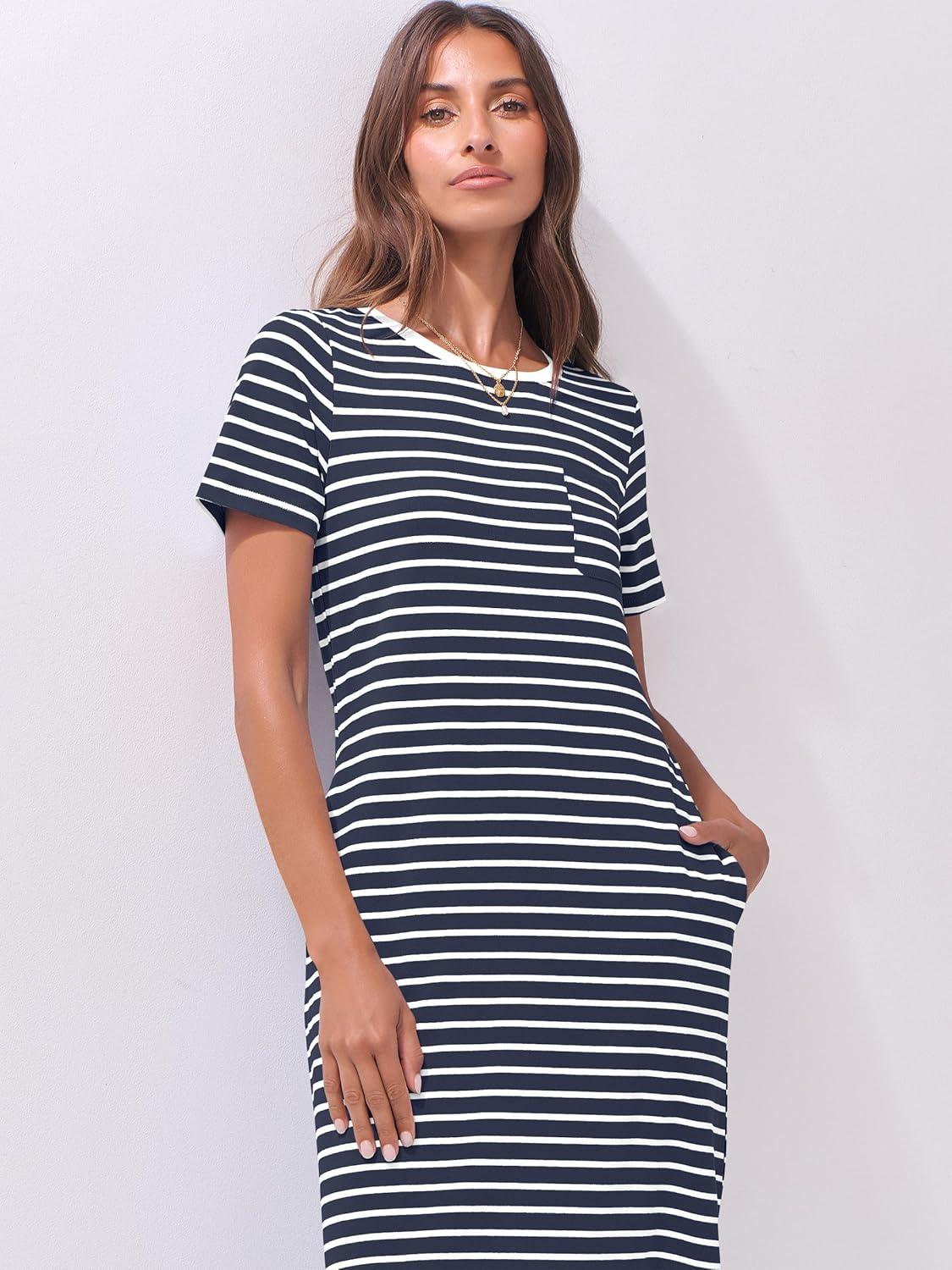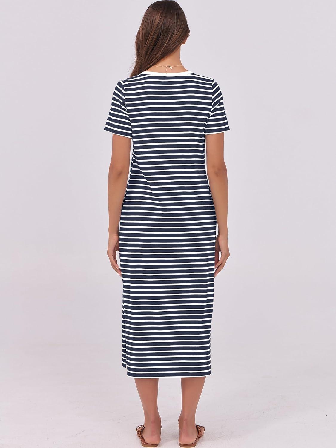 ANRABESS Womens Summer Casual Midi Dress Short Sleeve Crewneck T Shirt Long Dresses Split Stripe Beach Vacation Travel Outfit(Blue White Stripe)